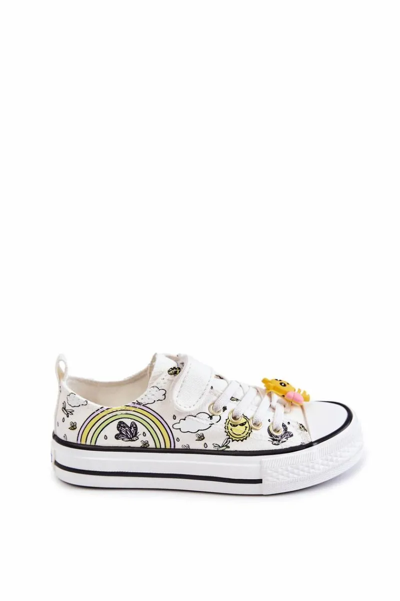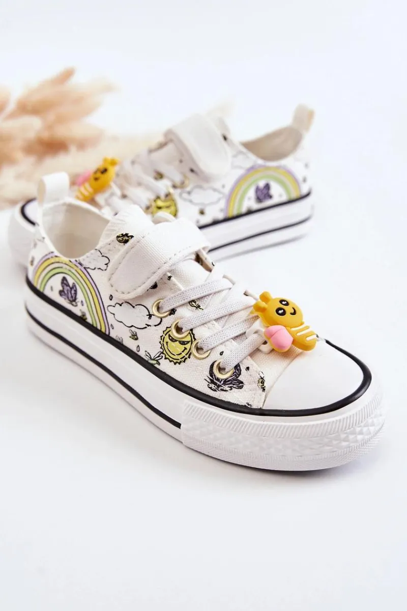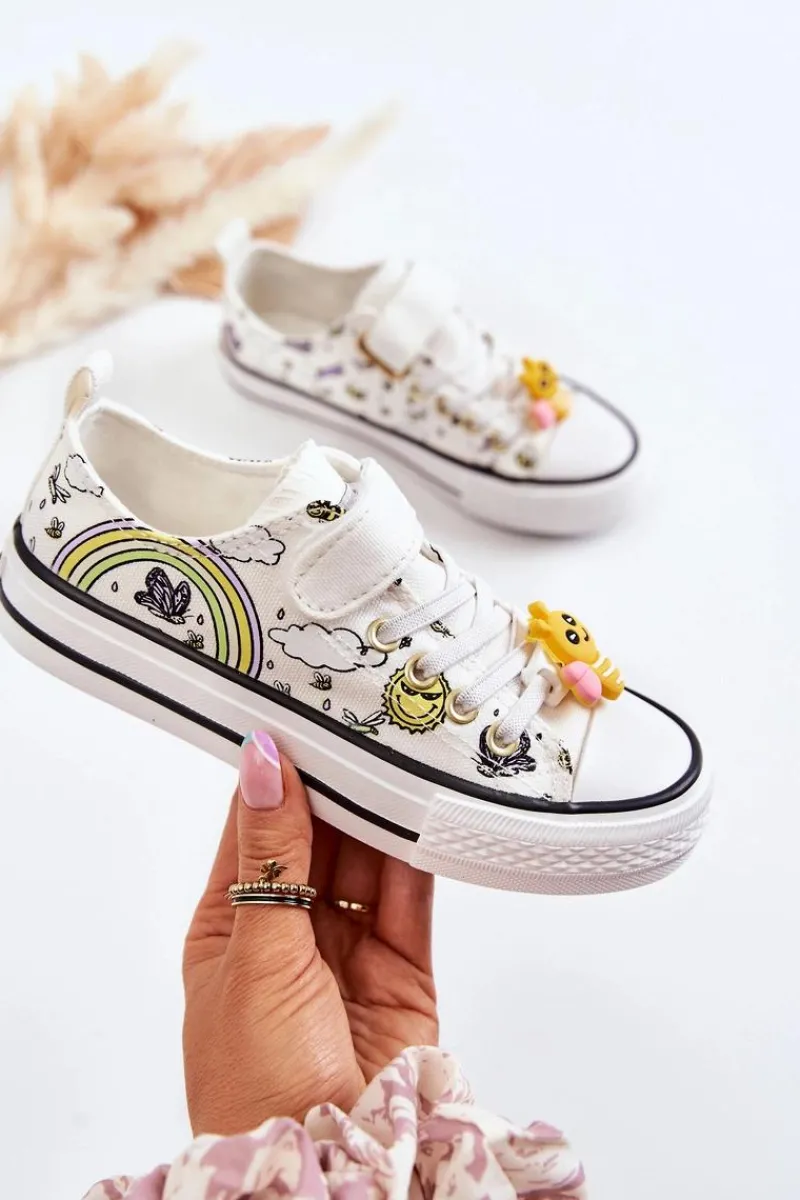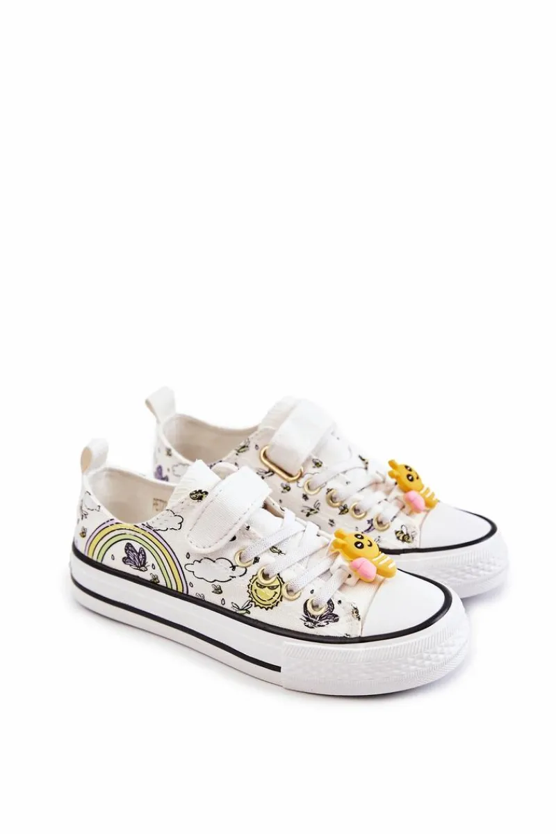 Cudowne, materiałowe trampki posiadają uroczy, gumowy element na gumkach imitujących sznurówki w kształcie pszczółki. Nosek jest wzmacniany. Antypoślizgowa podeszwa idealnie sprawdzi się podczas zabaw na podwórku. Zapinane na rzep. Miękka, materiałowa wkładka zapewni wygodę na każdym kroku. Przy wyborze rozmiaru prosimy sugerować się tabelą rozmiarów.