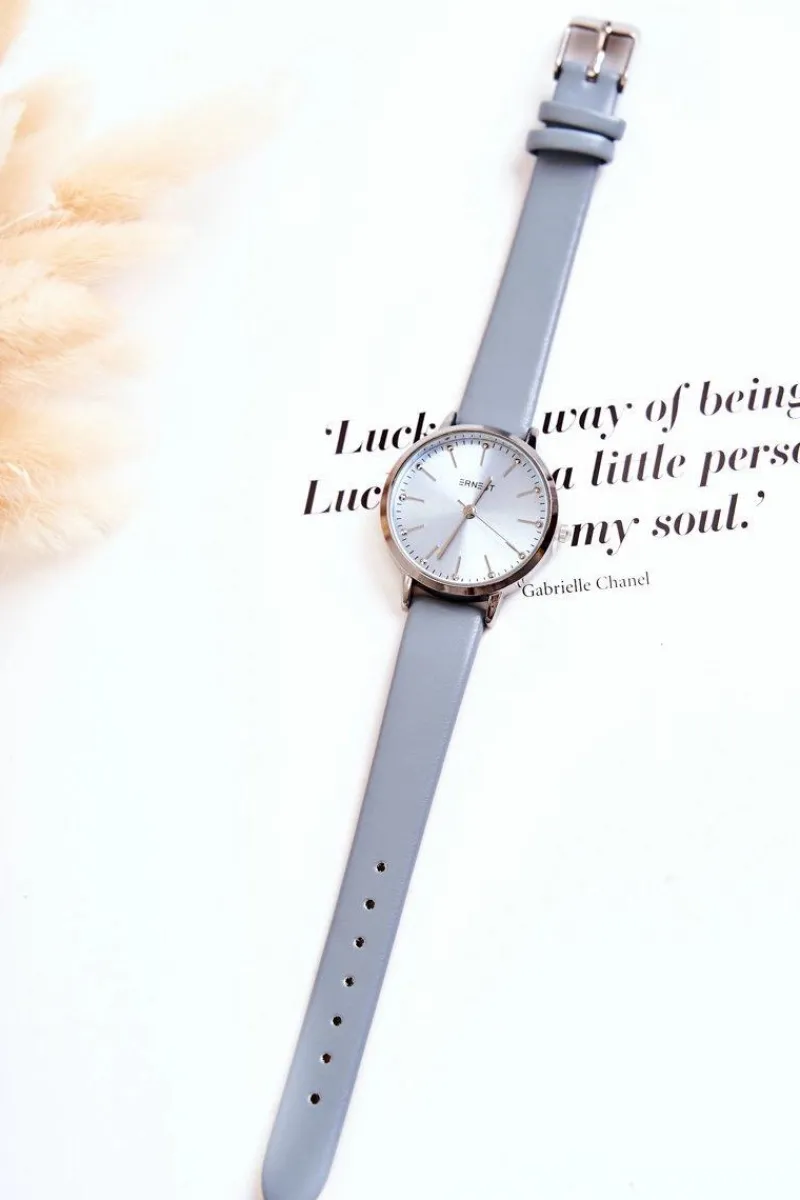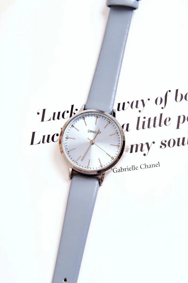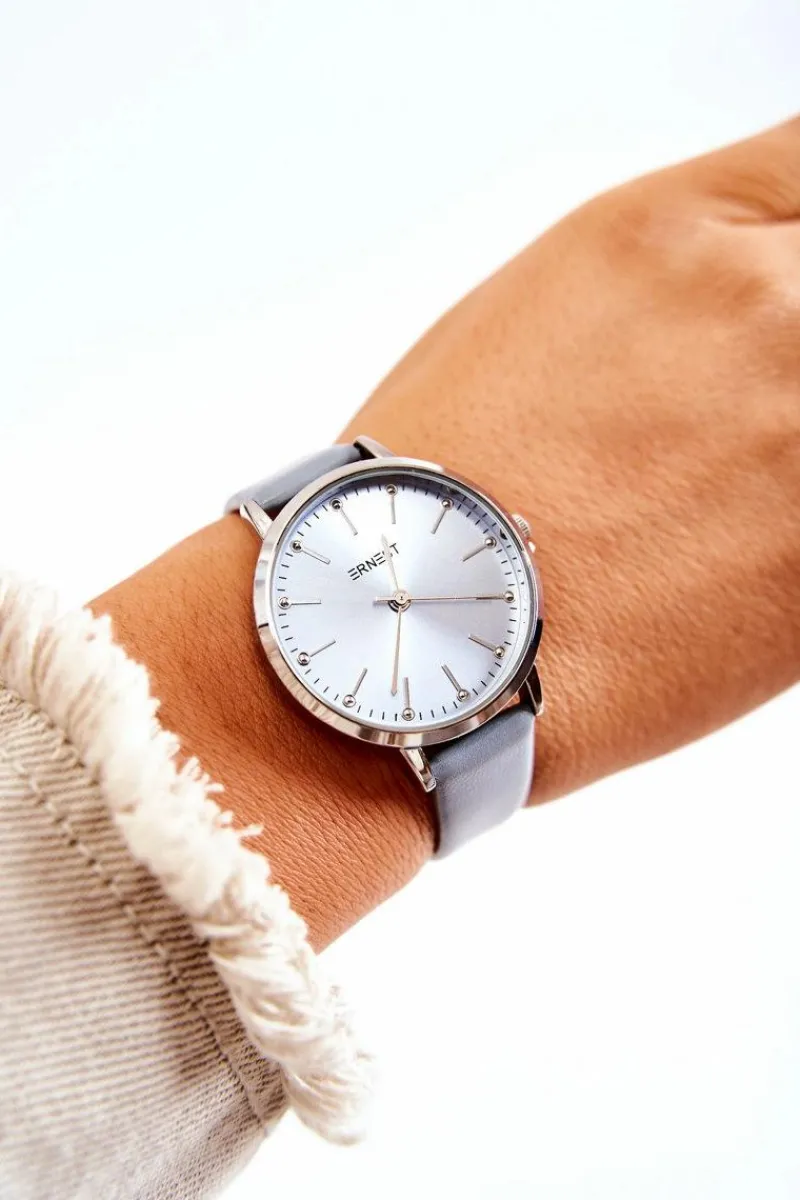 Zegarek Ernest to model dla każdej kobiety, która ceni sobie eleganckie i modne dodatki. Zegarek posiada regulowany pasek ze skóry ekologicznej. Zapinany na sprzączkę. Tarcza w odcieniu paska zegarka. Wykonany z nierdzewnej stali. Nie zawiera niklu.
