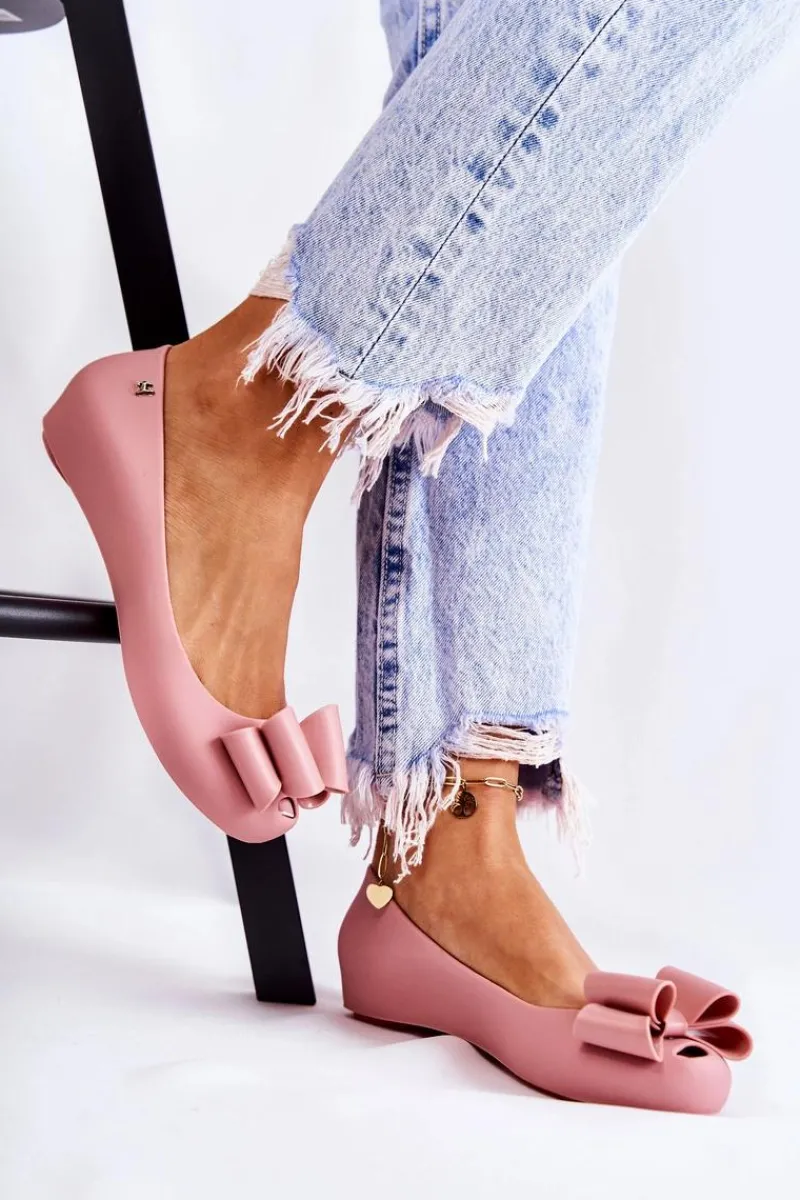 Wyjątkowe baleriny z ozdobną kokardą na przodzie. Dodatkowo na zaokrąglonym nosku znajduje się delikatne wycięcie. Buty zostały wykonane z gumowego tworzywa. Baleriny osadzone są na płaskim obcasie z antypoślizgową podeszwą. Miękka wkładka zapewni komfort podczas użytkowania. Z boku cholewki znajduje się ozdobny element. Te baleriny świetnie sprawdzą się na różnego rodzaju uroczystościach. Przy wyborze rozmiaru prosimy sugerować się tabelą rozmiarów.