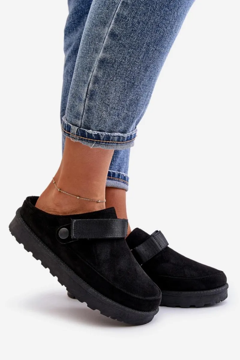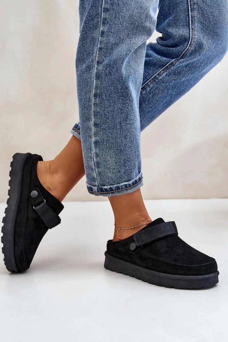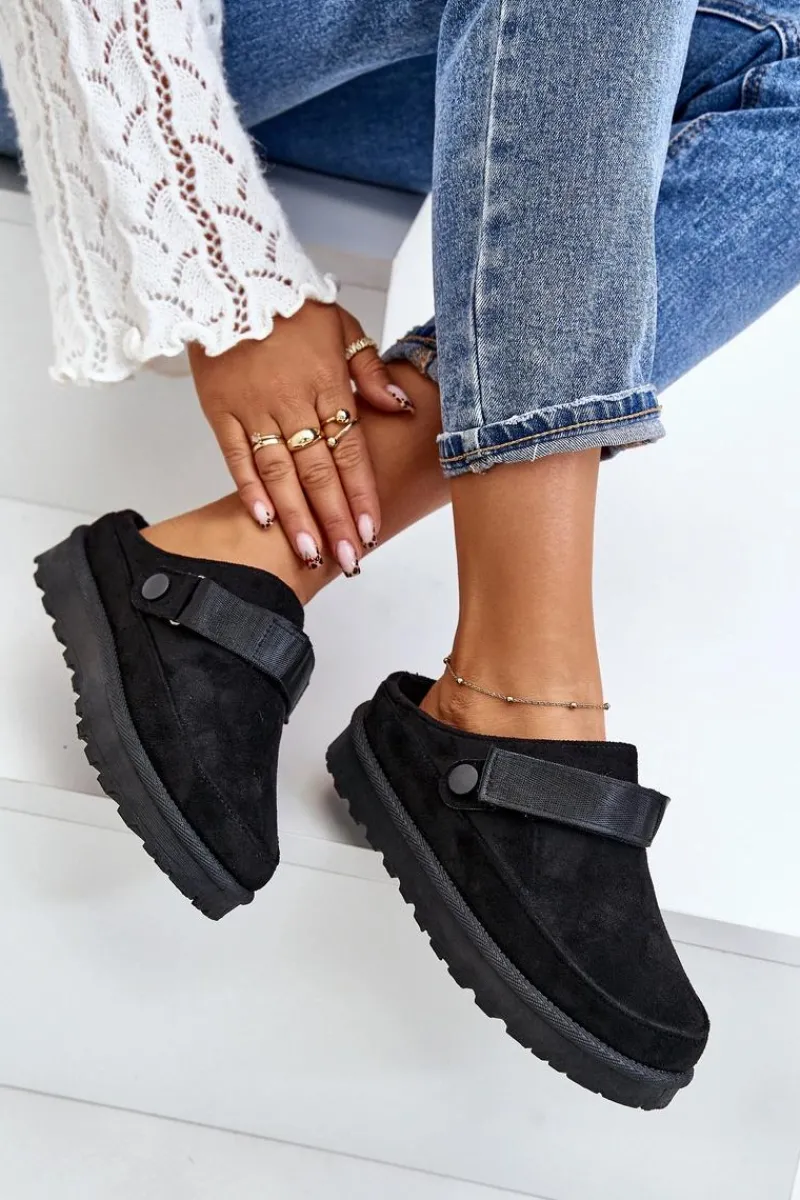 Damskie klapki wykonane z eko zamszu. Osadzone na platformie. Wnętrze ocieplone przyjemnym futerkiem, co zapewnia komfort w chłodniejsze dni. Dodatkowo posiadają ruchomy pasek zapinany na rzep, który stabilizuje piętę i umożliwia idealne dopasowanie. Idealne na co dzień, łączą styl z funkcjonalnością. Przy wyborze rozmiaru prosimy sugerować się tabelą rozmiarów.
