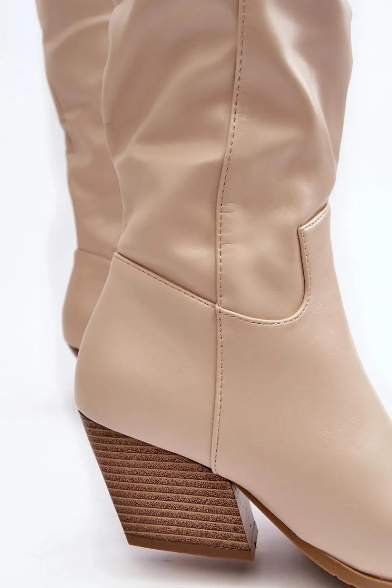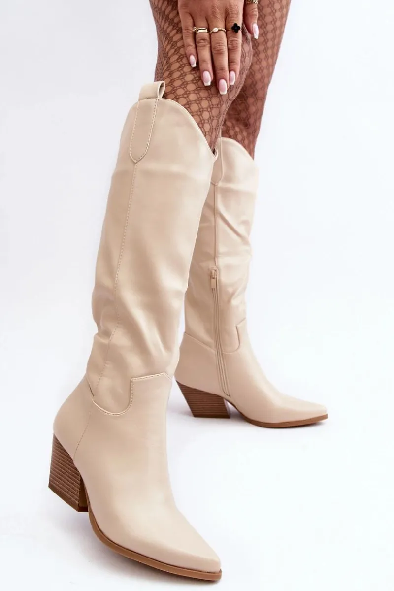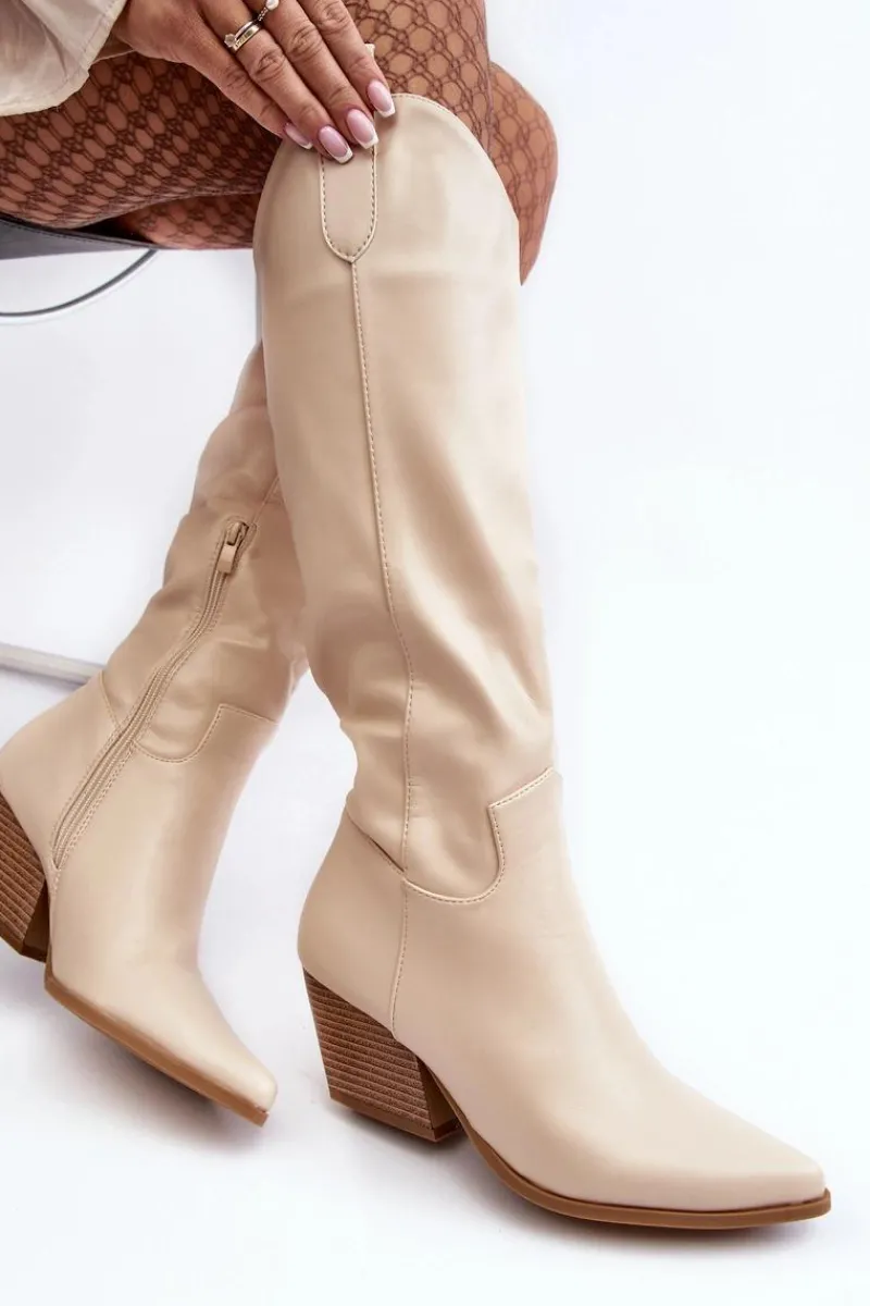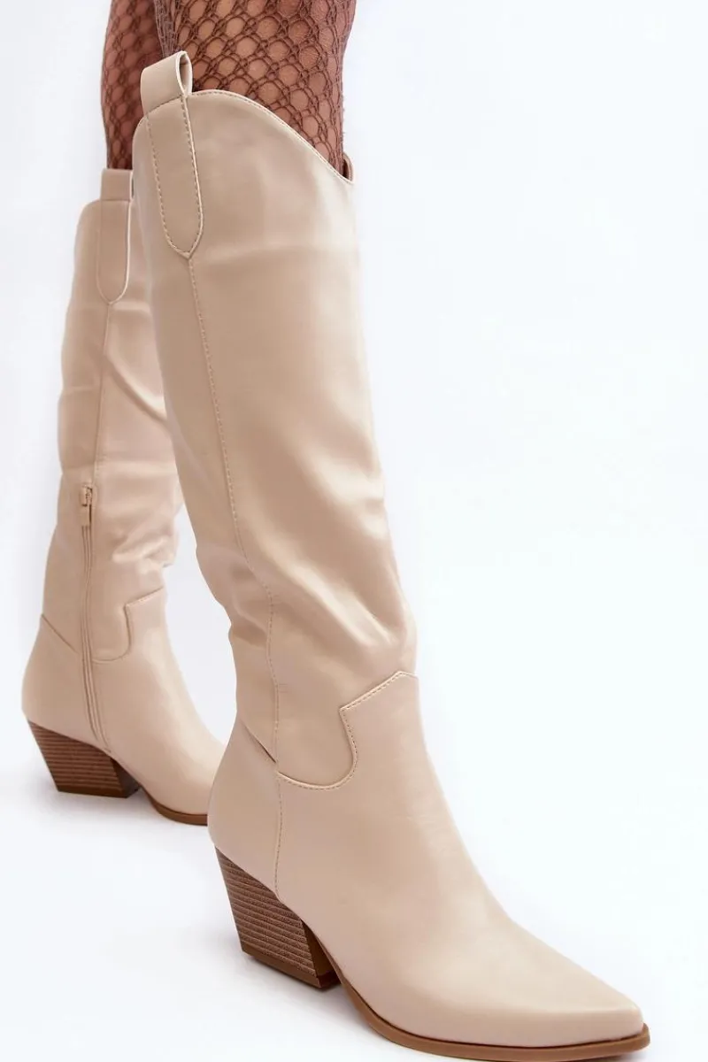 Kozaki damskie z cholewką do kolana. Osadzone na niskim obcasie w postaci słupka. Wykonane z eko skóry. Wsuwane i zapinane częściowo na suwak z boku. Noski w szpic optycznie wysmuklą nogi. Cholewka wzbogacona przeszyciami. Ten model skradnie serce niejednej miłośniczce kozaków w stylu kowbojek! Koniecznie powinnaś je mieć! Przy wyborze rozmiaru prosimy sugerować się tabelą rozmiarów.