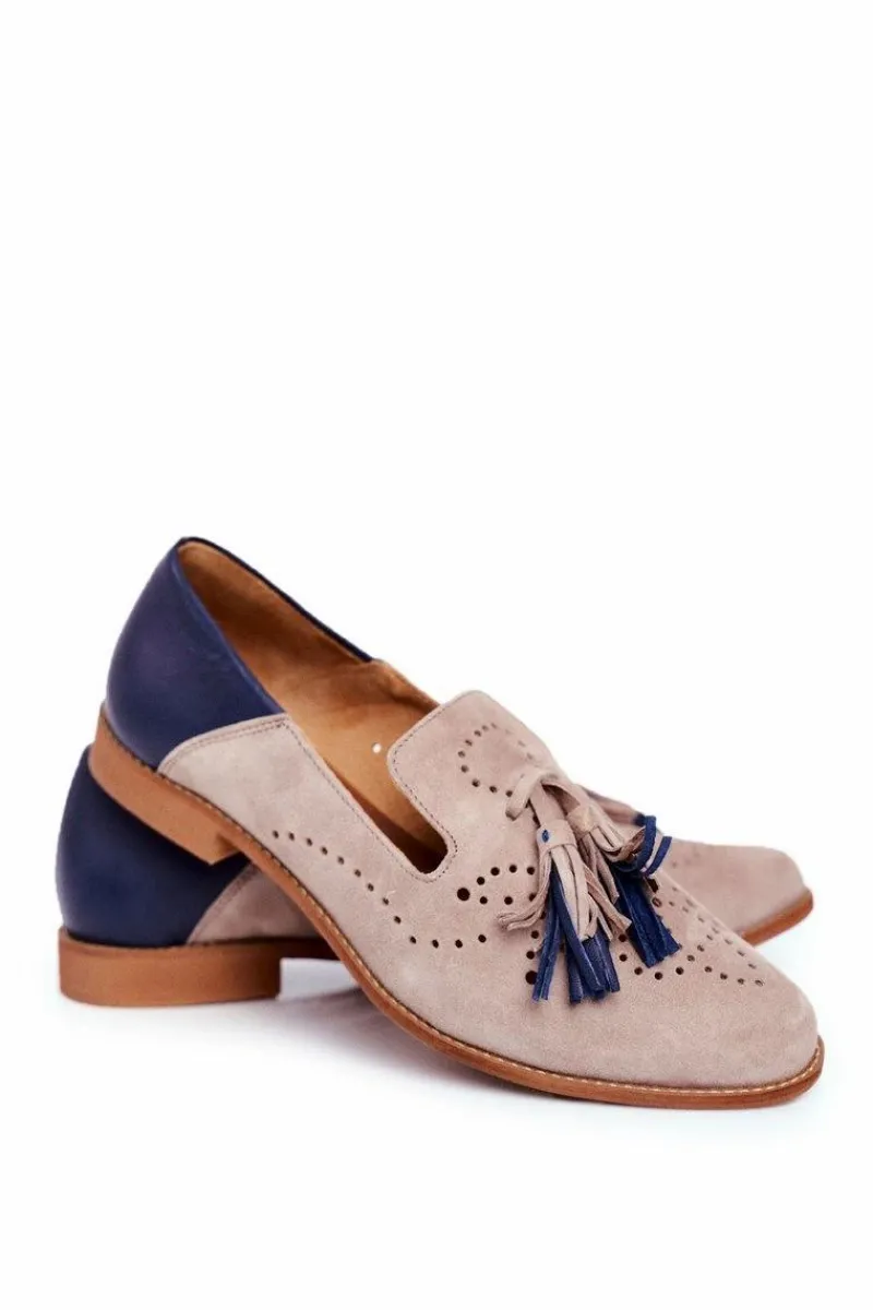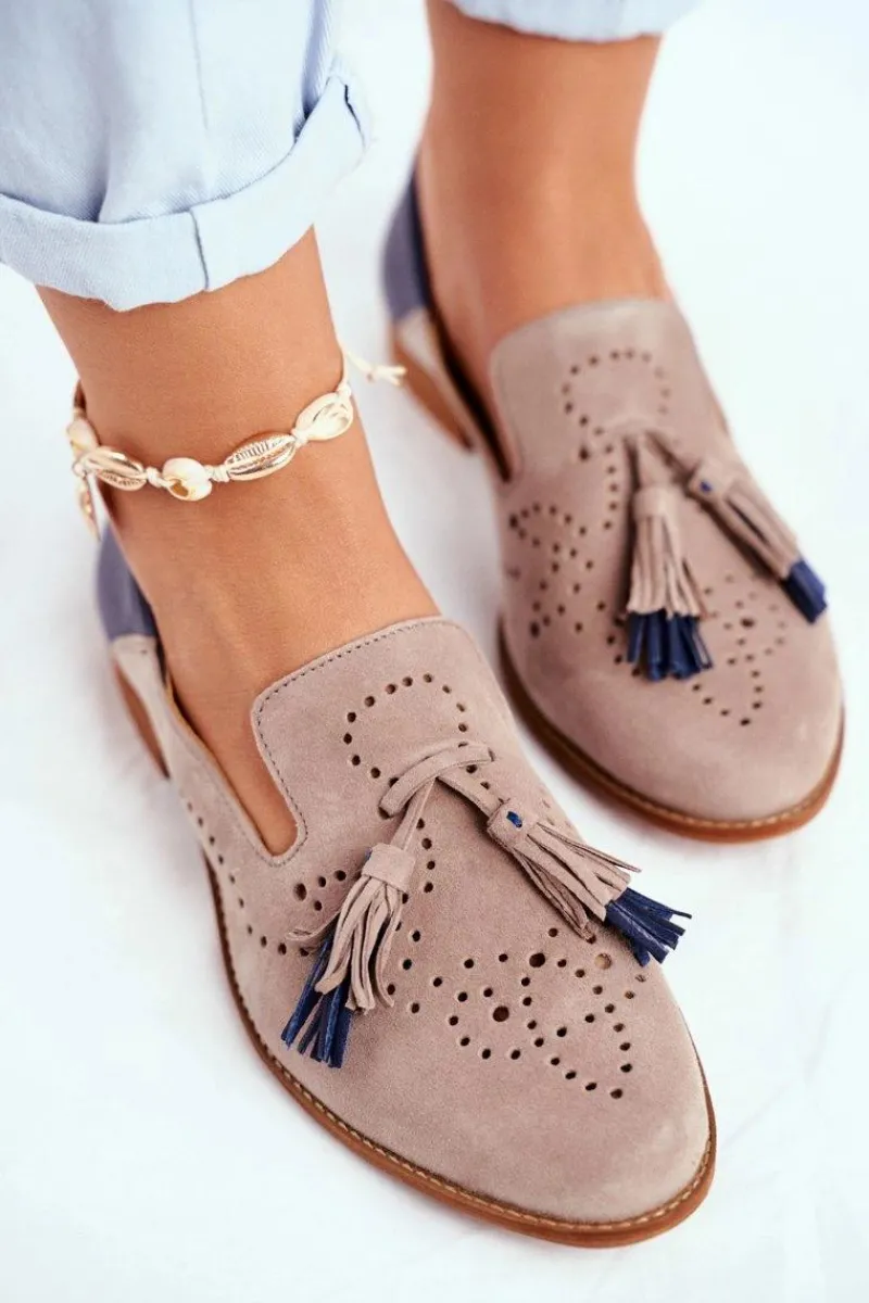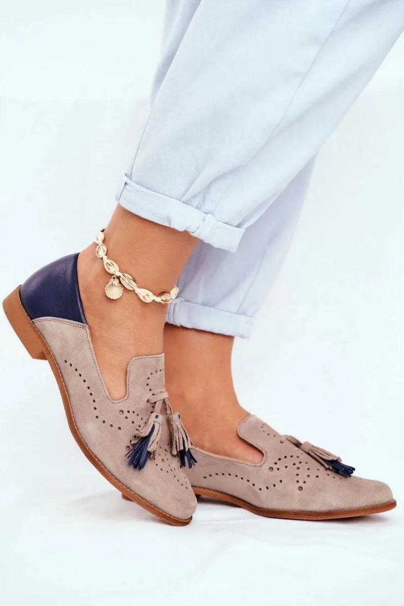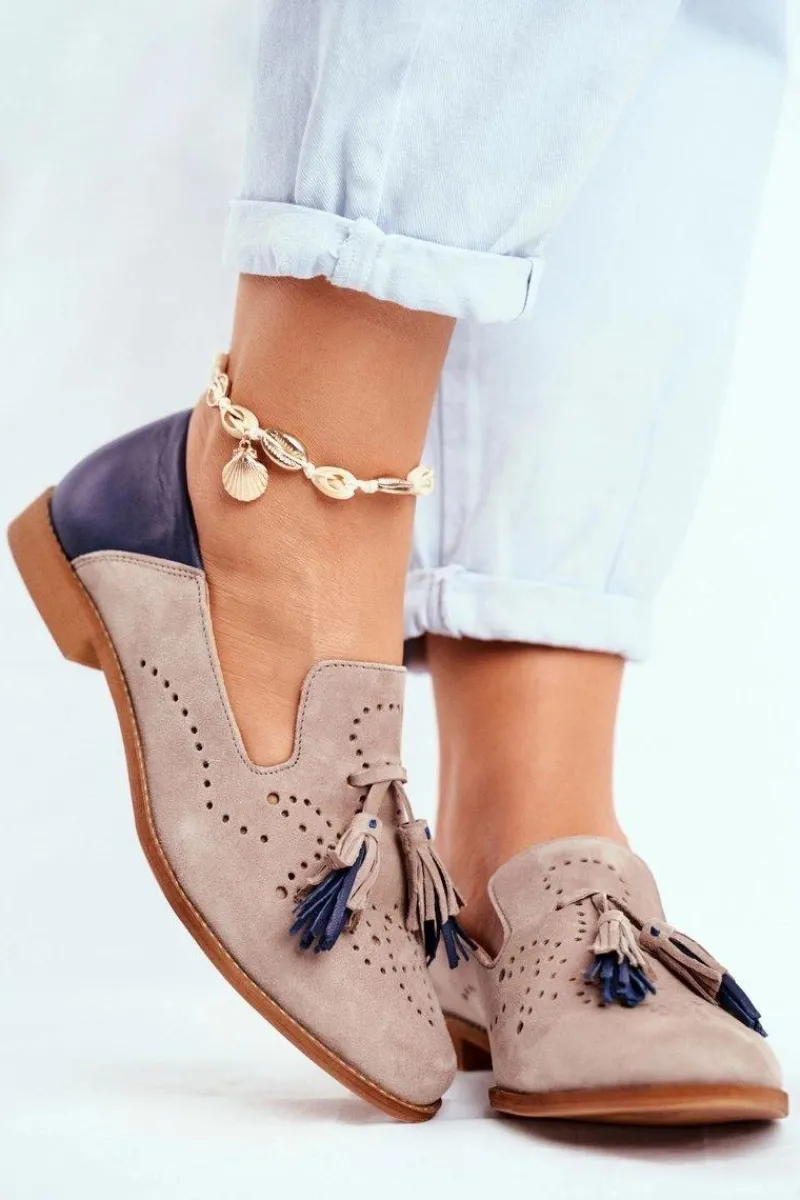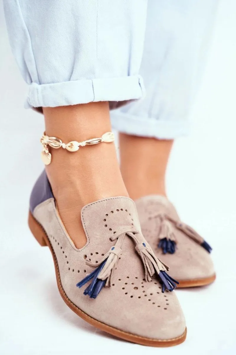 Clearance Damskie Półbuty Skórzane Mokasyny Beżowe 04484-04/00-5 Damskie Półbuty Skórzane