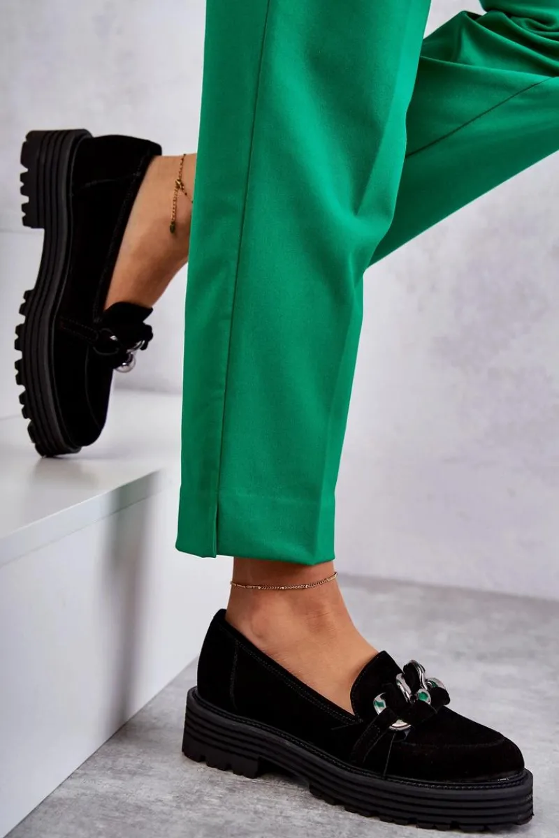Klasyczne półbuty zostały wykonane z wysokiej jakości zamszowej skóry naturalnej. Na przodzie charakterystyczne zdobienie w postaci łańcucha z przeplatającym się paskiem z naturalnego zamszu. Buty te posiadają platformę oraz płaski obcas. Podeszwa ze żłobieniami świetnie odizoluje od nierównego podłoża. Świetny model do wielu stylizacji! Wygodne, a zarazem modne. Koniecznie musisz je mieć! Przy wyborze rozmiaru prosimy sugerować się tabelą rozmiarów.