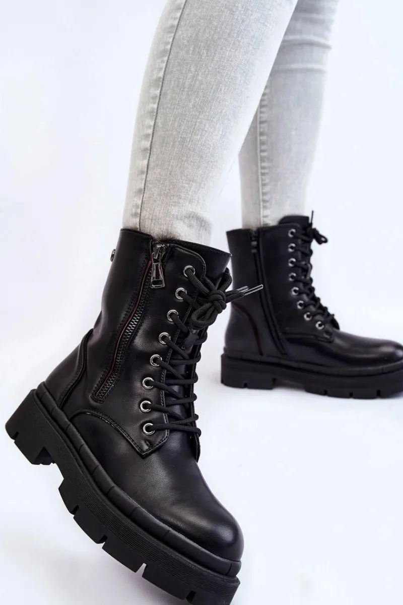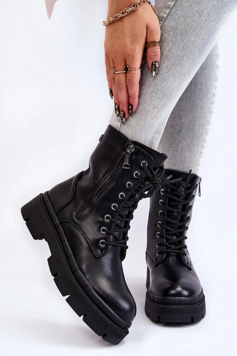 Klasyczne, damskie trapery zostały wykonane z eko skóry. Model posiada solidne sznurowanie oraz suwak. Dodatkowo po zewnętrznej stronie znajduje się ozdobny suwak. Botki osadzono na płaskim obcasie oraz podeszwie z bieżnikiem. Zapiętek jest usztywniany. Trapery nie posiadają ocieplenia. Ten klasyczny model powinien znaleźć się w Twojej szafie! Przy wyborze rozmiaru prosimy sugerować się tabelą rozmiarów.