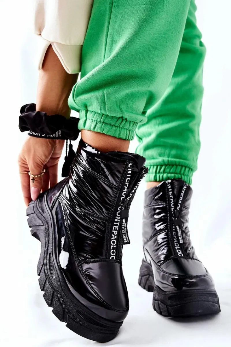 Damskie botki wykonane ze skóry ekologicznej oraz materiału tekstylnego. Zapinane z przodu cholewki na zamek. Ocieplane kocem obuwniczym.