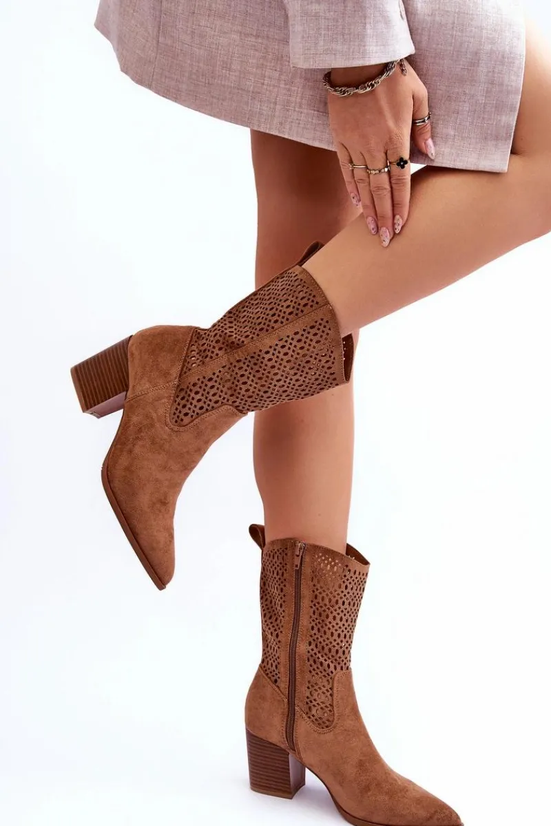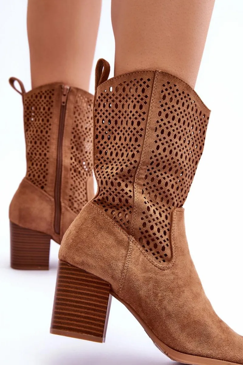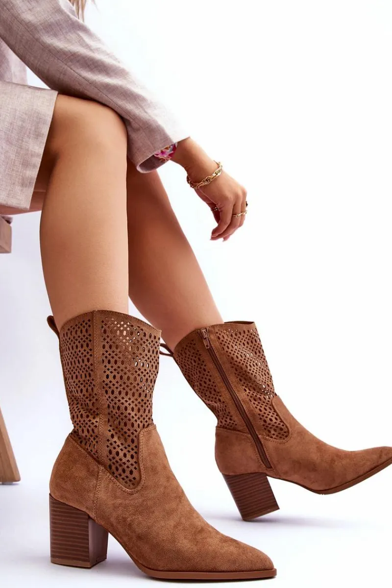Modne botki-kowbojki z wyższą cholewką. Wykonane zostały z ekologicznego zamszu z modnym, ażurowym wzorem. Materiałowa wkładka oraz usztywniany zapiętek zadbają o Twój komfort. Posiadają masywny obcas w postaci słupka. Idealnie sprawdzą się zarówno do sukienek, jak i jeansów. Przy wyborze rozmiaru prosimy sugerować się tabelą rozmiarów.