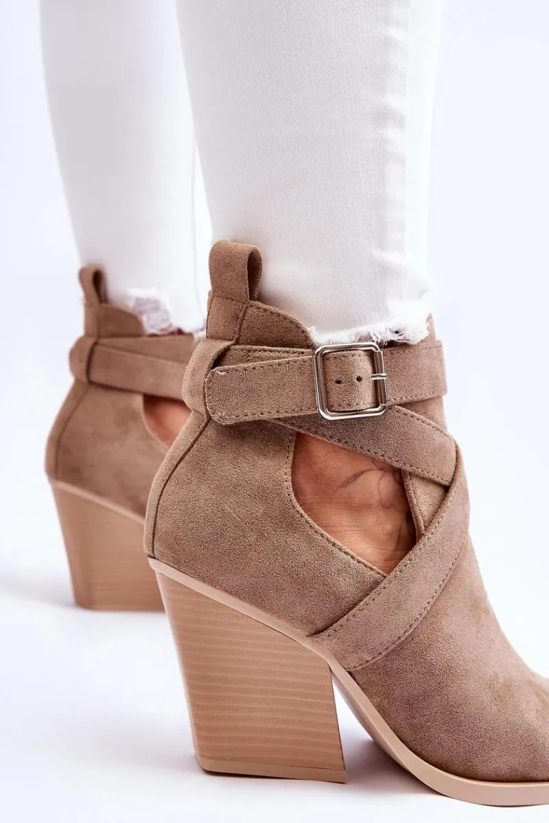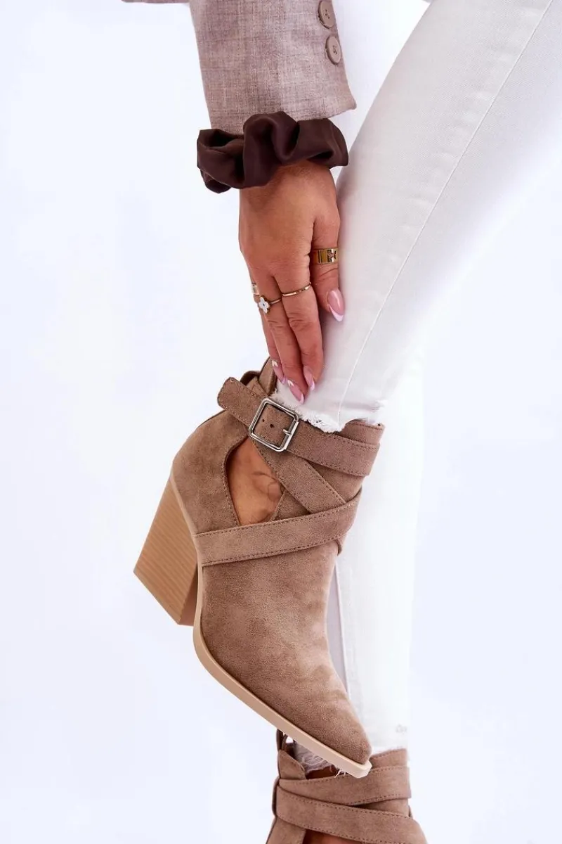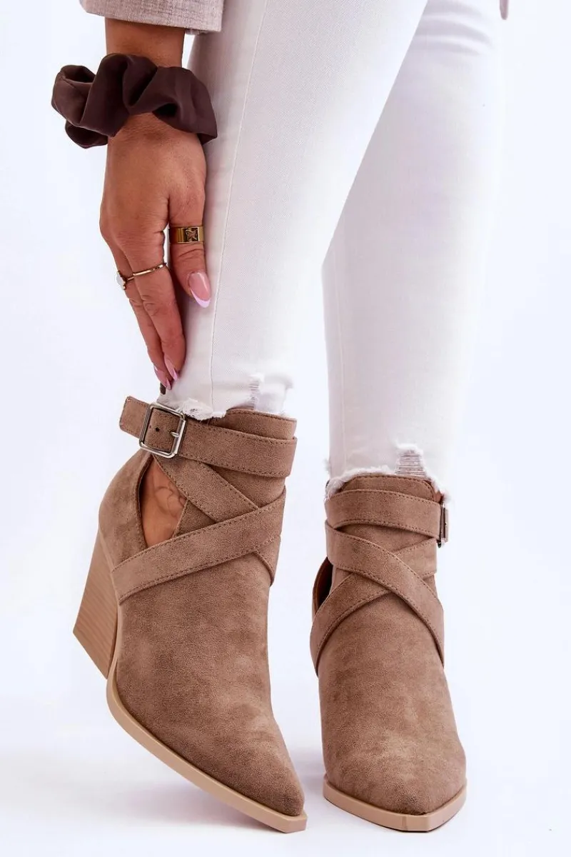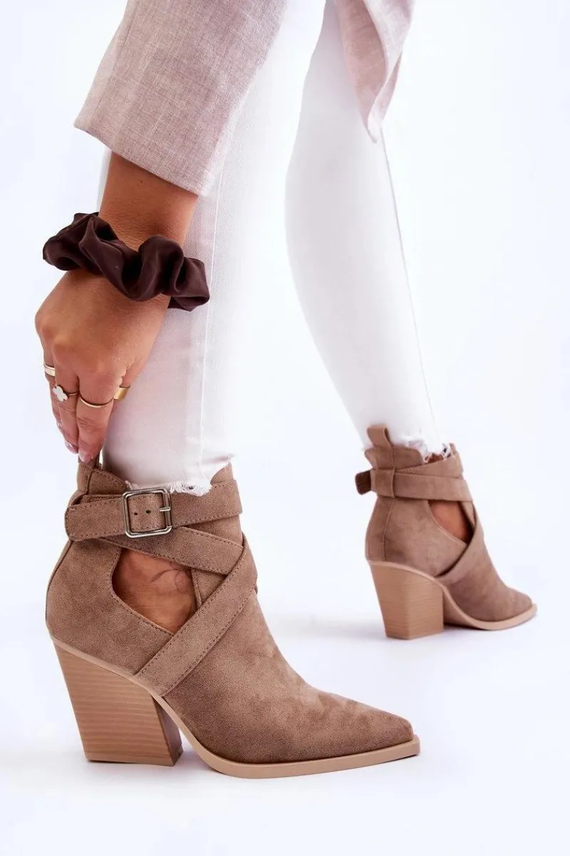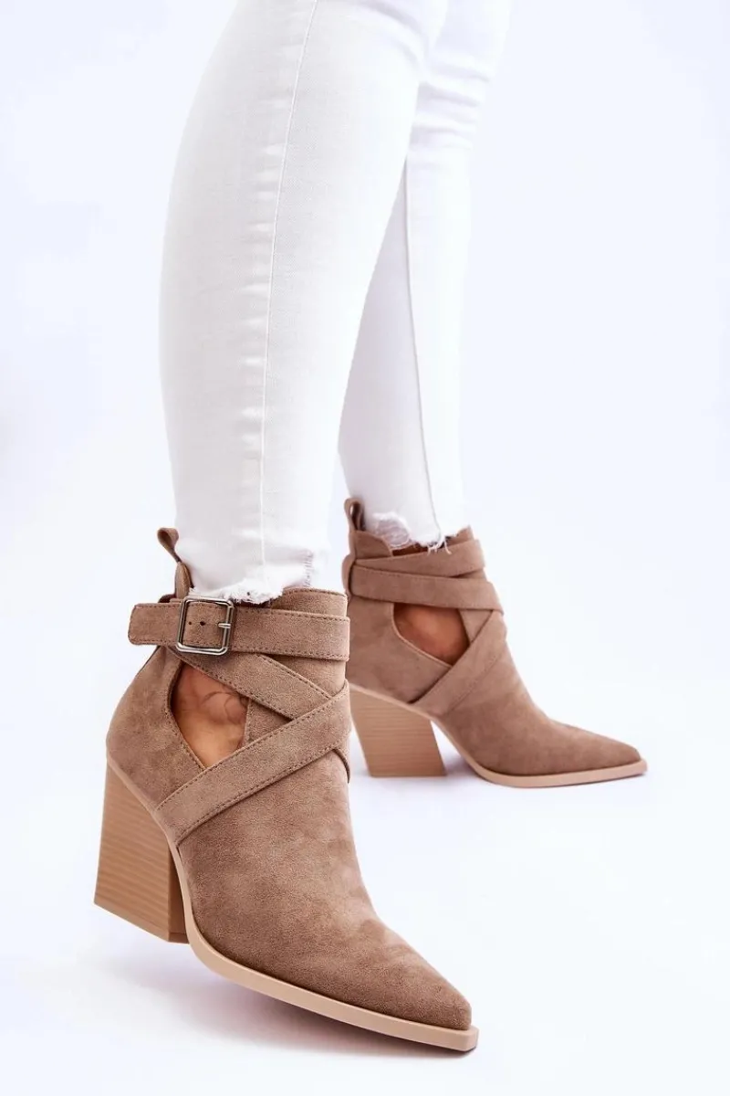 Botki o fasonie kowbojek zostały wykonane z miękkiego eko zamszu. Dodatkowo posiadają usztywniany zapiętek. Buty zostały osadzone na obcasie w postaci słupka. Cholewka z wycięciami po bokach jest charakterystyczna dla tego modelu. Te botki będą świetnym uzupełnieniem wielu stylizacji. Przy wyborze rozmiaru prosimy sugerować się tabelą rozmiarów.