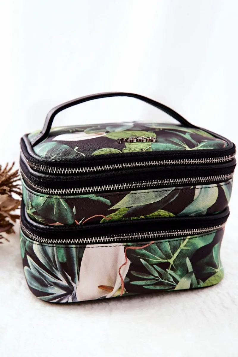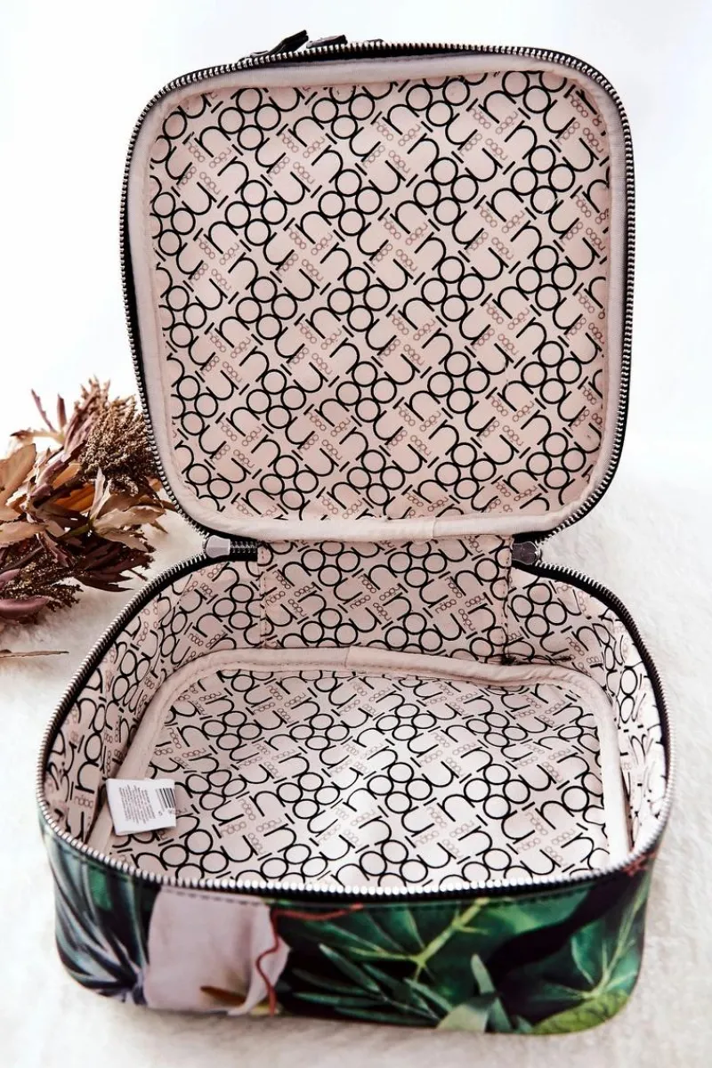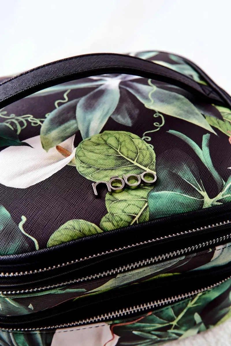 Kosmetyczka została wykonana z ekoskóry w piękny print. Może pełnić także funkcję kuferka. Posiada trzy suwaki, dzięki którym mamy wygodny dostęp do zawartości. W górnej komorze znajduje się otwarta kieszeń z gumką oraz osobna gumka podtrzymująca kosmetyki. W środkowej komorze można luźno umieścić różne, małe przedmioty. Dolna kieszeń jest głębsza od środkowej i również nie posiada kieszonek ani gumek, jak środkowa komora. Całość w środku jest obszyta materiałem w logo marki NOBO.