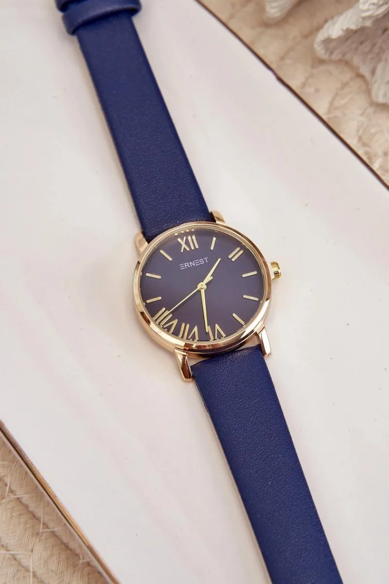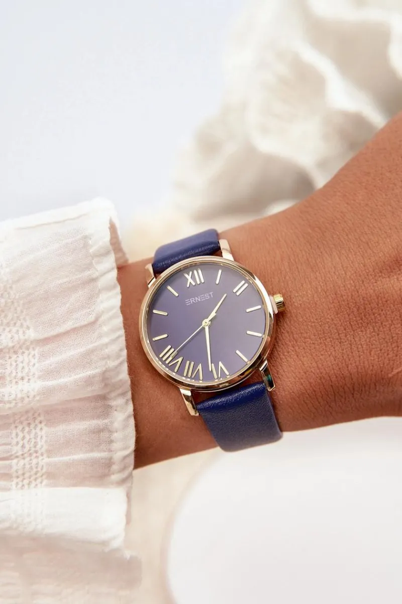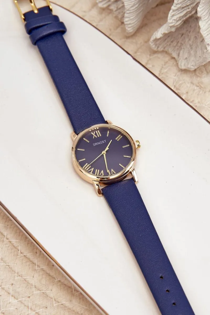 Zegarek damski marki Ernest. Pasek wykonany z eko skóry. Prosta, lecz wyjątkowa forma tego zegarka czyni go idealnym dodatkiem zarówno do codziennych, jak i bardziej formalnych okazji. Dzięki swojej uniwersalności i elegancji zawsze będzie stanowił subtelne dopełnienie każdego stroju.