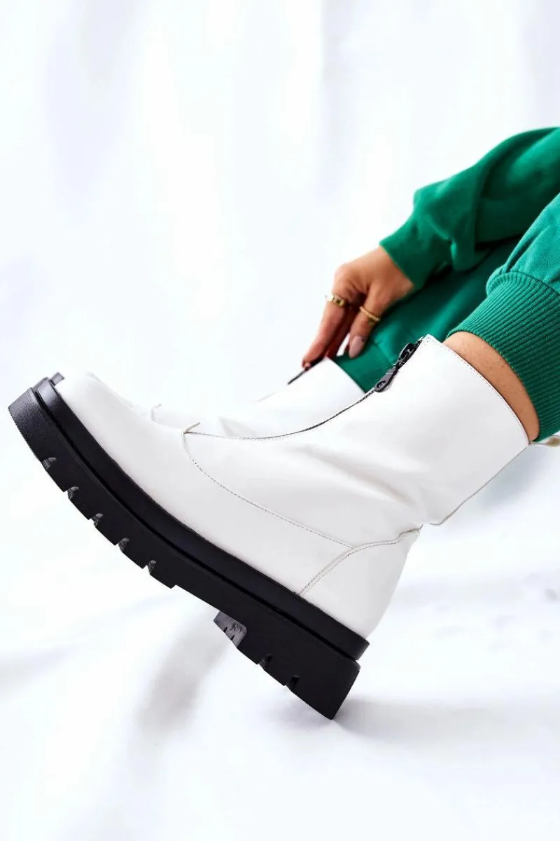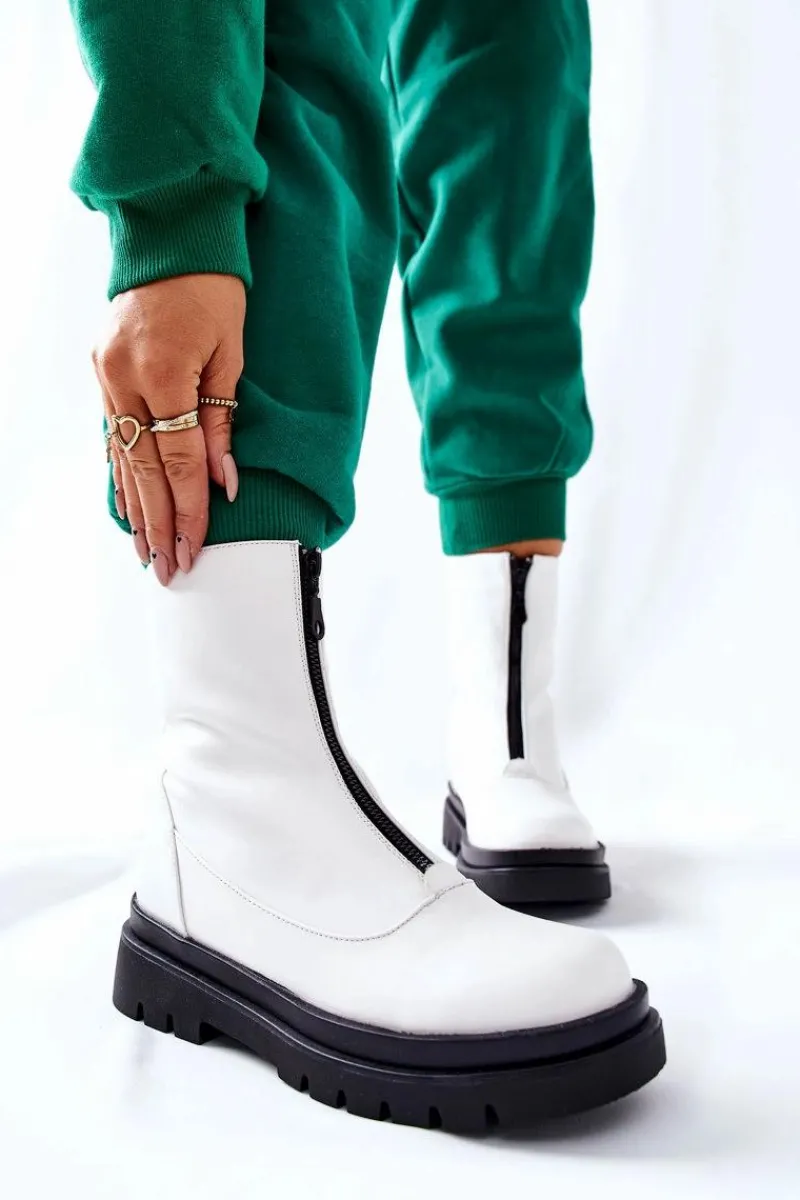 Botki wykonane z ekoskóry. Posiadają suwak na przodzie cholewki, dzięki czemu są wygodne w zakładaniu. Dopasowana cholewka podkreśli Twoje nogi. Przyjemny w dotyku koc obuwniczy przyda się na zimne, jesienne dni.Przy wyborze rozmiaru prosimy sugerować się tabelą rozmiarów.
