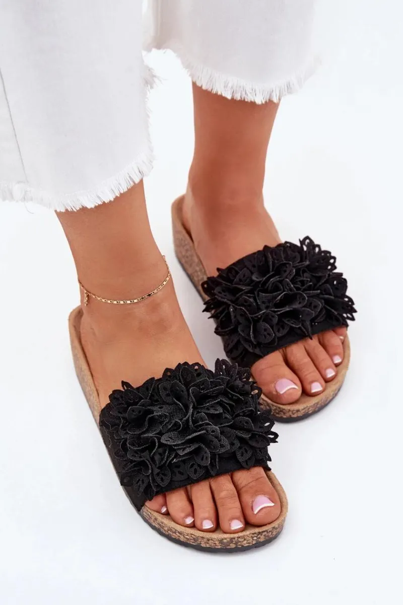 Klapki na korkowej platformie to stylowa propozycja na co dzień. Dzięki profilowanej wkładce zapewniają komfort przez cały dzień. Ozdobione materiałowymi kwiatkami na pasku, dodają uroku. Doskonałe do sukienek oraz spodni, łączą wygodę z modnym wyglądem, idealne na letnie dni. Przy wyborze rozmiaru prosimy sugerować się tabelą rozmiarów.