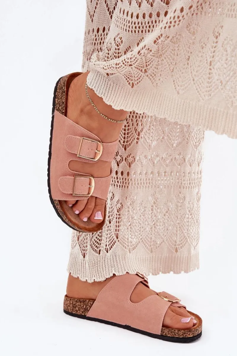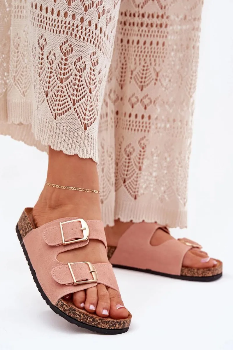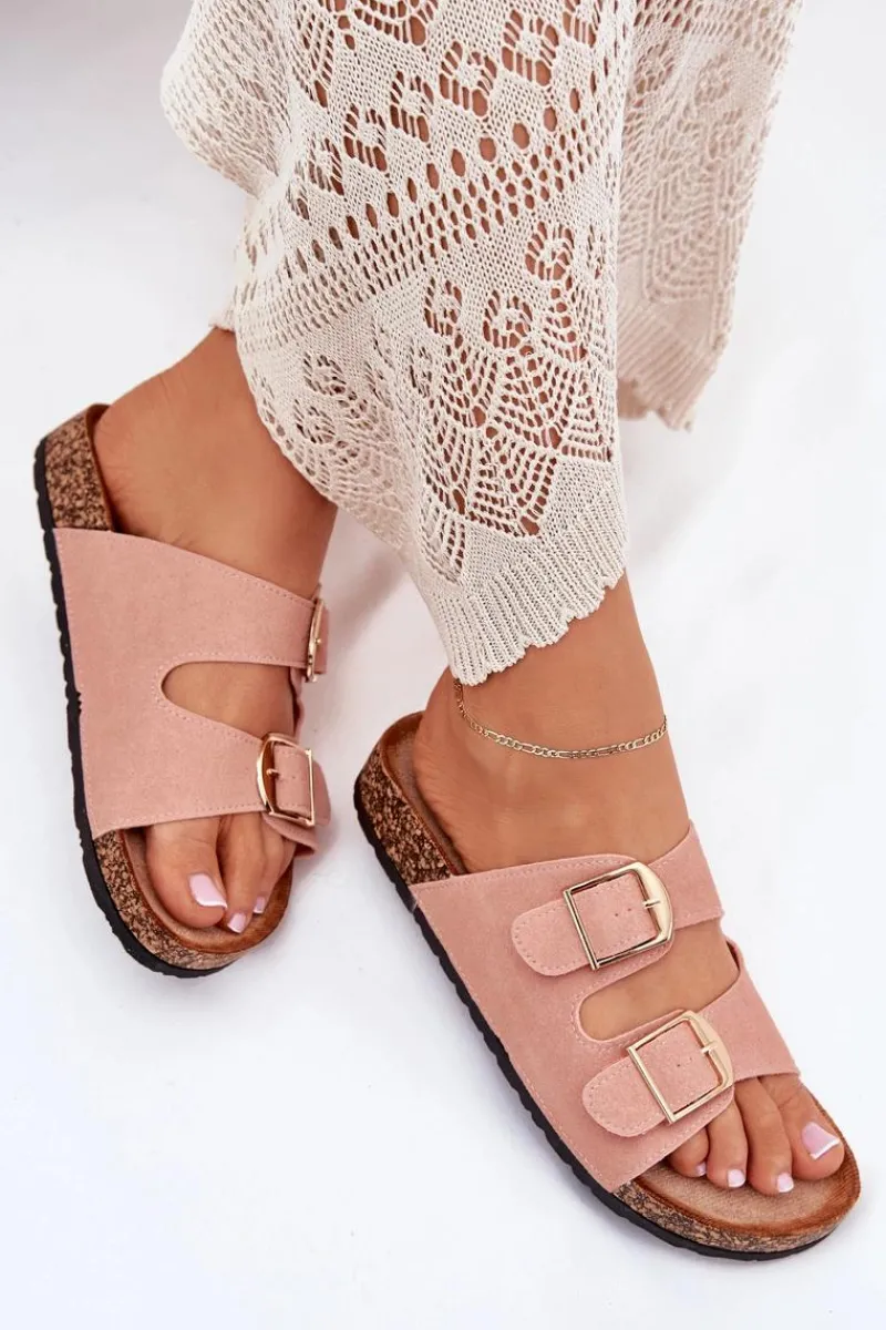 Stylowe klapki damskie na korkowej platformie, które łączą wygodę z modnym wyglądem. Z przodu znajdują się dwa paski z klamrami, które zapewniają idealne dopasowanie. Profilowana eko zamszowa wkładka gwarantuje komfort przez cały dzień. Te klapki będą doskonałym wyborem na letnie dni, świetnie komponując się z sukienkami, spódnicami i spodniami. Przy wyborze rozmiaru prosimy sugerować się tabelą rozmiarów.