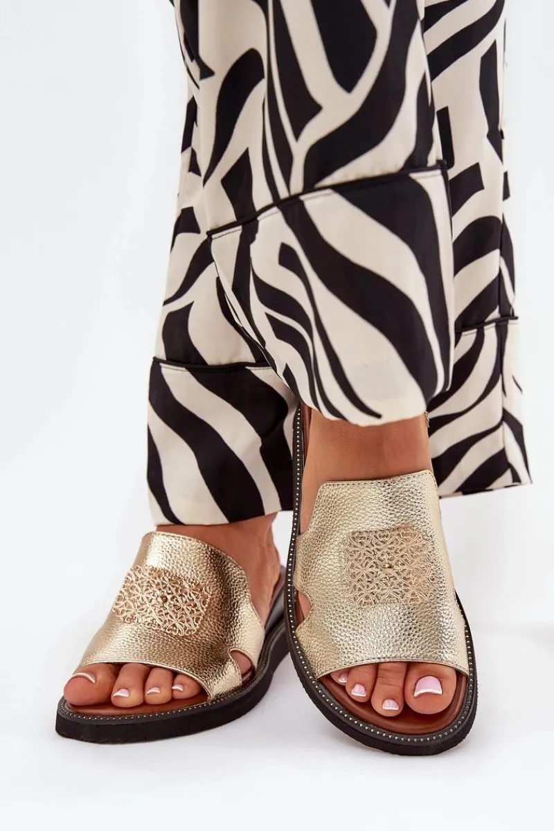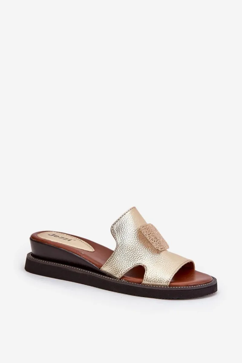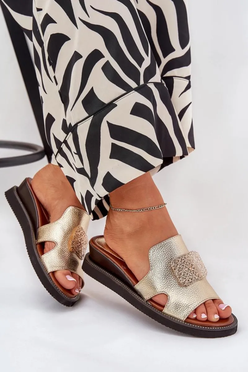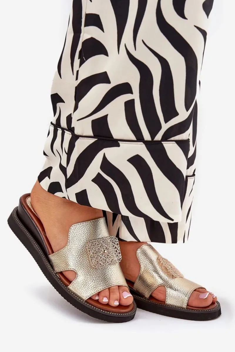 Clearance Klapki Damskie Na Koturnie Eko Skórzane Z Ozdobą Złote Sarela Damskie Klapki Na Koturnie|Klapki Na Platformie