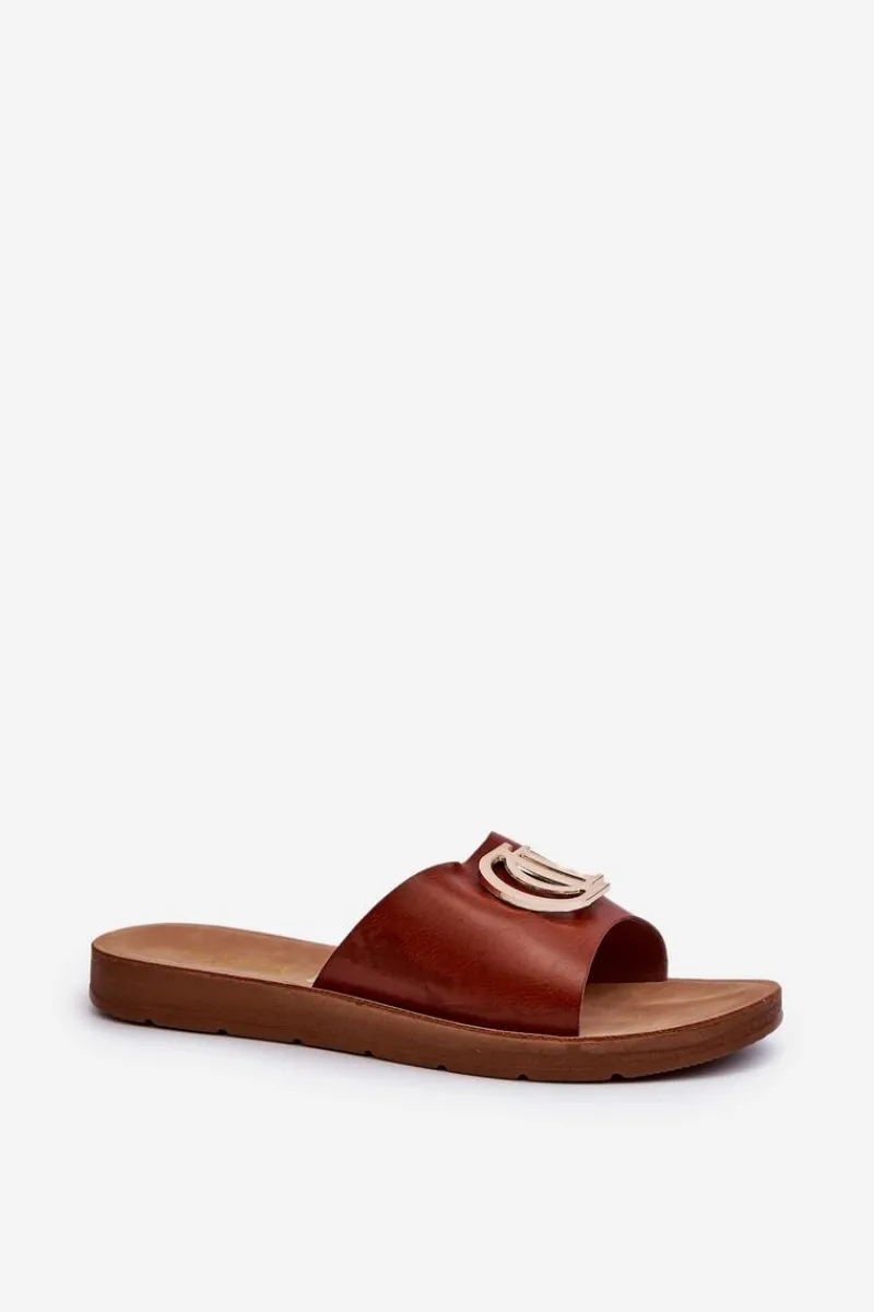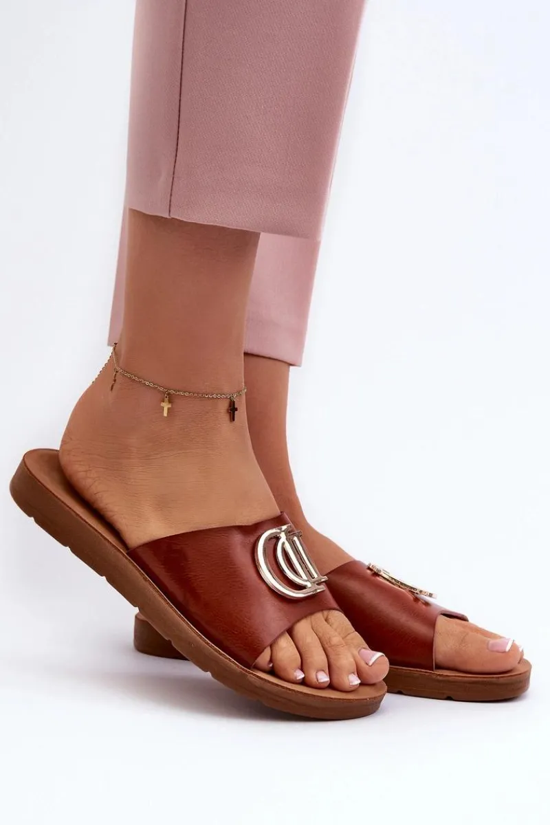 Klapki damskie z ekoskóry prezentują się niezwykle stylowo i elegancko. Płaska podeszwa zapewnia wygodę i komfort podczas długich spacerów czy letnich wyjść. Dodatkowo złota ozdoba nadaje im subtelnego uroku, co sprawia, że doskonale wpasują się w różnorodne letnie stylizacje. Przy wyborze rozmiaru prosimy sugerować się tabelą rozmiarów.