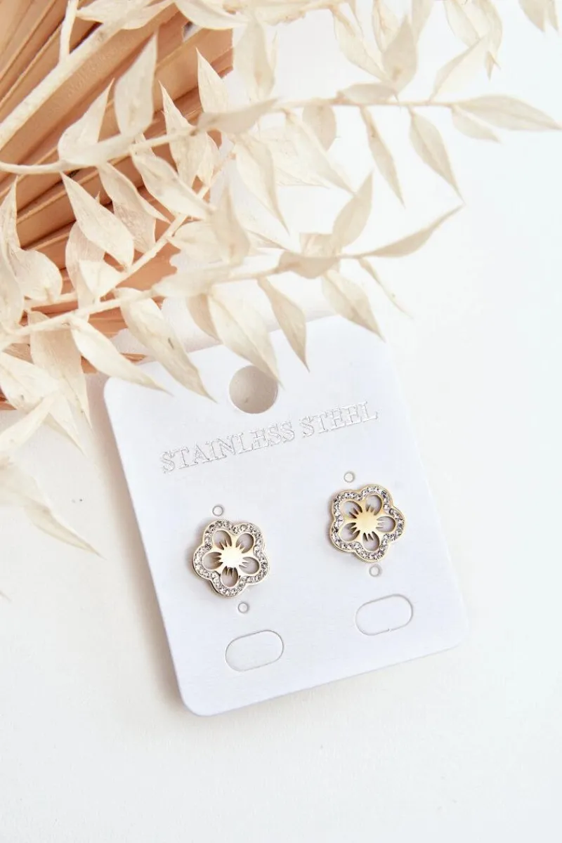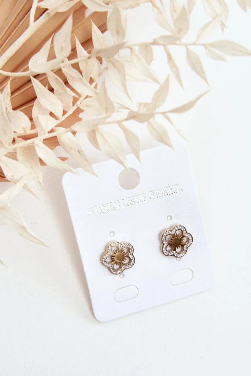 Te cudowne kolczyki w kształcie kwiatków zostały wykonane ze stali nierdzewnej. Model ten jest zapinany na sztyft. Dodatkowo ozdobiono je malutkimi dżetami imitującymi cyrkonie. Ten model świetnie sprawdzi się zarówno do eleganckich, jak i casualowych stylizacji!