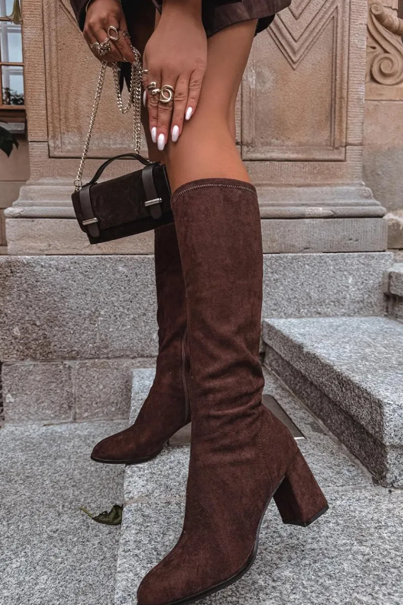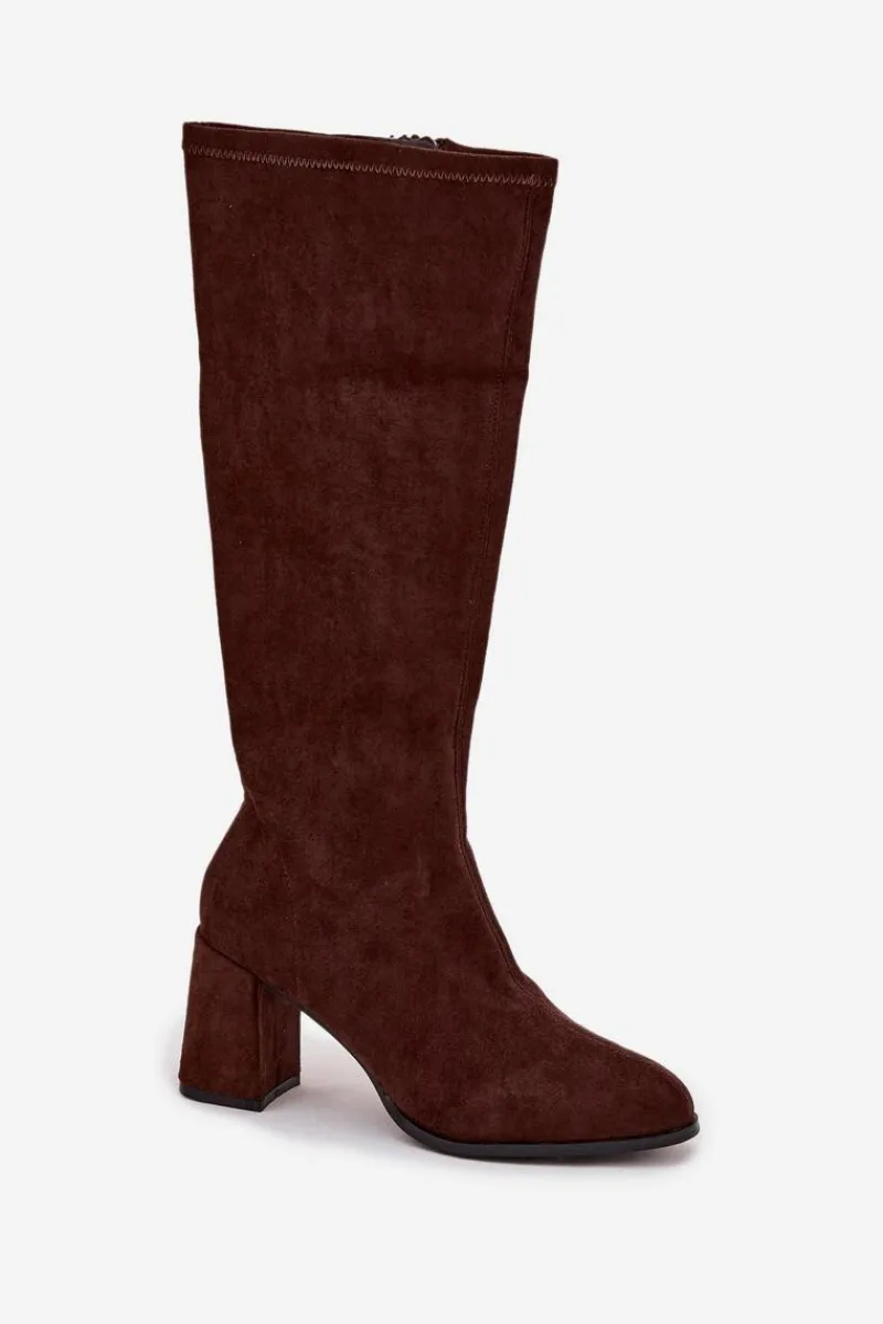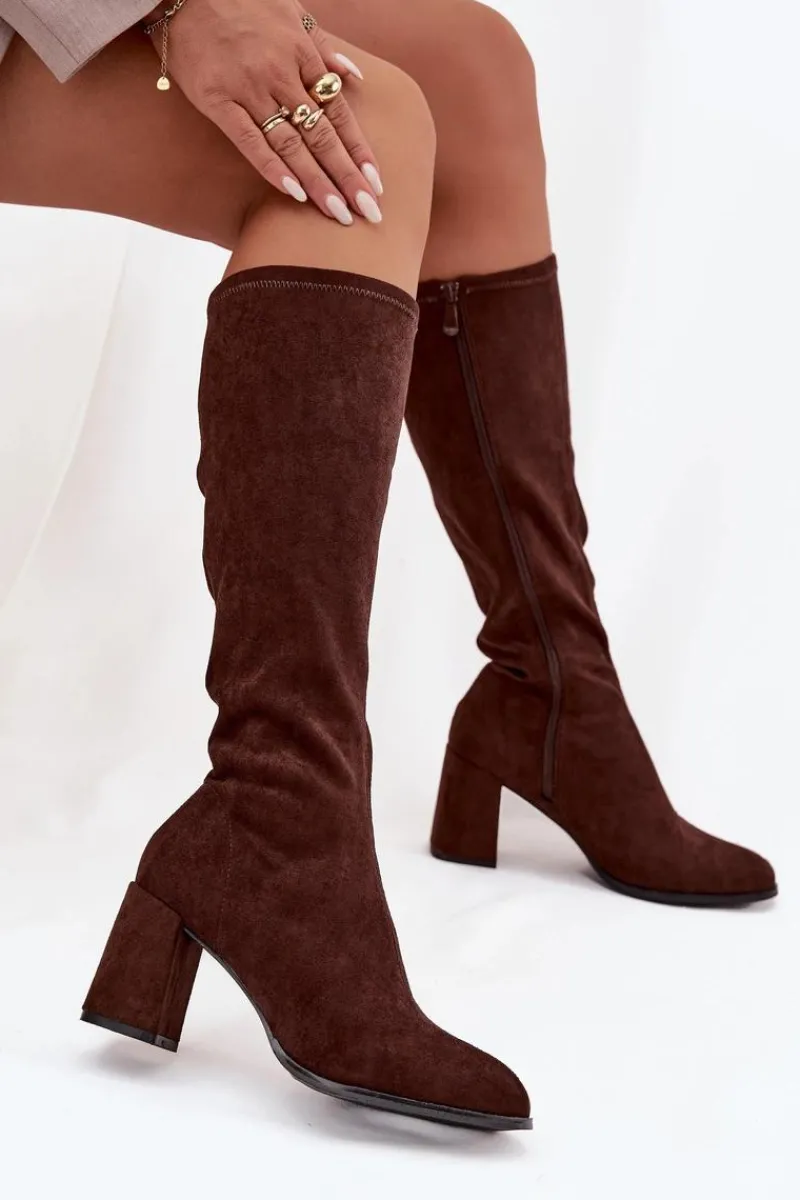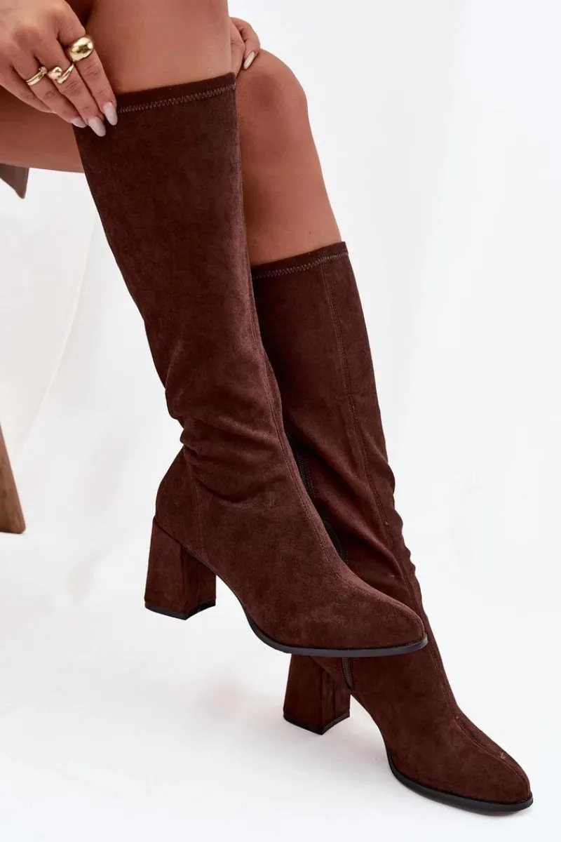 Kozaki damskie wykonane z eko zamszu to elegancka propozycja, która doskonale uzupełni jesienno-zimowe stylizacje. Model osadzony został na stabilnym obcasie typu słupek, który subtelnie wysmukla sylwetkę i dodaje jej kobiecego charakteru. Zapięcie na zamek ułatwia zakładanie i zdejmowanie butów. Prosty fason z delikatnym przeszyciem biegnącym wzdłuż cholewki z przodu i z tyłu nadaje całości klasy oraz optycznie wydłuża nogi. To uniwersalne kozaki, które świetnie prezentują się w połączeniu z sukienkami, spódnicami czy dopasowanymi spodniami, podkreślając elegancję i styl. Przy wyborze rozmiaru prosimy sugerować się tabelą rozmiarów.