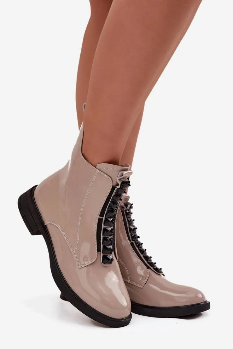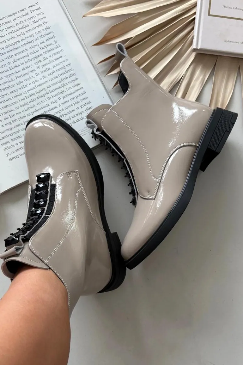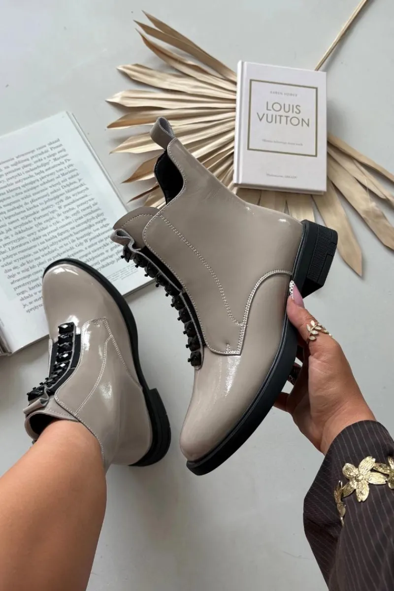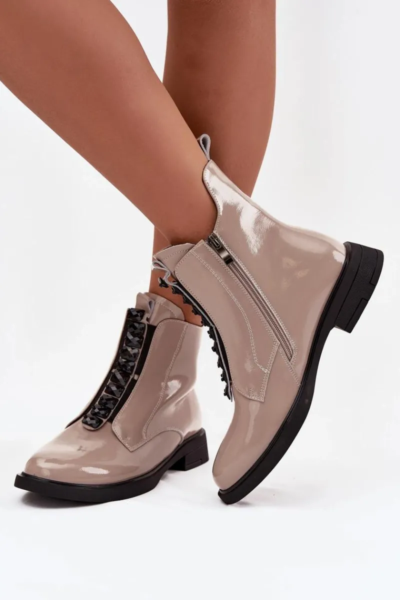 Botki damskie wykonane z naturalnej, lakierowanej skóry to propozycja dla kobiet ceniących elegancję i nowoczesny styl. Lśniąca powierzchnia materiału nadaje im wyjątkowego charakteru, sprawiając, że buty staną się wyrazistym akcentem każdej stylizacji. Model zapinany jest na zamek, który ułatwia zakładanie i zdejmowanie. Zaokrąglone noski podkreślają klasyczną linię buta, a ozdobne detale umieszczone z przodu dodają całości subtelnej oryginalności. Botki te świetnie sprawdzą się zarówno na co dzień, jak i podczas wyjątkowych okazji, doskonale uzupełniając zarówno casualowe, jak i eleganckie zestawy. Przy wyborze rozmiaru prosimy sugerować się tabelą rozmiarów.