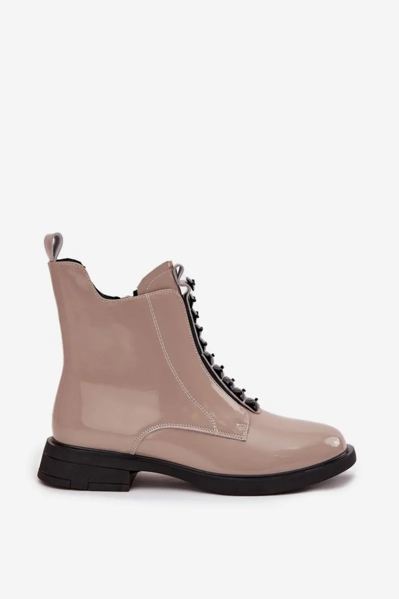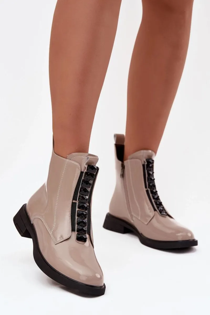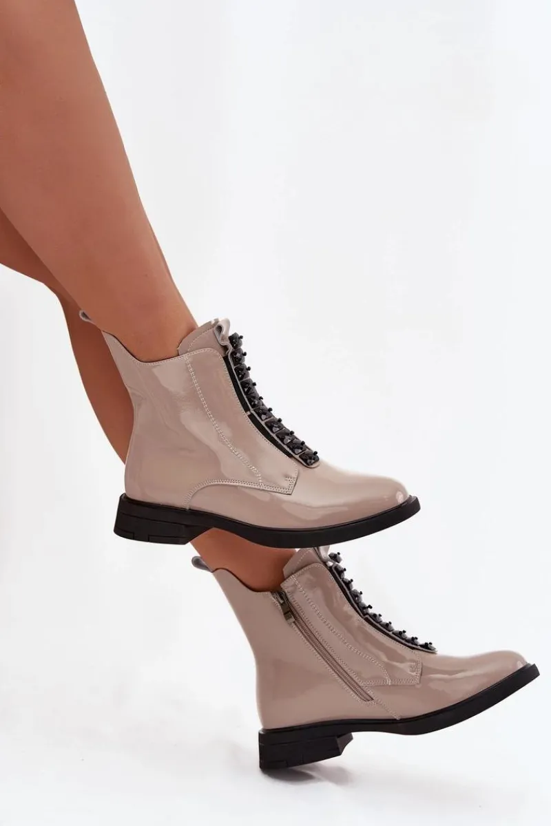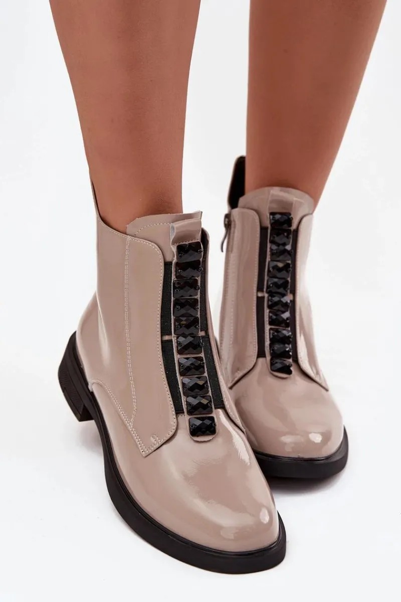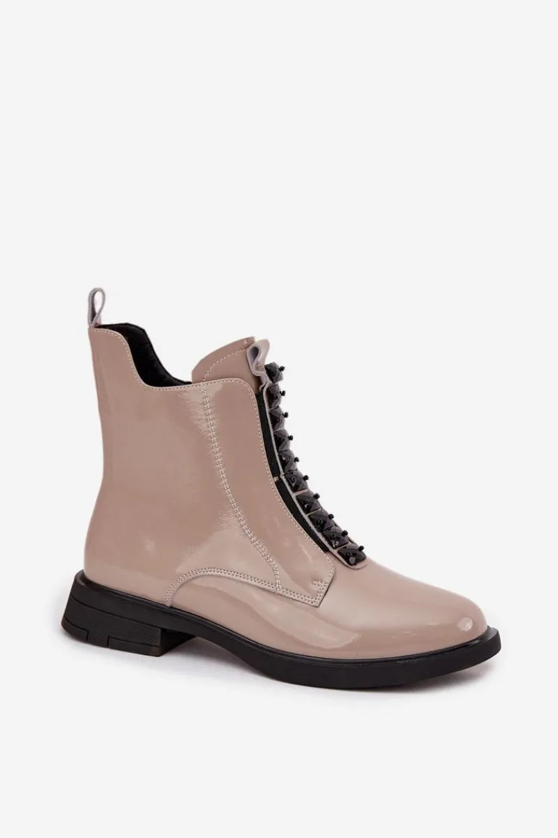 Botki damskie wykonane z naturalnej, lakierowanej skóry to propozycja dla kobiet ceniących elegancję i nowoczesny styl. Lśniąca powierzchnia materiału nadaje im wyjątkowego charakteru, sprawiając, że buty staną się wyrazistym akcentem każdej stylizacji. Model zapinany jest na zamek, który ułatwia zakładanie i zdejmowanie. Zaokrąglone noski podkreślają klasyczną linię buta, a ozdobne detale umieszczone z przodu dodają całości subtelnej oryginalności. Botki te świetnie sprawdzą się zarówno na co dzień, jak i podczas wyjątkowych okazji, doskonale uzupełniając zarówno casualowe, jak i eleganckie zestawy. Przy wyborze rozmiaru prosimy sugerować się tabelą rozmiarów.