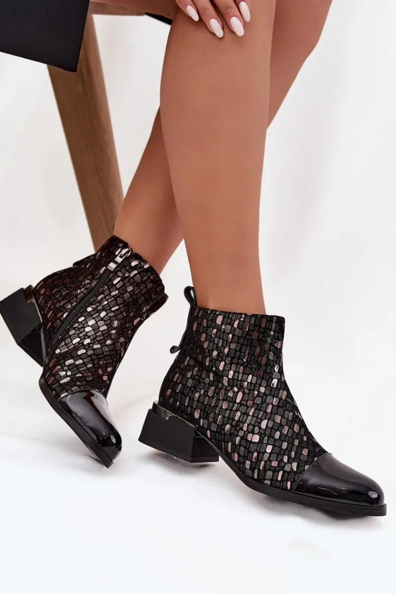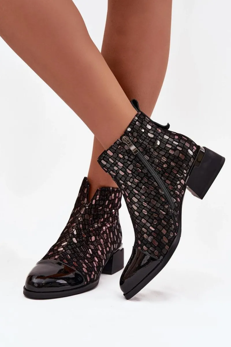 Eleganckie botki damskie wykonane z połączenia lakierowanej skóry naturalnej i zamszu to wyjątkowa propozycja dla kobiet, które cenią sobie oryginalny styl i wysoką jakość. Zestawienie dwóch rodzajów materiałów nadaje wyrazistego charakteru, a błyszczący wzór na cholewce przyciąga uwagę i podkreśla ich elegancję. Model został osadzony na stabilnym obcasie w formie klocka, który delikatnie unosi sylwetkę, zapewniając przy tym wygodę noszenia przez cały dzień. Wnętrze ocieplone kocem obuwniczym gwarantuje komfort termiczny w chłodniejsze dni, dzięki czemu botki świetnie sprawdzą się w sezonie jesienno-zimowym. To obuwie, które znakomicie dopełni zarówno codzienne stylizacje z jeansami, jak i bardziej wyrafinowane zestawy ze spódnicą czy sukienką, dodając im elegancji. Przy wyborze rozmiaru prosimy sugerować się tabelą rozmiarów.