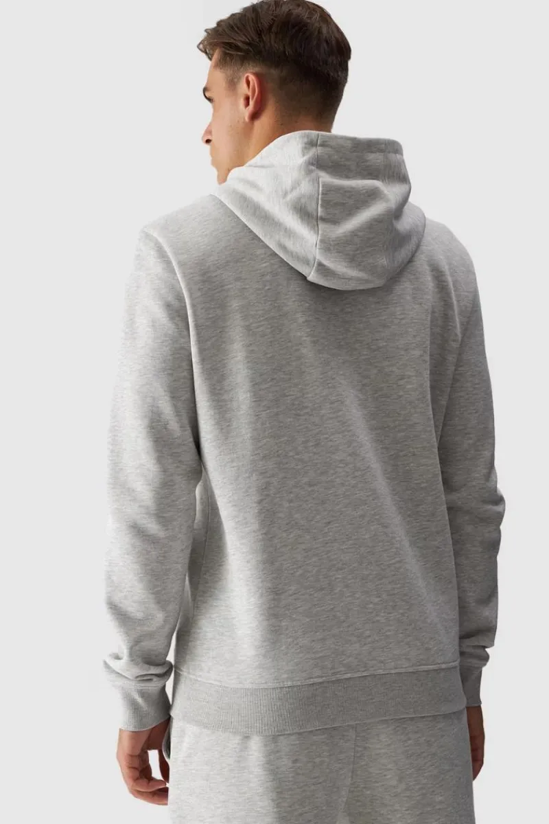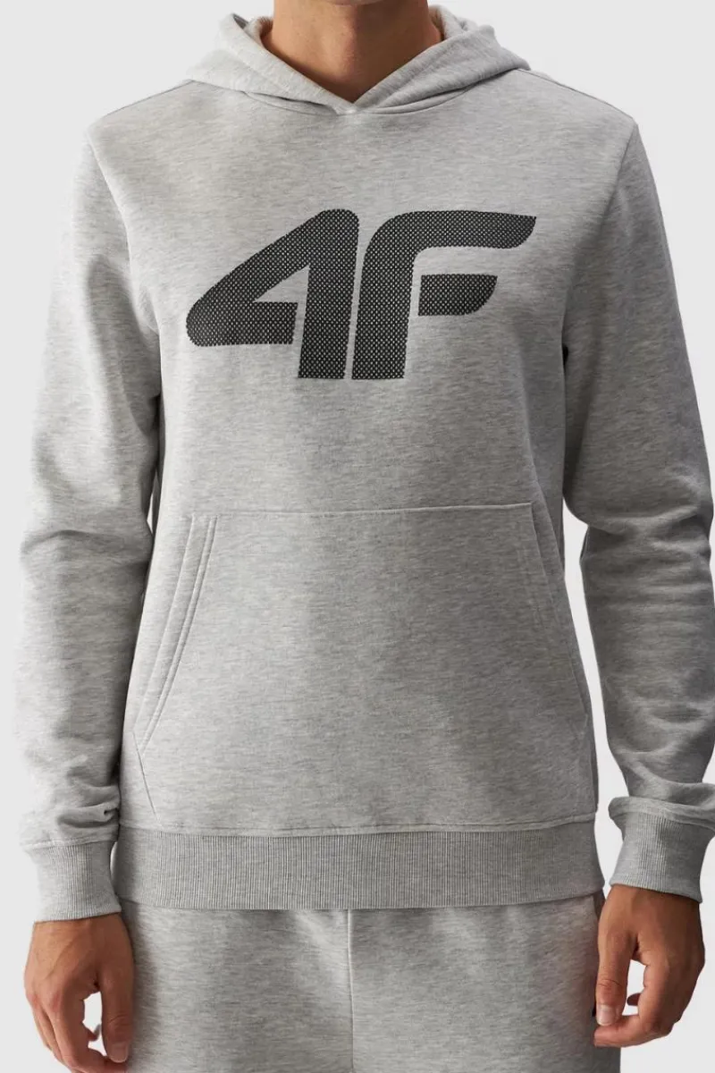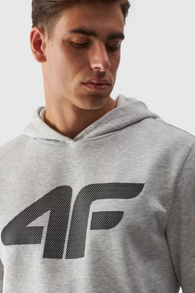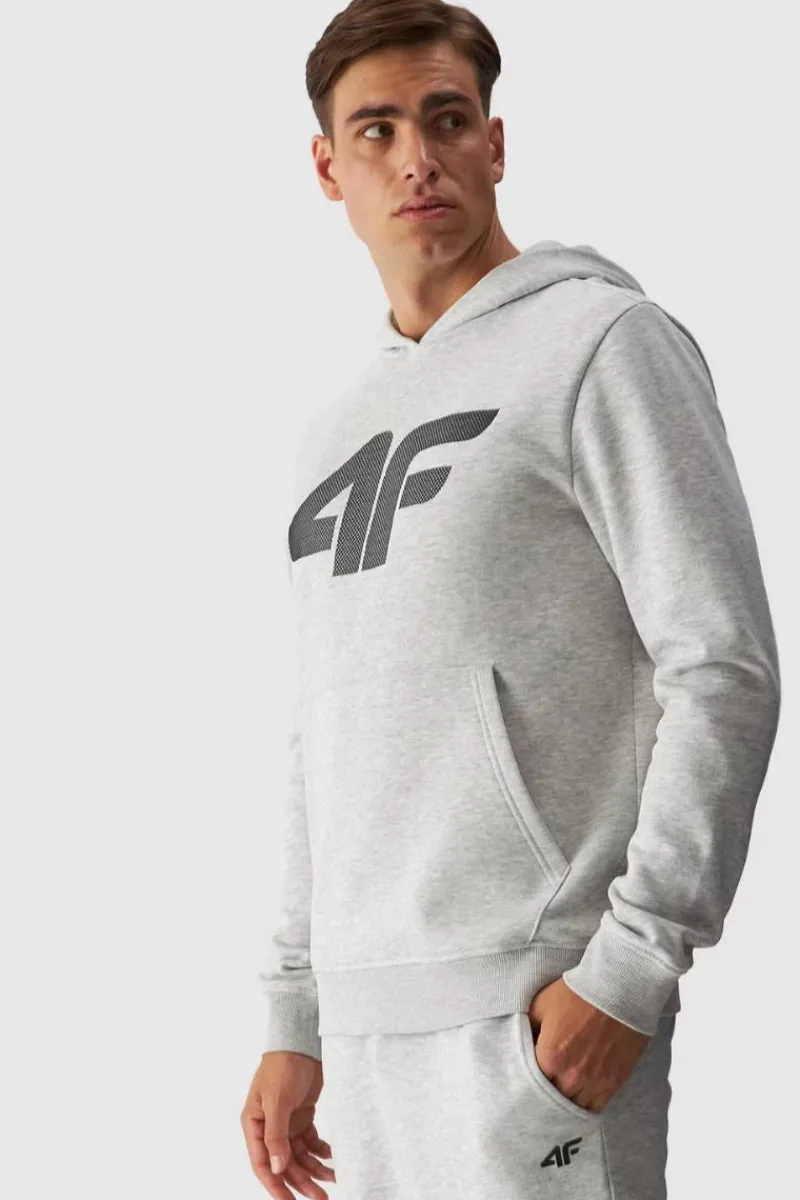 Bluza dresowa męska nierozpinana z kapturem idealnie sprawdzi się jako element zarówno casualowych, jak i sportowych stylizacji na co dzień. Posiada krój regular, który wygodnie dopasowuje się do sylwetki. Dzianina dresowa french terry z jednej strony jest gładka, natomiast z drugiej posiada widoczny splot w postaci pętelki. Dzianina w tym splocie jest miękka, bardziej lejąca i cieńsza w dotyku. Bluza dresowa męska z kapturem posiada średnią gramaturę 300 gsm, która sprawia, że jest ona miękka oraz bardziej przewiewna. Bluza dresowa nierozpinana dla mężczyzny jest wykonana w 80% z bawełny, dzięki czemu jest miękka, trwała i przyjemna w dotyku. Dzięki dodatkowi poliestru (20%) materiał utrzymuje fason i jest odporny na zużycie nawet przez wiele sezonów. Elastyczne mankiety ze ściągaczem. Z przodu widoczny nadruk „4F” i otwarta kieszeń kangurka. Wkładana przez głowę. Dół z szerokim ściągaczem. Materiał główny: Bawełna 80%, Poliester 20%