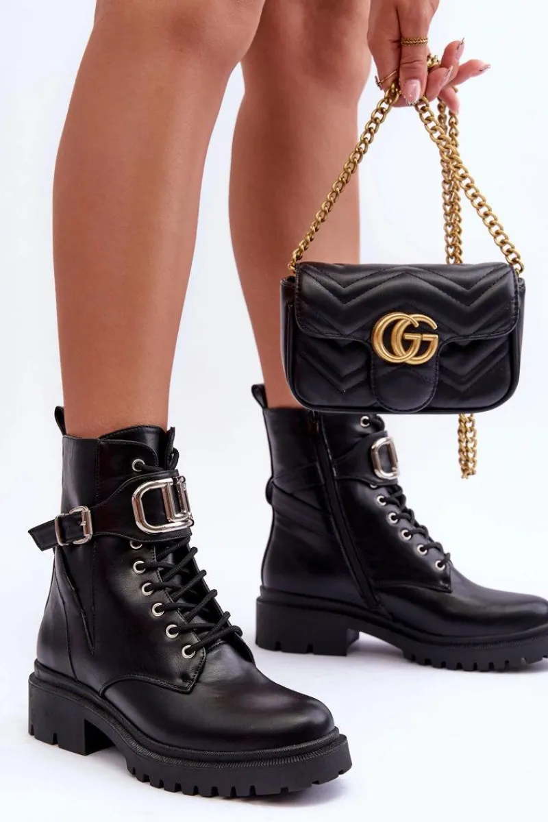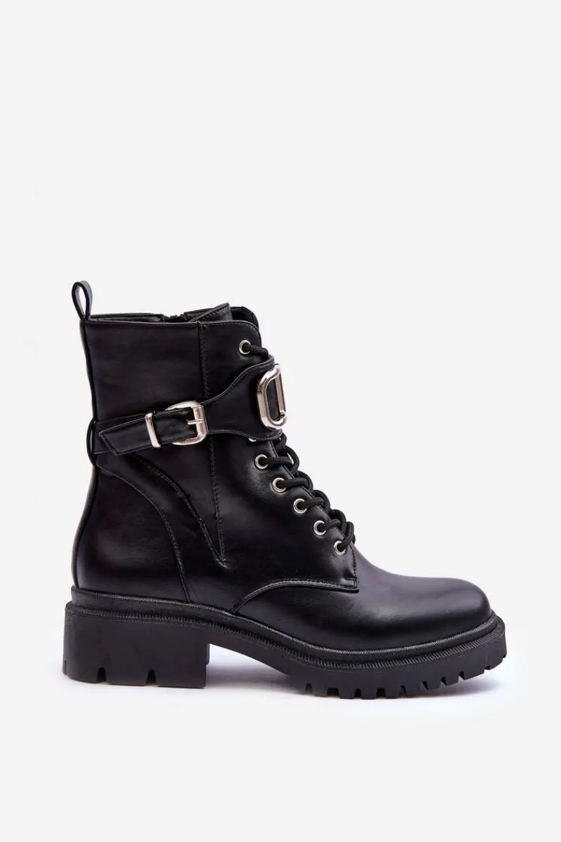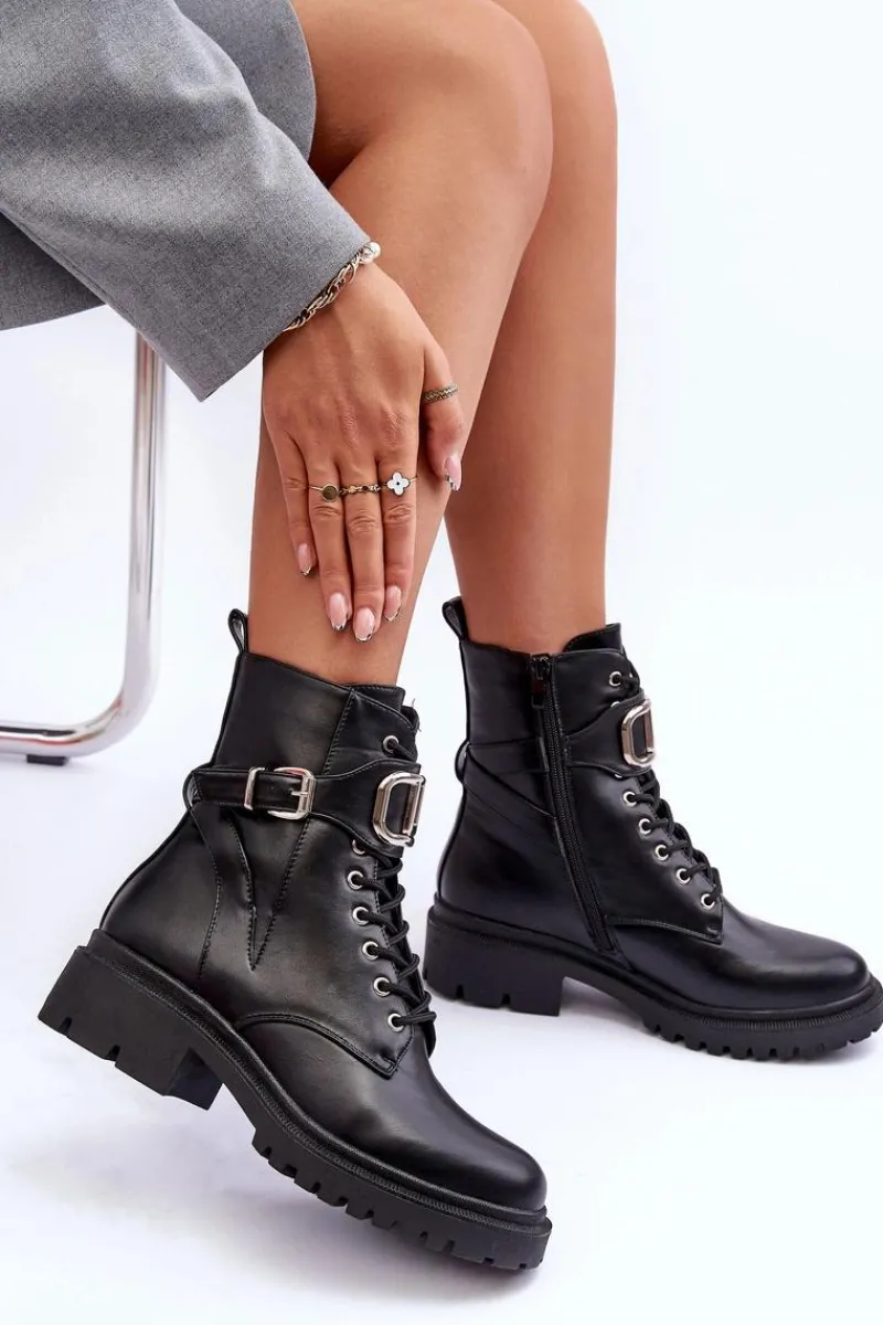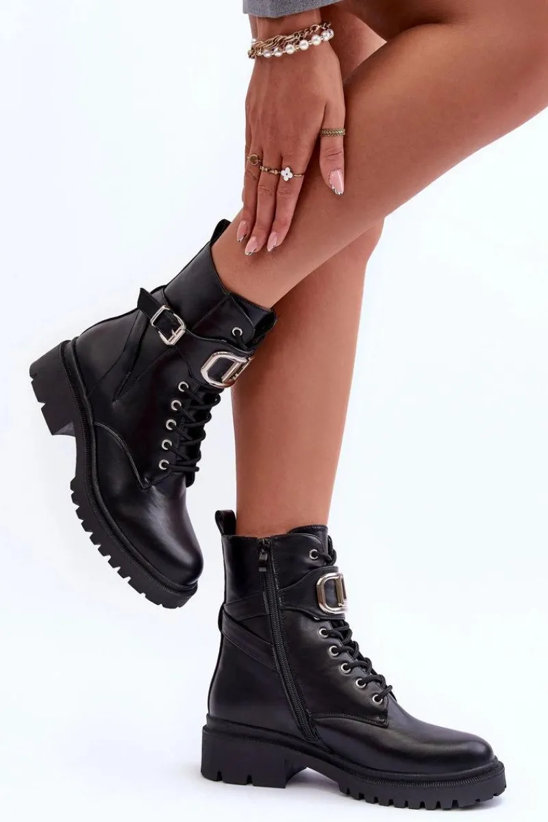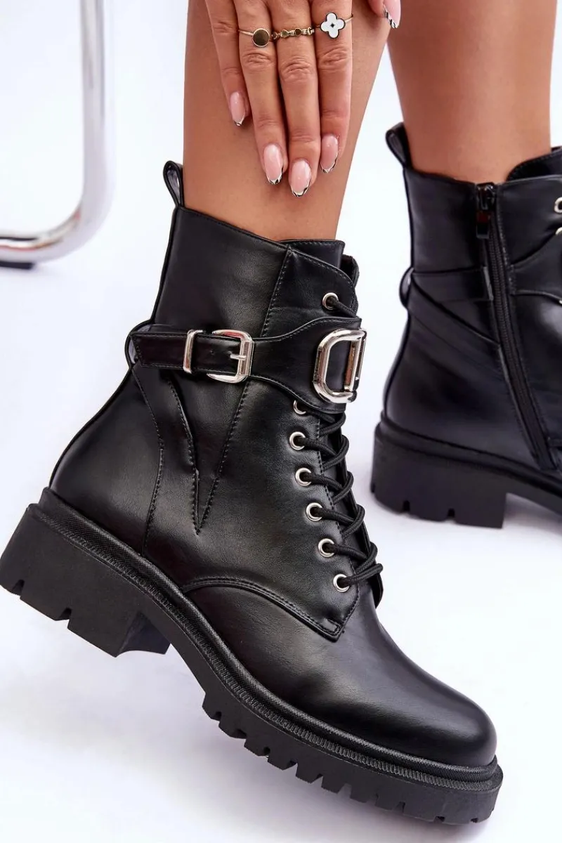 Modne, damskie workery na płaskim, masywnym obcasie i platformie. Wykonane zostały z eko skóry. Model ten zapinany jest na zamek i dodatkowo posiada sznurówki. Na pasku znajduje się ozdoba z tworzywa sztucznego oraz klamra. Świetnie sprawdzą się do wielu stylizacji! Przy wyborze rozmiaru prosimy sugerować się tabelą rozmiarów.