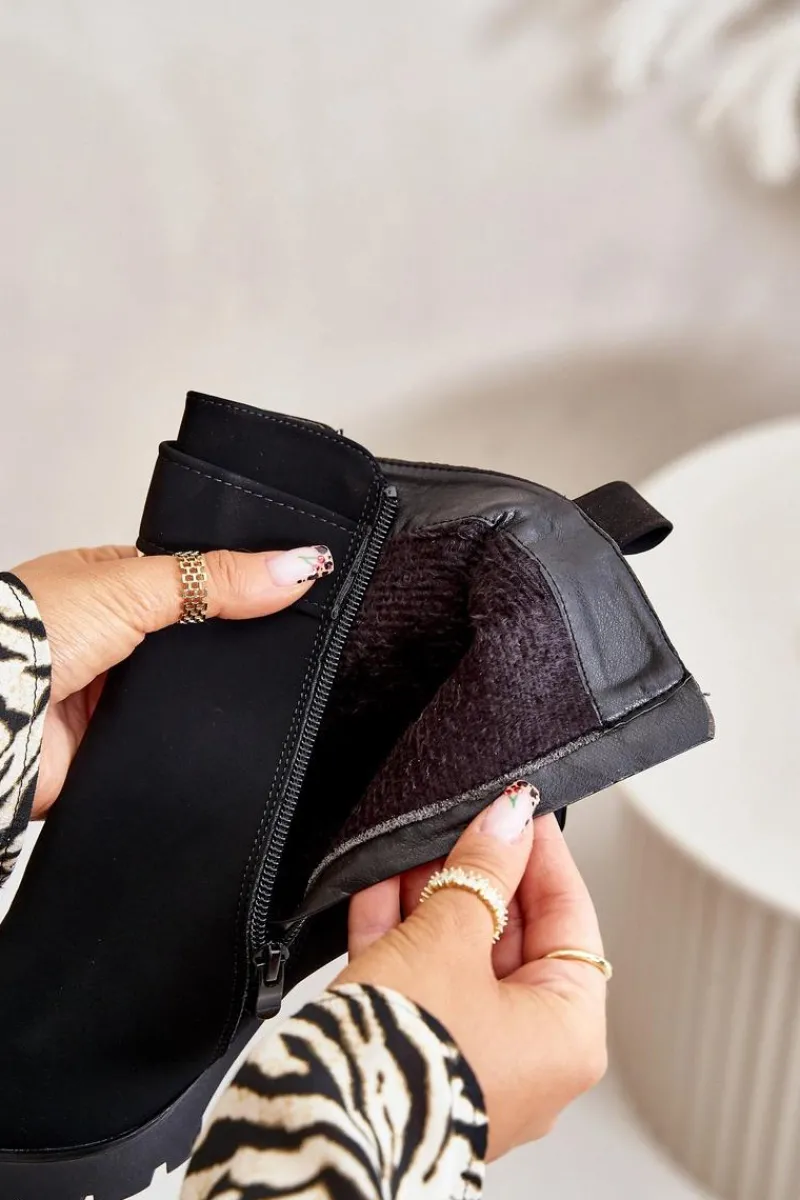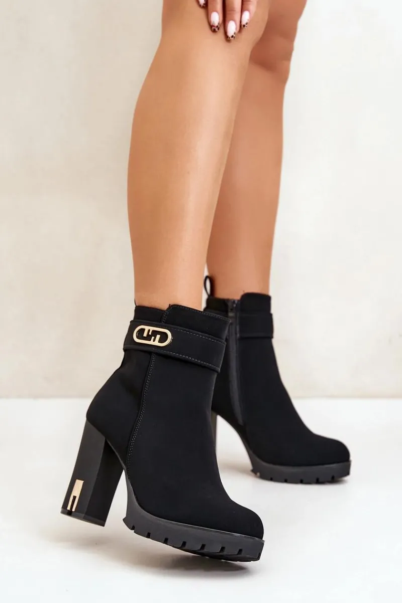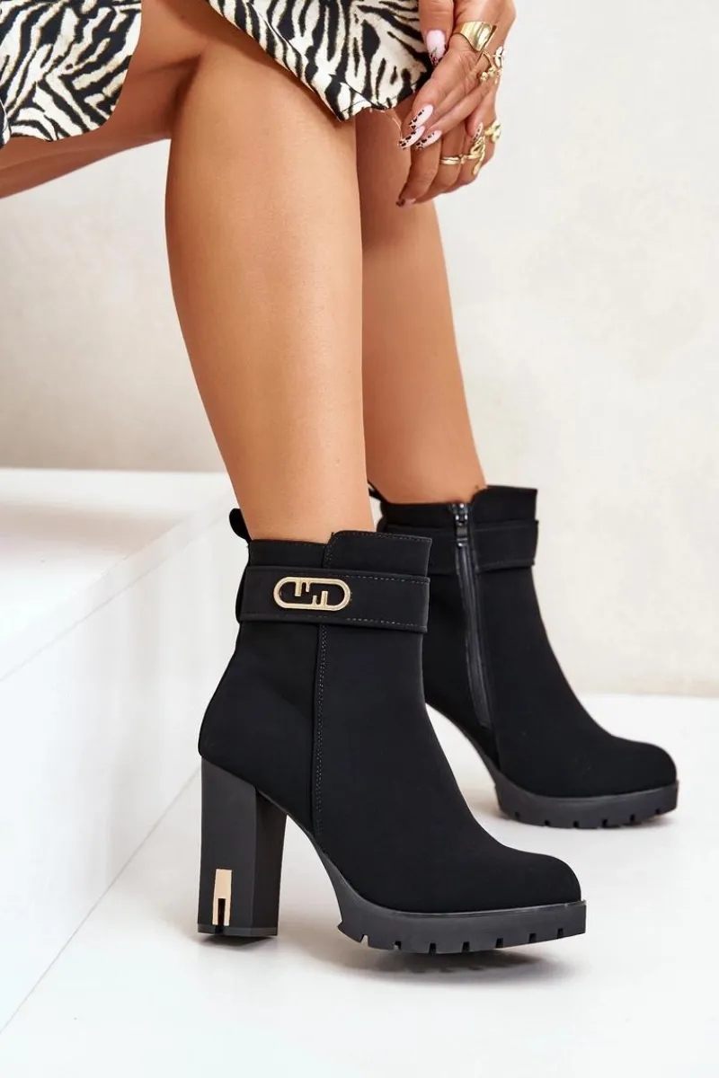 Eleganckie botki z eko skóry to idealny wybór na chłodniejsze dni. Obcas w formie słupka. Środek ocieplony kocem obuwniczym gwarantuje ciepło w chłodniejsze dni. Cholewka ozdobiona paskiem z subtelnym, złotym detalem. Zaokrąglony nosek oraz usztywniany zapiętek dbają o komfort stóp. Model ten świetnie sprawdzi się w wielu jesienno-zimowych stylizacjach! Przy wyborze rozmiaru prosimy sugerować się tabelą rozmiarów.