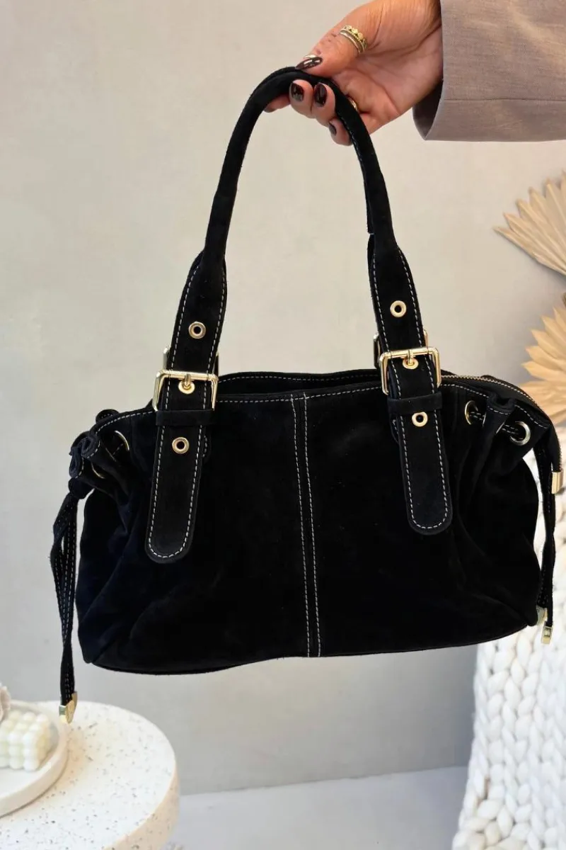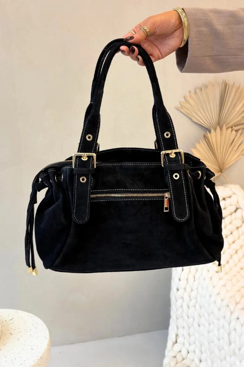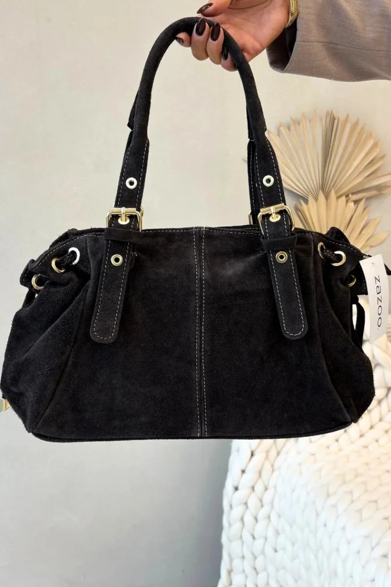 Torebka damska wykonana z naturalnego zamszu to elegancki i stylowy dodatek, który podkreśli każdą stylizację. Model wyróżniają złote okucia oraz ozdobne paski z klamrami. nowoczesnego charakteru. Torebka jest zapinana na zamek, a jej dwukomorowe wnętrze z praktycznymi kieszeniami pozwala zachować porządek i pomieścić wszystkie niezbędne drobiazgi. To idealny wybór dla kobiet, które cenią połączenie elegancji, funkcjonalności i ponadczasowego stylu.