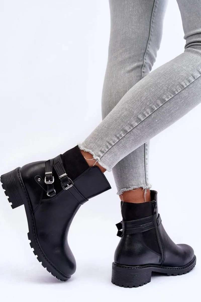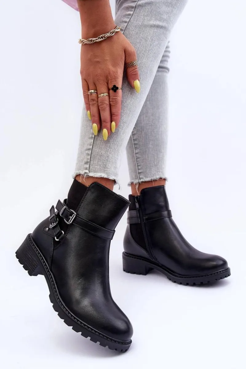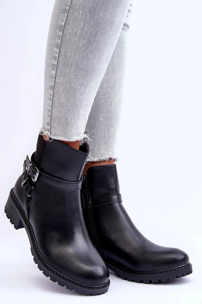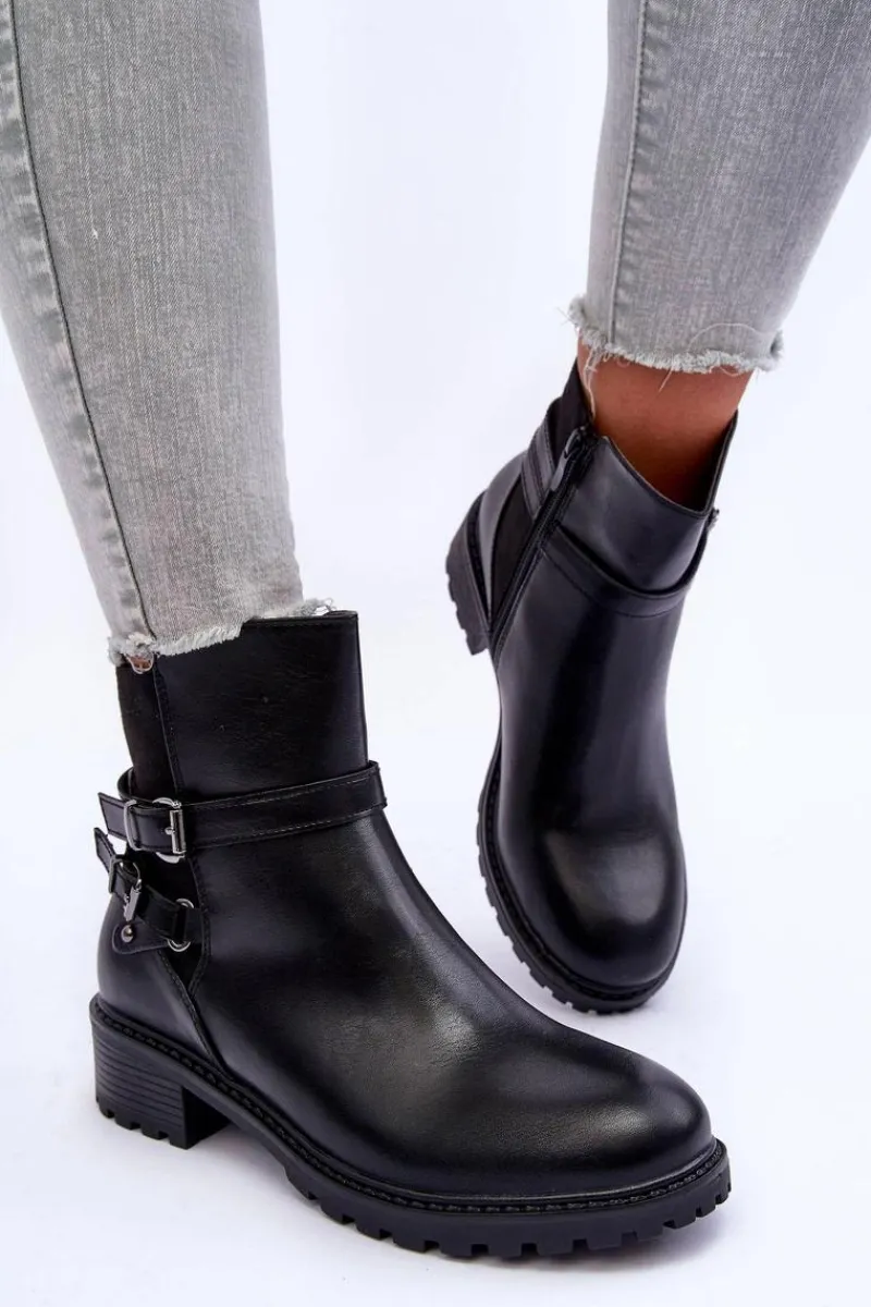 Damskie botki zostały wykonane z eko skóry. Osadzone na płaskim obcasie i platformie. Model ten zapinany jest na suwak z boku. Cholewka została ozdobiona cienkimi paskami ze sprzączką. Buty ocieplone są kocem obuwniczym. Ten model powinien znaleźć się w Twojej szafie! Przy wyborze rozmiaru prosimy sugerować się tabelą rozmiarów.