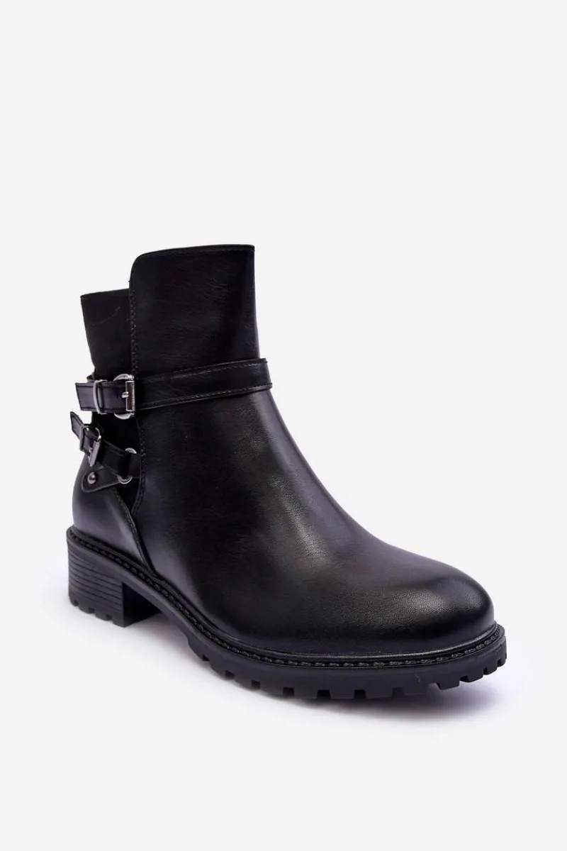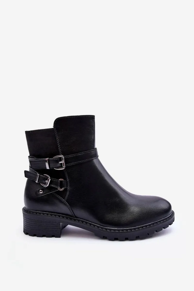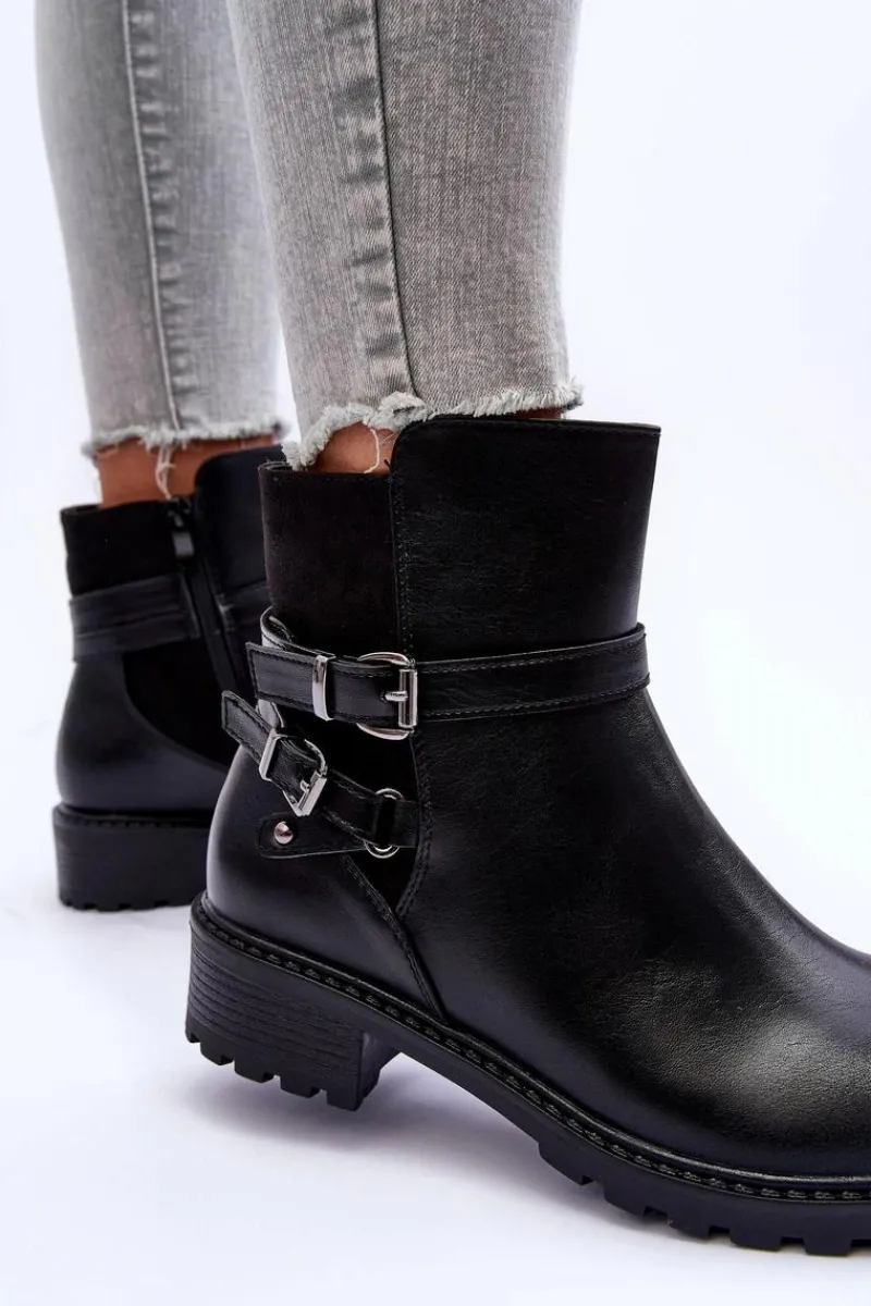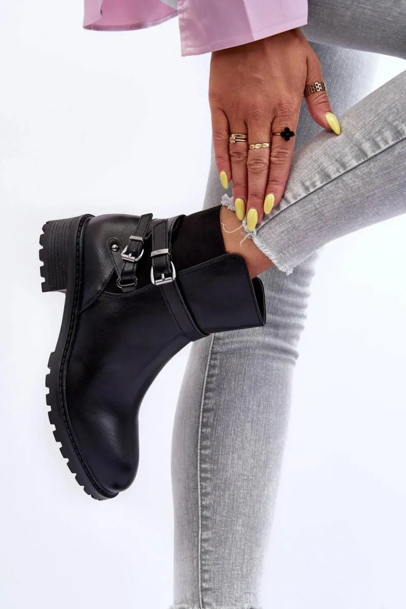 Damskie botki zostały wykonane z eko skóry. Osadzone na płaskim obcasie i platformie. Model ten zapinany jest na suwak z boku. Cholewka została ozdobiona cienkimi paskami ze sprzączką. Buty ocieplone są kocem obuwniczym. Ten model powinien znaleźć się w Twojej szafie! Przy wyborze rozmiaru prosimy sugerować się tabelą rozmiarów.
