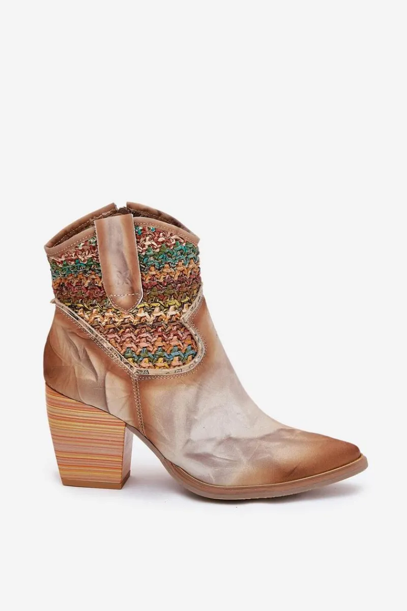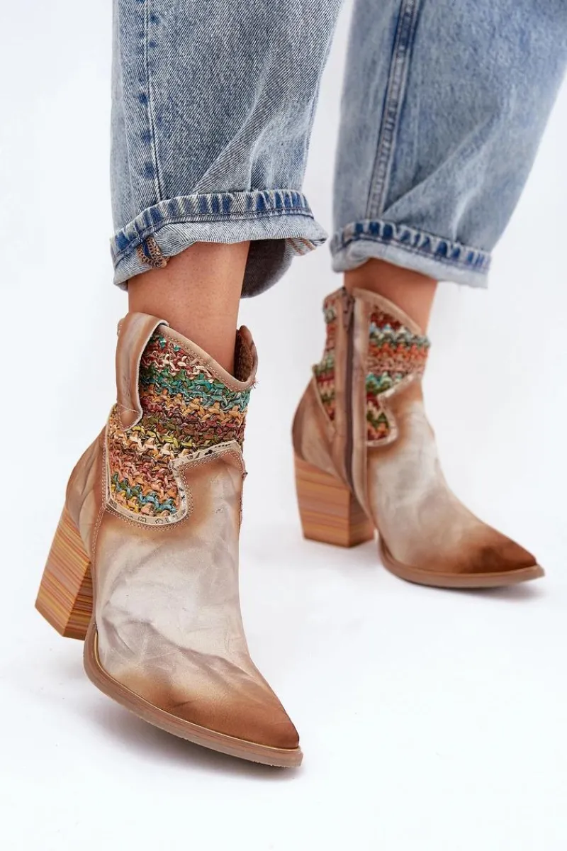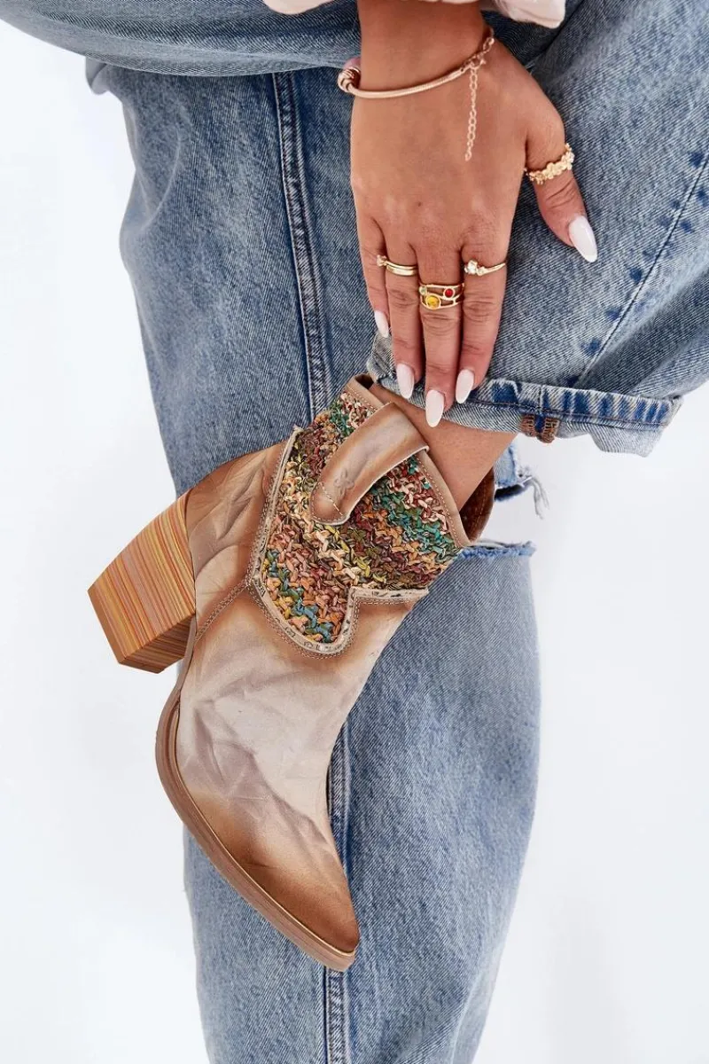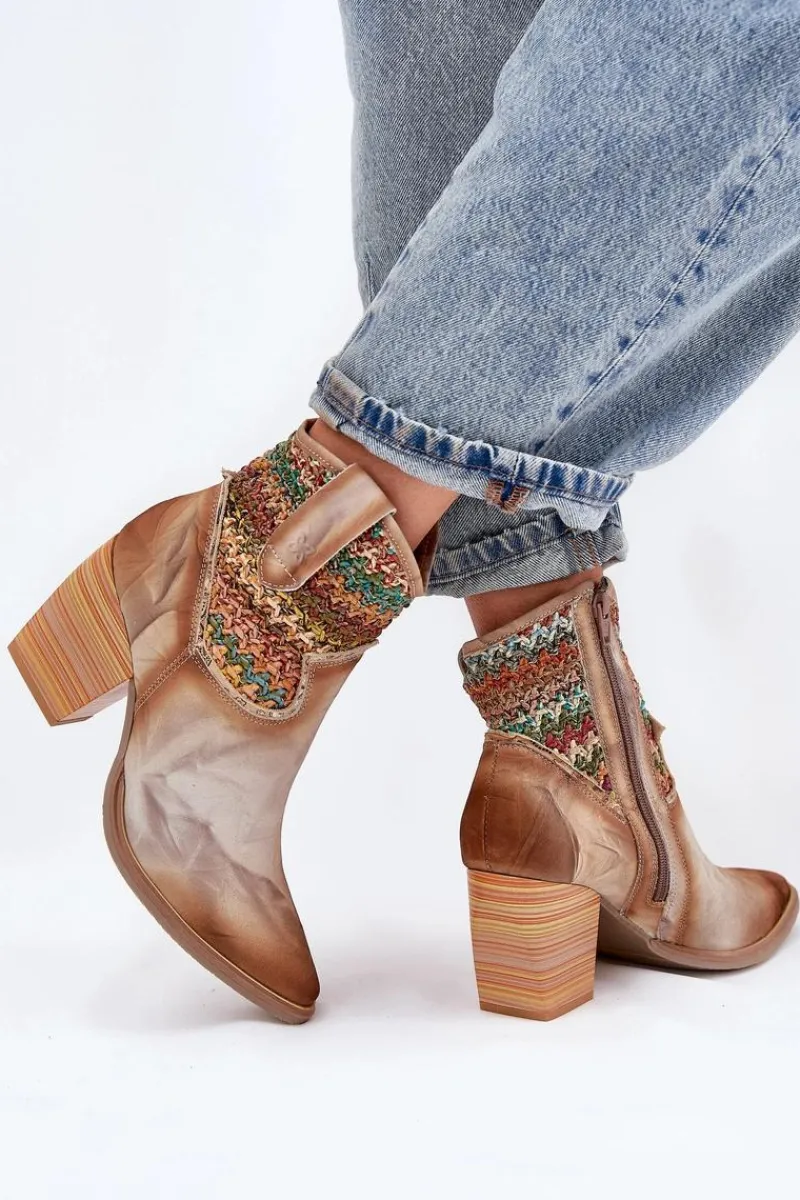 Skórzane botki kowbojki marki Maciejka to modny wybór dla osób ceniących styl i wygodę. Wykonane z wysokiej jakości skóry naturalnej, posiadają szpiczaste noski, które nadają im wyrazistego charakteru. Góra cholewki ozdobiona kolorową plecionką, która przyciąga wzrok i dodaje unikalnego akcentu. Zapinane na zamek, zapewniają łatwość zakładania i idealne dopasowanie. Te botki to doskonała propozycja do różnorodnych stylizacji, które łączą nowoczesność z klasyczną elegancją. Przy wyborze rozmiaru prosimy sugerować się tabelą rozmiarów.
