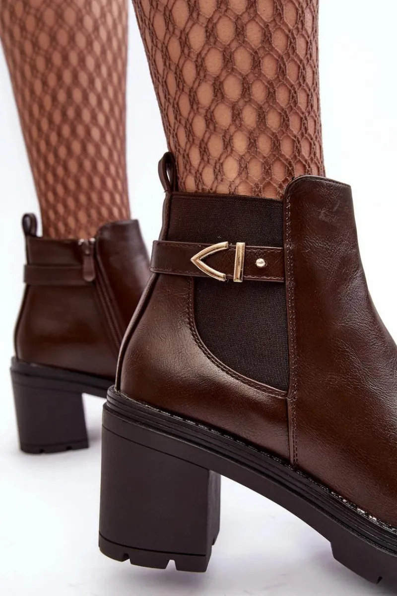 Damskie botki zostały wykonane z eko skóry. Osadzone na obcasie w postaci stabilnego, masywnego słupka. Cholewka została ozdobiona paskiem oraz elastyczną gumą pozwalającą na odpowiednie dopasowanie obuwia do tęgości nogi. Wewnątrz botki nie posiadają ocieplenia. Dodatkowo zapiętek jest usztywniony. Model ten posiada suwak z boku cholewki. Przy wyborze rozmiaru prosimy sugerować się tabelą rozmiarów.