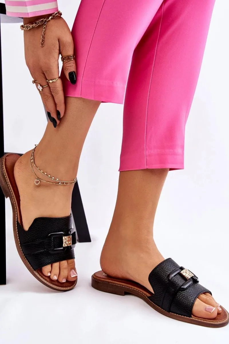 Eleganckie klapki od polskiej firmy Lewski Shoes. Buty wykonane są ze skóry naturalnej z dbałością o każdy detal. Posiadają ozdobę z tworzywa sztucznego na przodzie. Miękka wkładka jest niezwykle komfortowa podczas użytkowania. Klapki osadzono na płaskim obcasie. Koniecznie powinnaś sprawdzić całą naszą kolekcję butów marki Lewski Shoes! Przy wyborze rozmiaru prosimy sugerować się tabelą rozmiarów.
