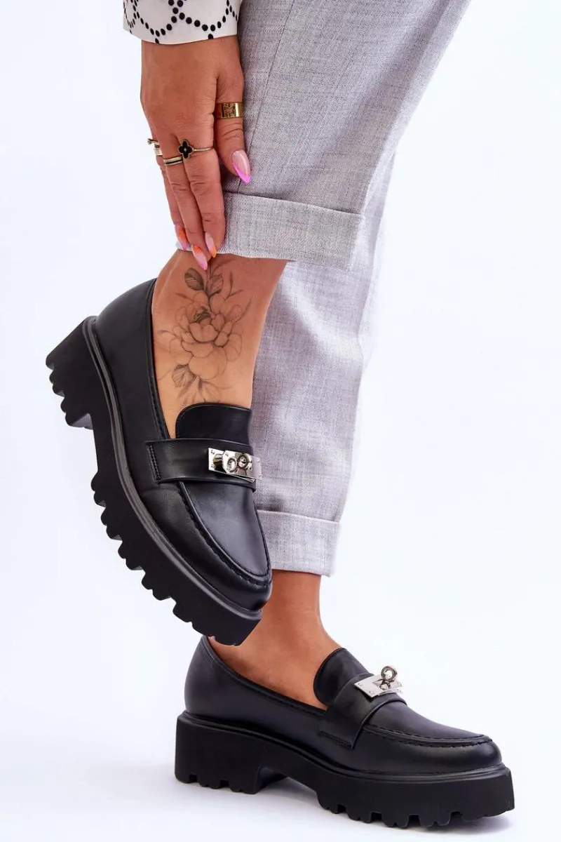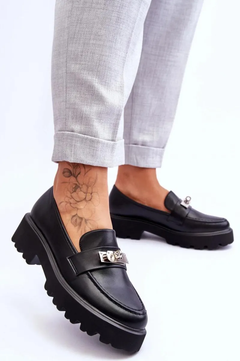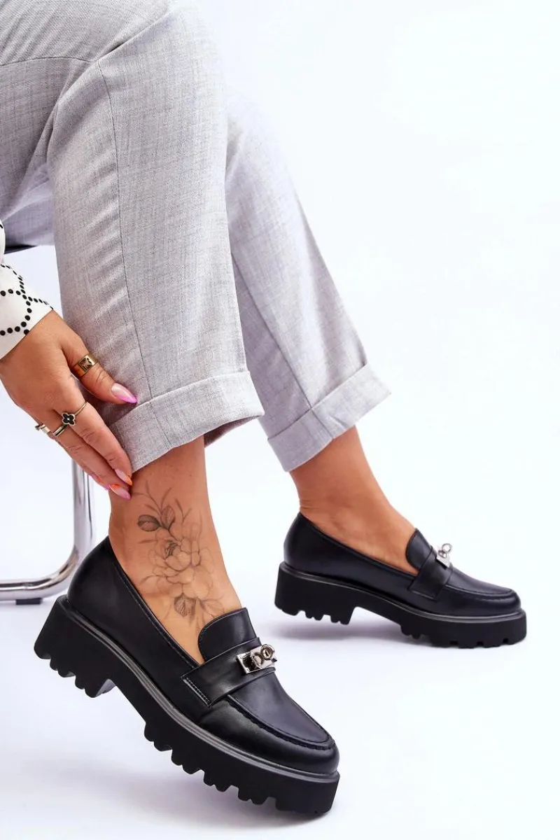 Mokasyny damskie zostały wykonane z eko skóry. Osadzono je na platformie i płaskim obcasie ze żłobieniami. Podeszwa została wykonana z tworzywa sztucznego. Miękka wkładka z eko skóry zapewni komfortowe użytkowanie. Mokasyny posiadają z przodu ozdobny element. Świetny model do wielu eleganckich i casualowych stylizacji. Przy wyborze rozmiaru prosimy sugerować się tabelą rozmiarów.