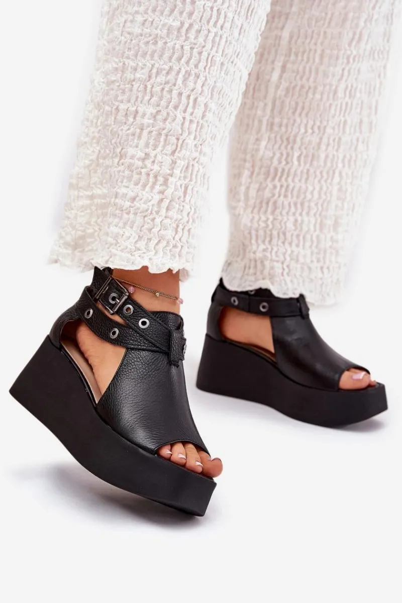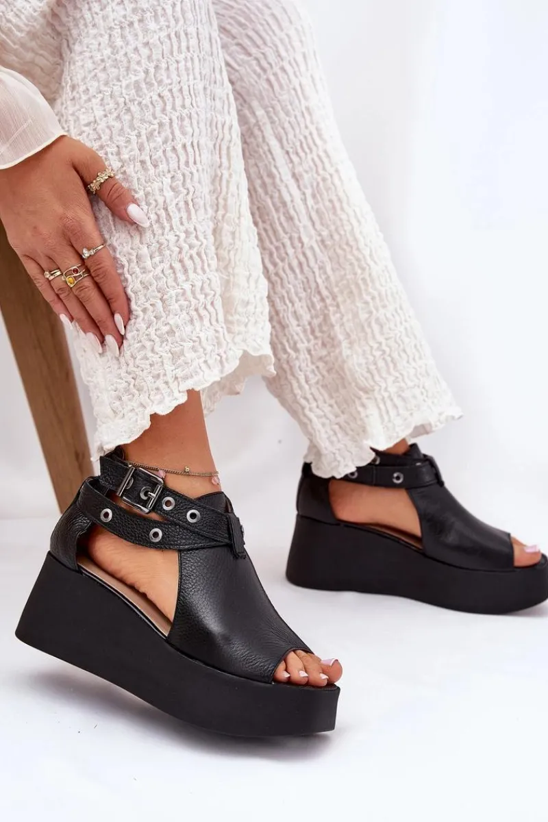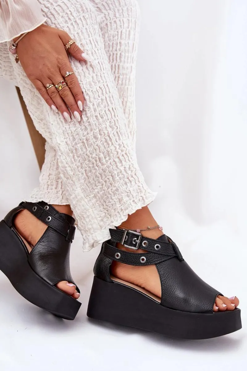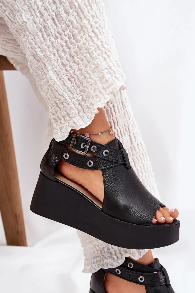 Sandały wykonane ze skóry naturalnej, są nie tylko stylowe, ale także trwałe i wygodne. Unikalny design dodaje uroku każdej letniej stylizacji, podkreślając indywidualny styl. Koturn wraz z platformą zapewniają dodatkową wysokość. Idealne dla kobiet, które cenią sobie modę i komfort w jednym! Przy wyborze rozmiaru prosimy kierować się tabelą rozmiarów.