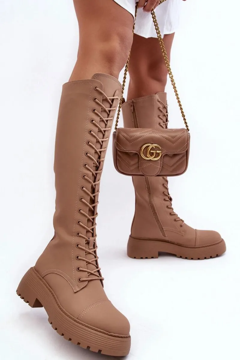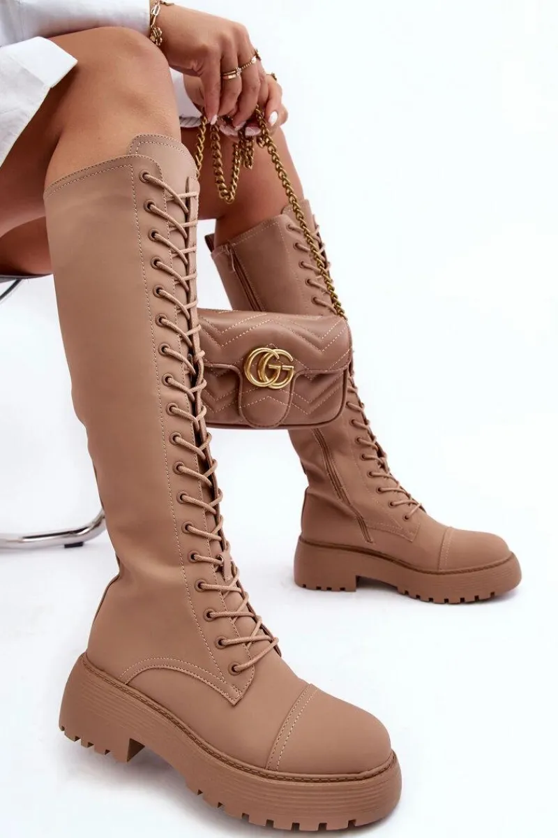 Damskie kozaki — glany posiadają sznurowanie oraz suwak na całości cholewki. Wykonane z eko skóry. Cholewka przed kolano. Środek ocieplony kocem obuwniczym. Model ten osadzony jest na płaskim obcasie i platformie. Przy wyborze rozmiaru prosimy kierować tabelą rozmiarów.