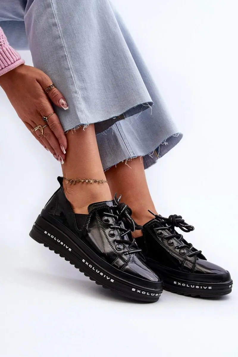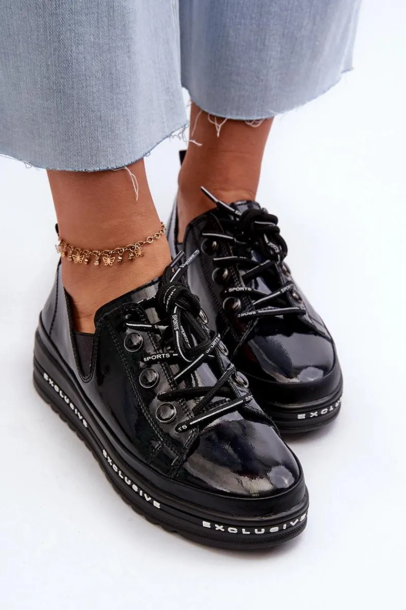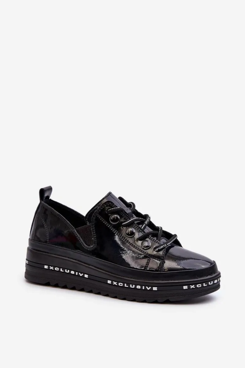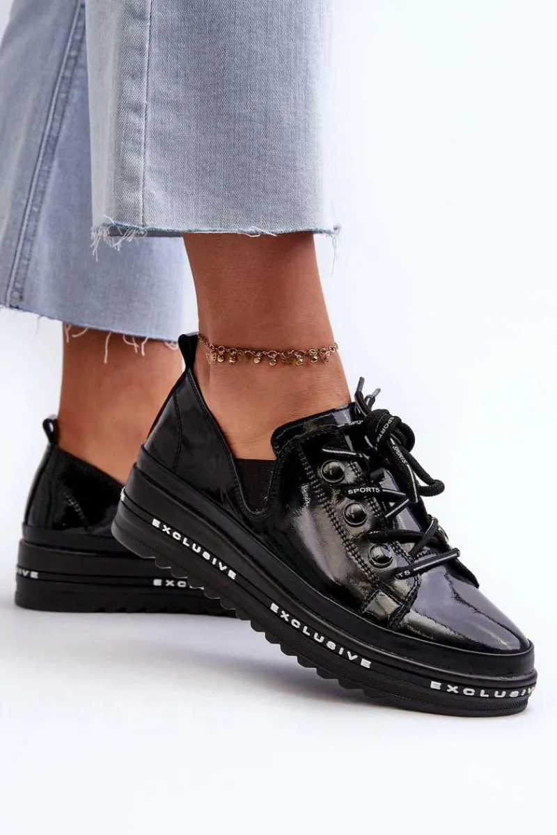Clearance Sznurowane Półbuty Damskie Na Platformie Skóra Naturalna S.Barski LR620 Czarne Damskie Półbuty Skórzane