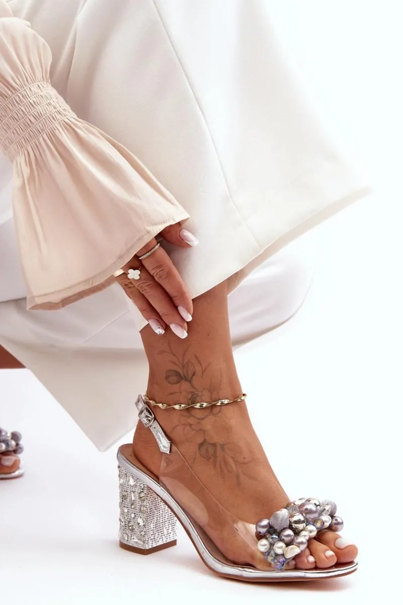 Stylowe sandały z transparentną cholewką zostały osadzone na błyszczącym, zdobionym obcasie. Miękka i profilowana wkładka wykonana ze skóry naturalnej. Z przodu na pasku znajdują się liczne zdobienia w postaci koralików. Ten modny fason sprawdzi się w wielu stylizacjach! Przy wyborze rozmiaru prosimy sugerować się tabelą rozmiarów.