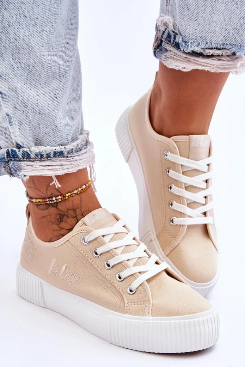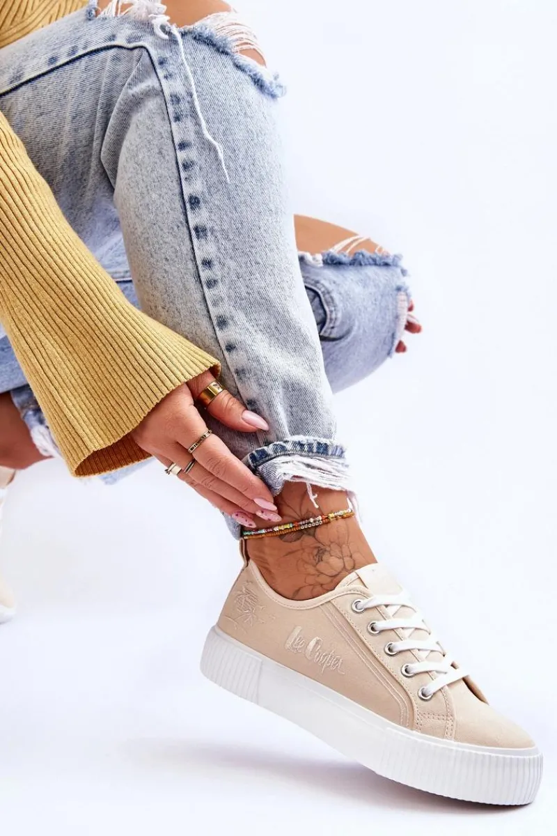 Trampki na masywnej platformie z antypoślizgową podeszwą marki Lee Cooper to odpowiedni wybór dla osób ceniących sobie wygodę oraz styl! Wykonane z materiału tekstylnego z wyszytą z boku cholewki wyspą z palmami i logiem marki Lee Cooper. Usztywniany zapiętek oraz klasyczne sznurowanie pozwoli na komfortowe użytkowanie obuwia. Przy wyborze rozmiaru prosimy sugerować się poniższą tabelą rozmiarów.