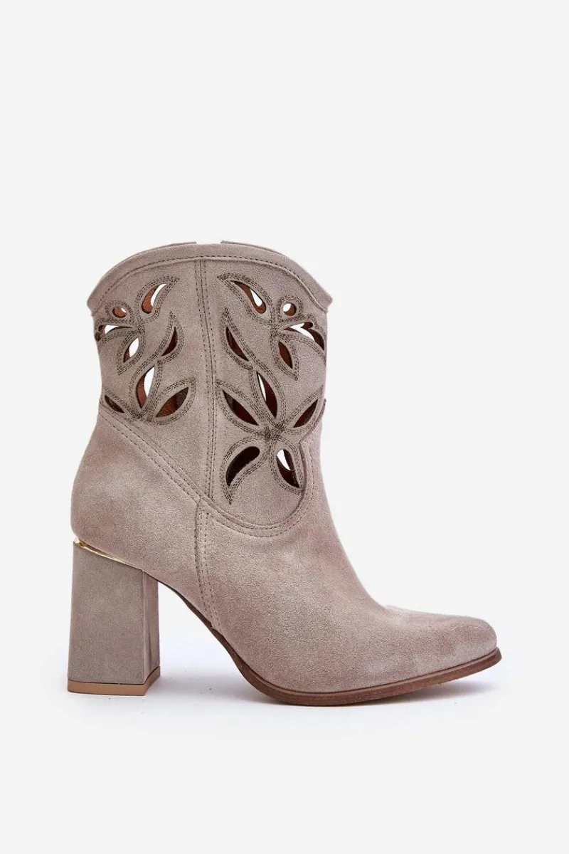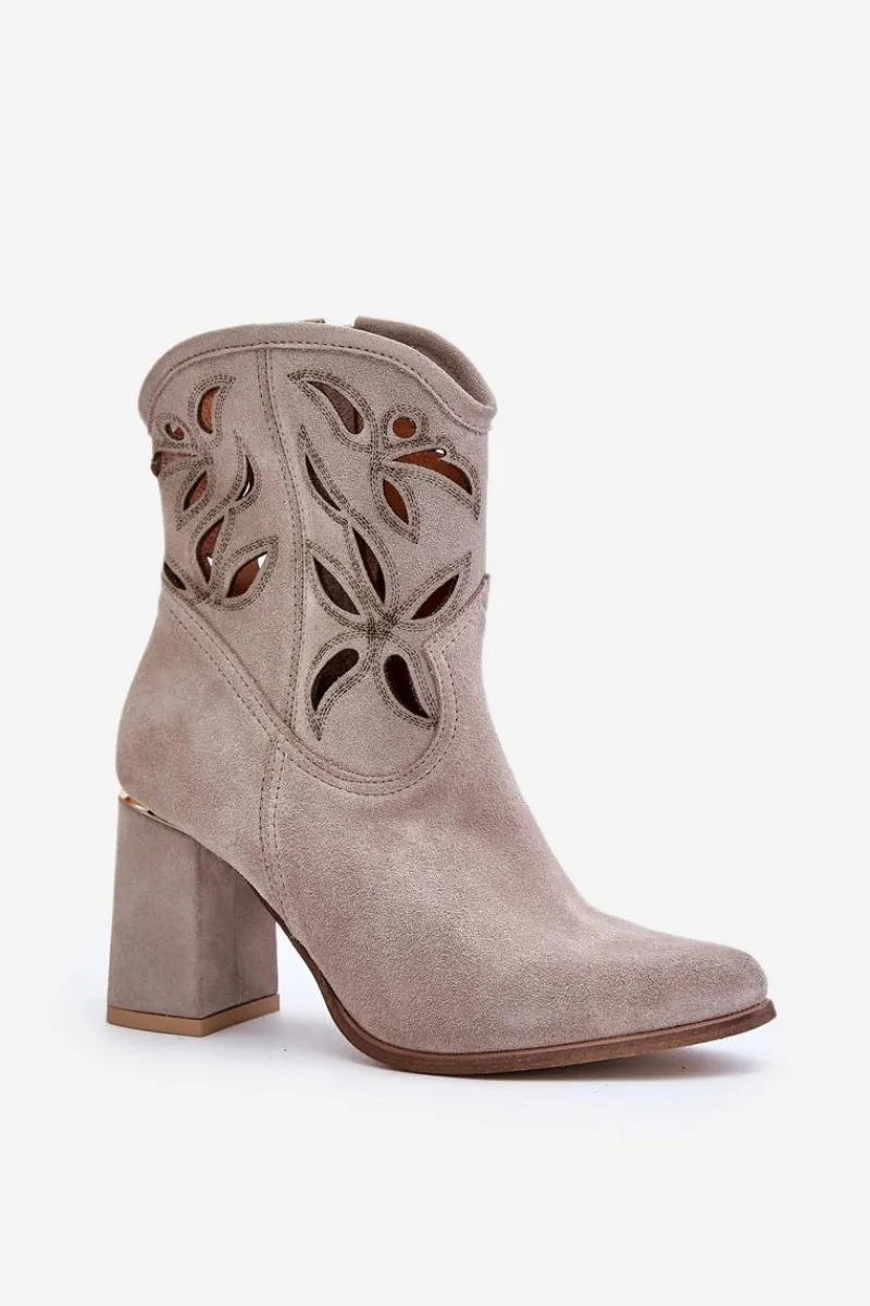 Modne, ażurowe botki na obcasie w postaci słupka. Wykonane z wysokiej jakości naturalnego zamszu. Głównym atutem tego modelu jest ażurowy wzór na cholewce. Zapinane na zamek błyskawiczny. Noski w szpic optycznie wysmuklą nogi. Miękka, niezwykle wygodna wkładka została wykonana z naturalnej skóry. Świetny model do wielu stylizacji! Przy wyborze rozmiaru prosimy sugerować się tabelą rozmiarów.
