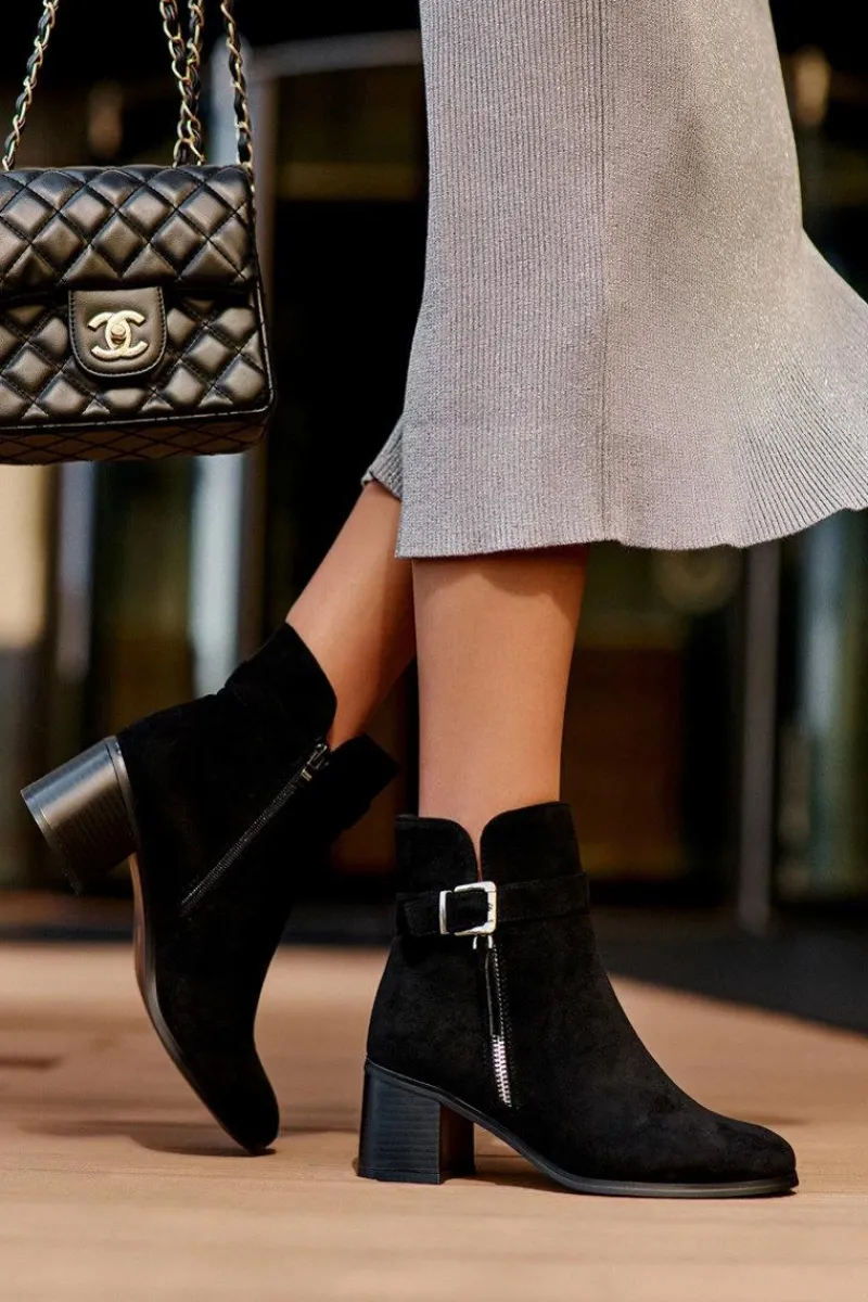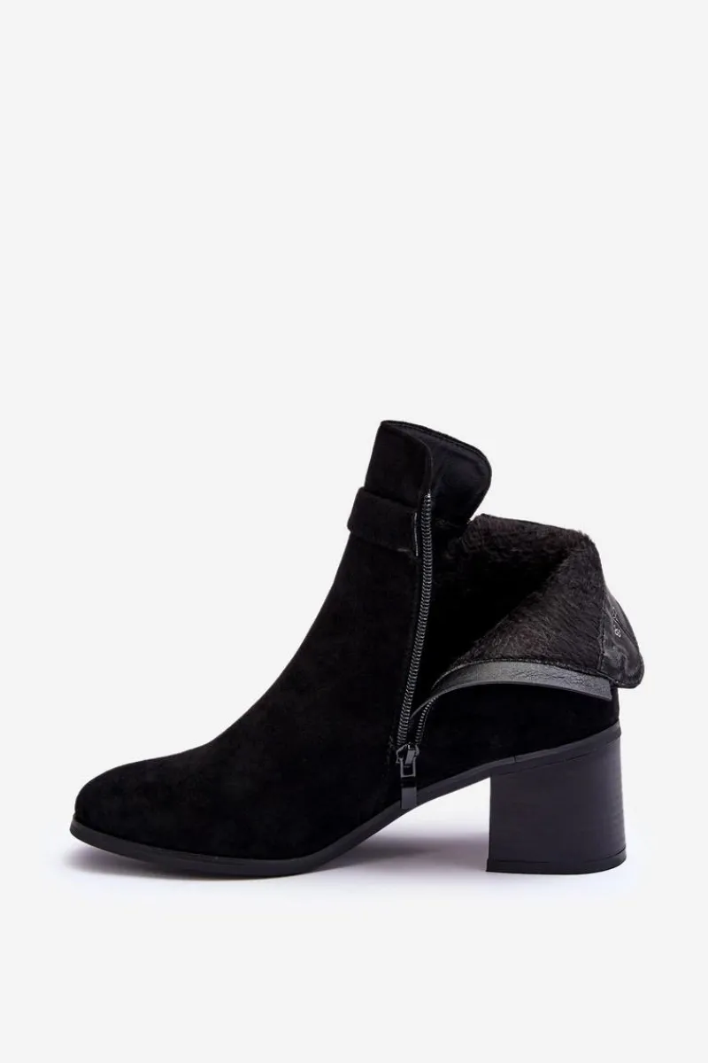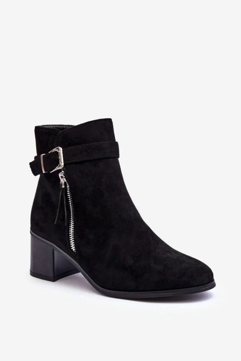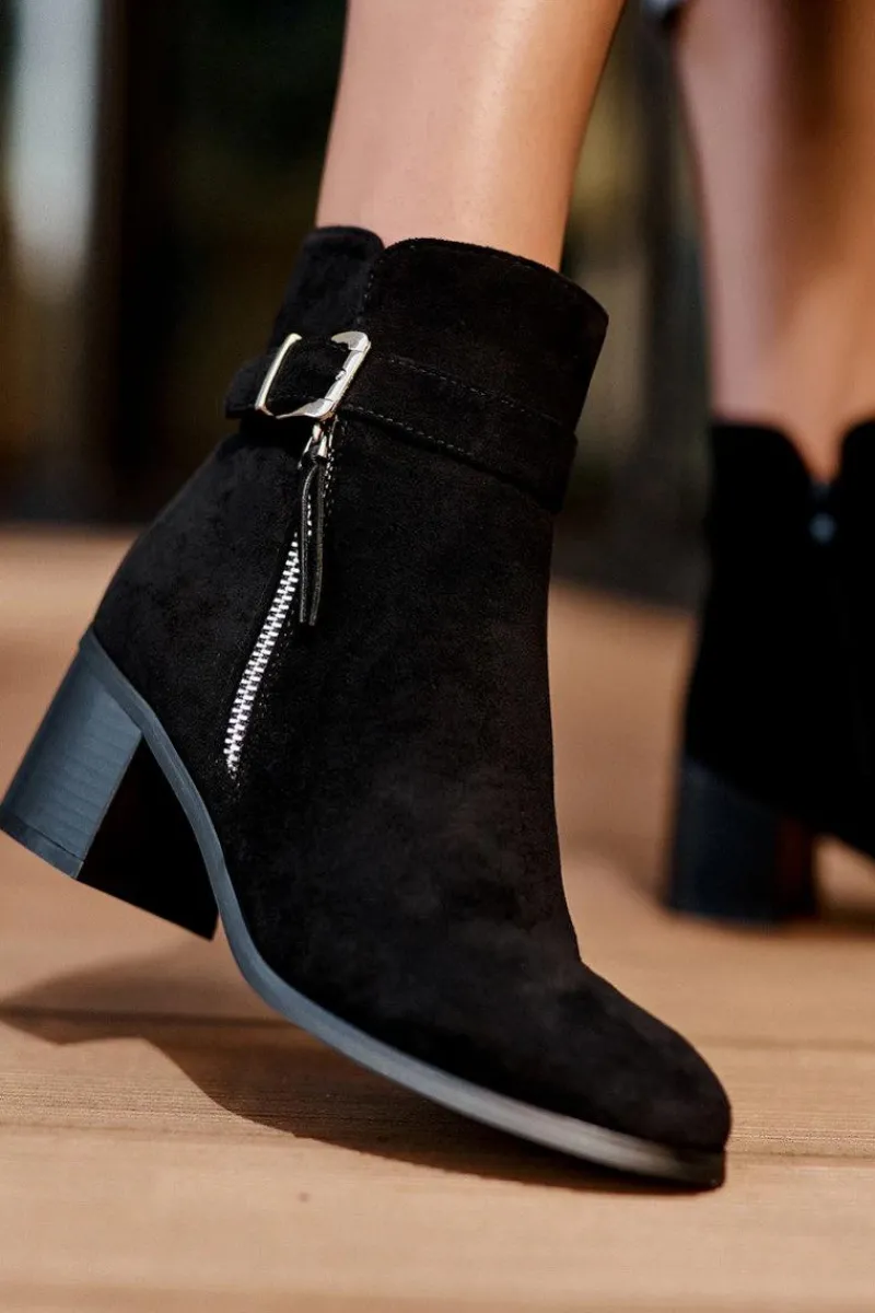Botki damskie wykonane z miłego w dotyku eko zamszu. Zapinane na suwak. Cholewka ozdobiona cienkim paskiem z klamrą oraz dodatkowym suwakiem. Zapiętek w tym obuwiu jest usztywniony. Wnętrze ocieplone kocem obuwniczym. Idealne do wielu stylizacji! Koniecznie sprawdź także pozostałe modele botków dostępnych w naszej ofercie. Przy wyborze rozmiaru prosimy sugerować się tabelą rozmiarów.