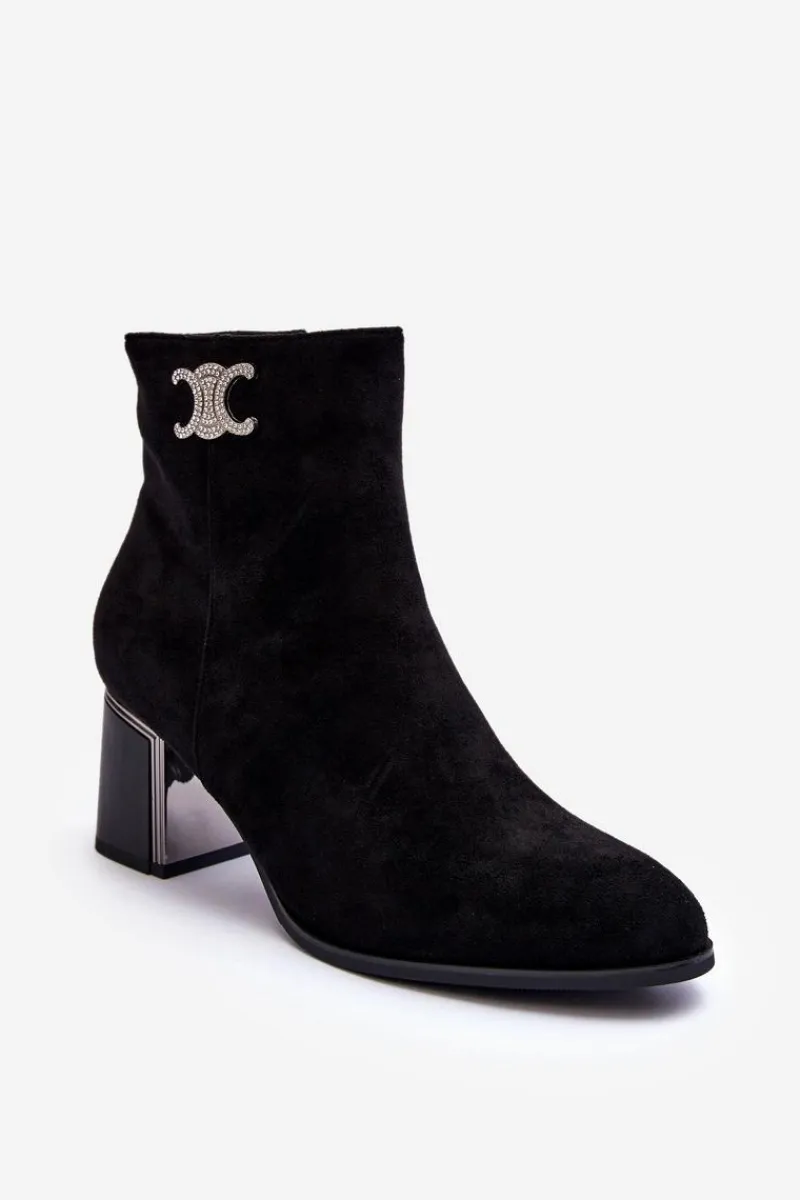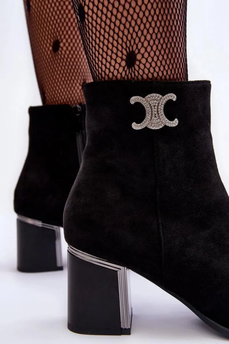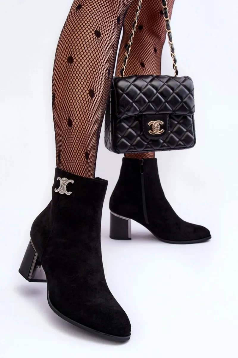 Damskie botki z cholewką za kostkę. Wykonane z miłego w dotyku eko zamszu. Osadzone na obcasie w postaci stabilnego słupka. Zapinane na suwak po wewnętrznej stronie. Na obcasie znajduje się lustrzany element oraz biżuteryjna ozdoba na górze cholewki. Zapiętek usztywniony, wnętrze ocieplone kocem obuwniczym. Przy wyborze rozmiaru prosimy sugerować się tabelą rozmiarów.