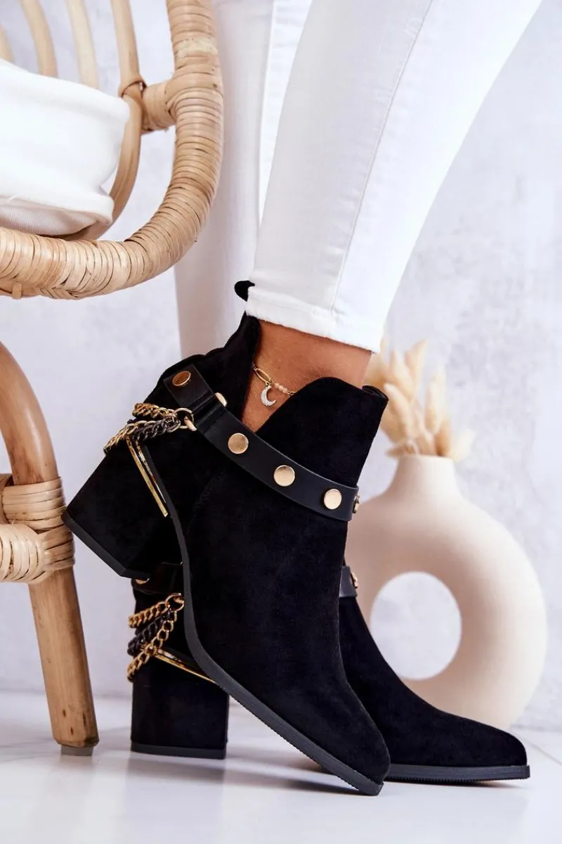 Cudowne botki, które idealnie sprawdzą się w sezonie wiosenno-jesiennym. Wykonane z delikatnego eko zamszu. Posiadają krótki suwak z wewnętrznej strony. Ozdobny pasek z łańcuszkami jest zapinany na napę i można go w każdej chwili odpiąć. Dwa modele w jednym! Fason kowbojek świetnie będzie komponował się z wieloma stylizacjami. Stabilny obcas w postaci szerokiego słupka delikatnie uniesie Twoją sylwetkę. Przy wyborze rozmiaru prosimy sugerować się tabelą rozmiarów.