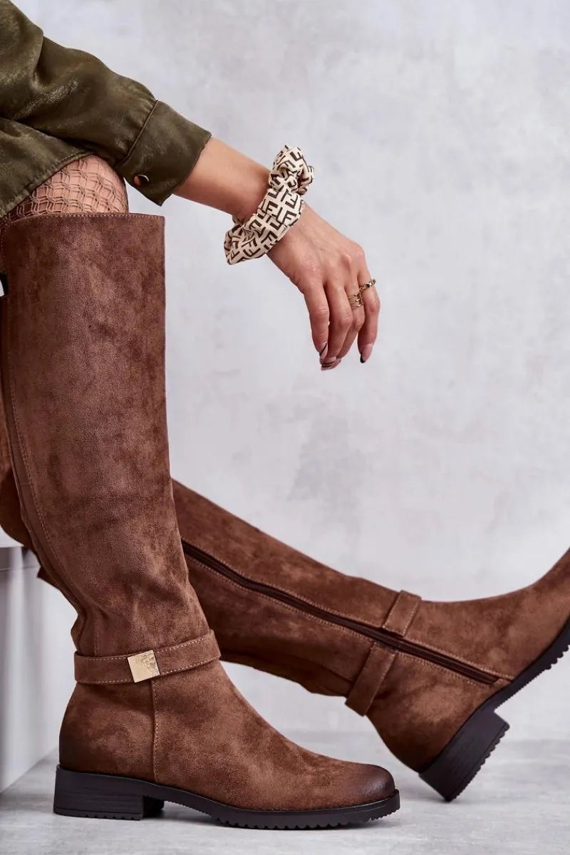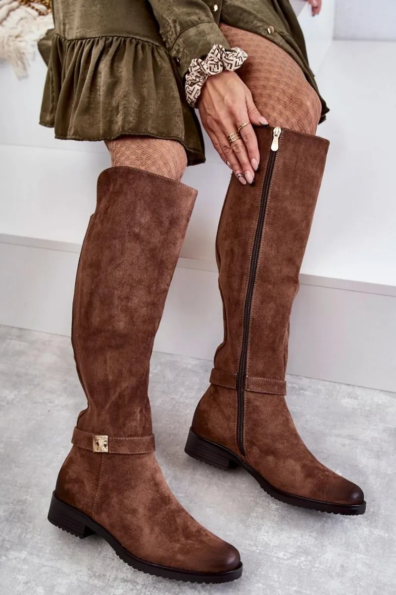 Klasyczne, damskie kozaki zostały wykonane z eko skórzanych materiałów z dbałością o szczegóły. Model ten posiada suwak na całej długości cholewki. Kozaki osadzono na płaskim obcasie. Nie posiadają ocieplenia. Dodatkowo zapiętek jest usztywniany. Cholewka przyozdobiona paskiem z metalową blaszką. Cholewka u góry posiada nieregularne zakończenie. Przy wyborze rozmiaru prosimy sugerować się tabelą rozmiarów.
