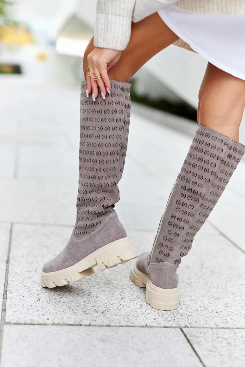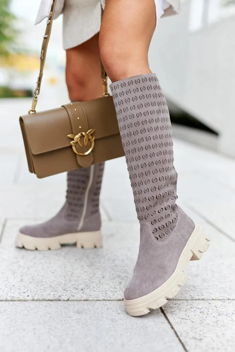 Piękne zamszowe kozaki damskie wykonane zostały ze skóry naturalnej. Na wysokości cholewki występują ażurowe wzorki. Kozaki posiadają grubą, stabilną podeszwę. Suwak ułatwia zakładanie. Idealnie będą się prezentować z sukienkami, jak i dłuższymi spódnicami. Nie czekaj i zakup już dziś! Przy wyborze rozmiaru prosimy sugerować się tabelą rozmiarów.