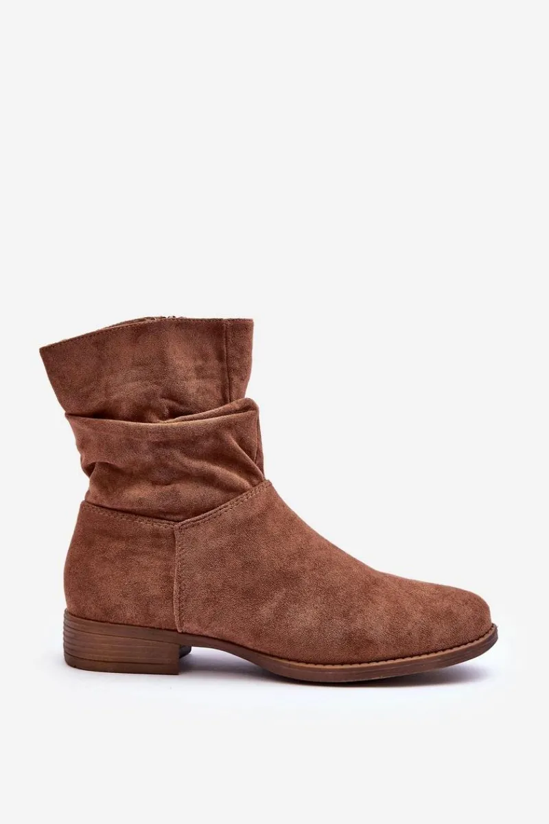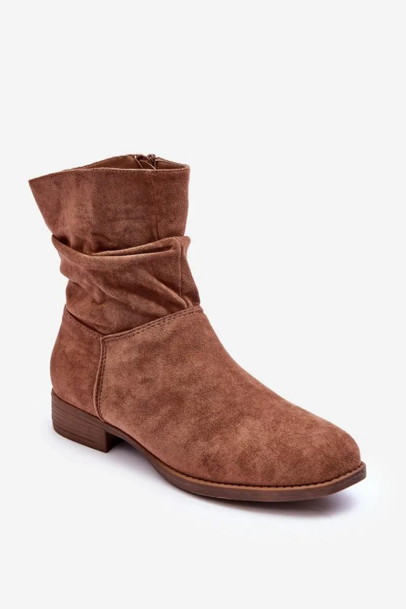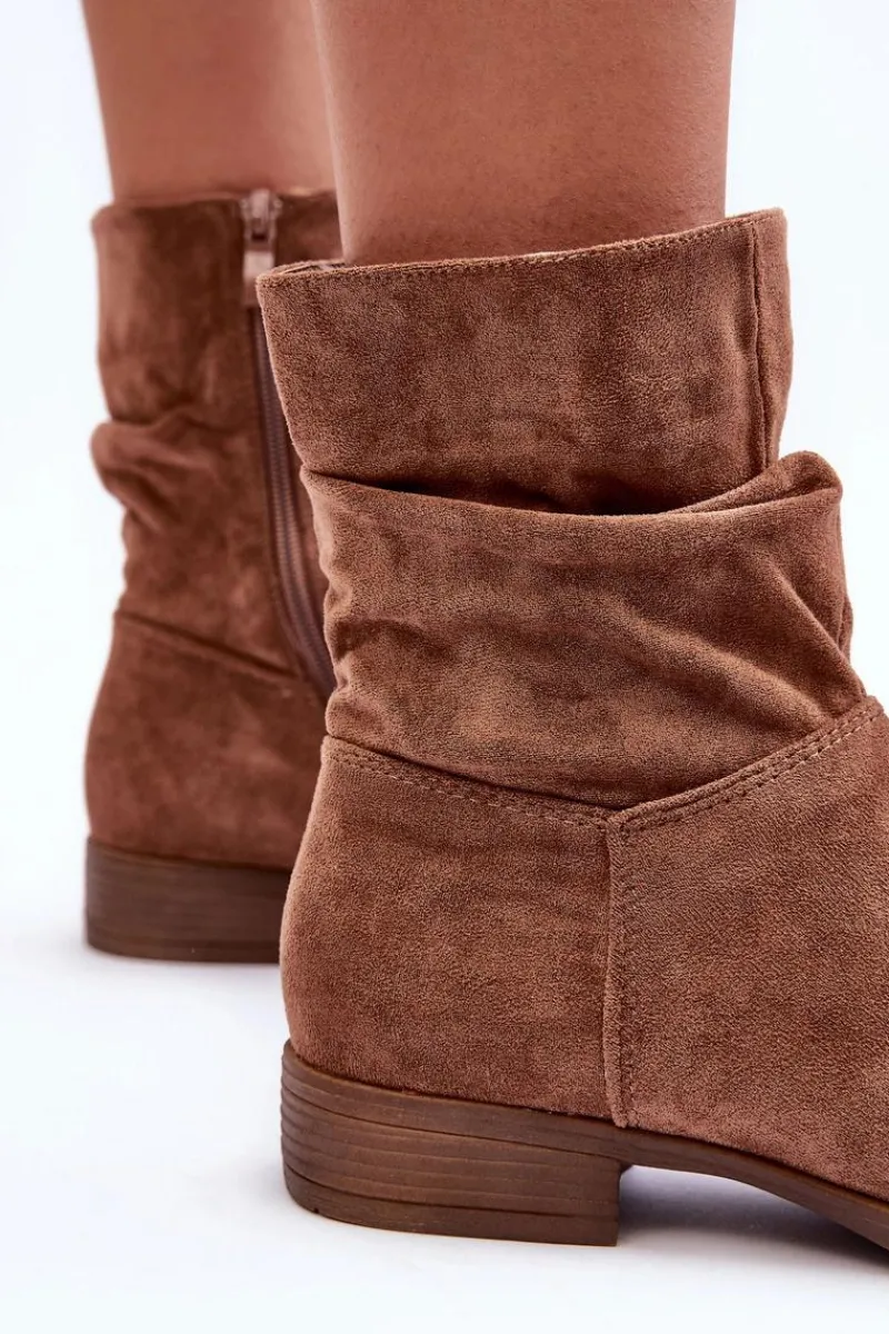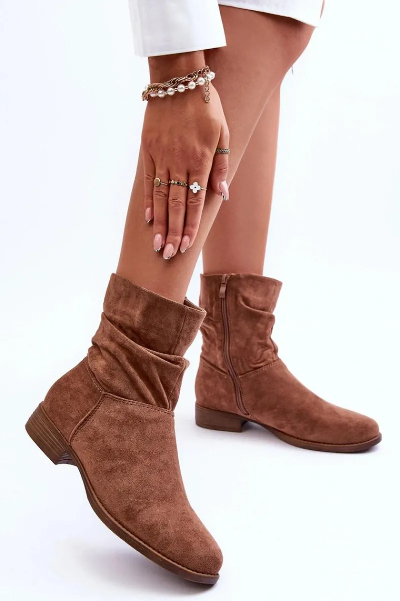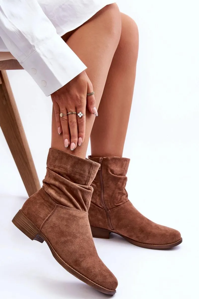 Botki damskie osadzone na płaskim obcasie, z marszczoną cholewką. Wykonane z eko zamszu. Zapinane na suwak z boku. Model ten posiada usztywniany, zapiętek, co zwiększy stabilizację stopy. Koniecznie powinnaś mieć je w swojej szafie! Przy wyborze rozmiaru prosimy sugerować się tabelą rozmiarów.