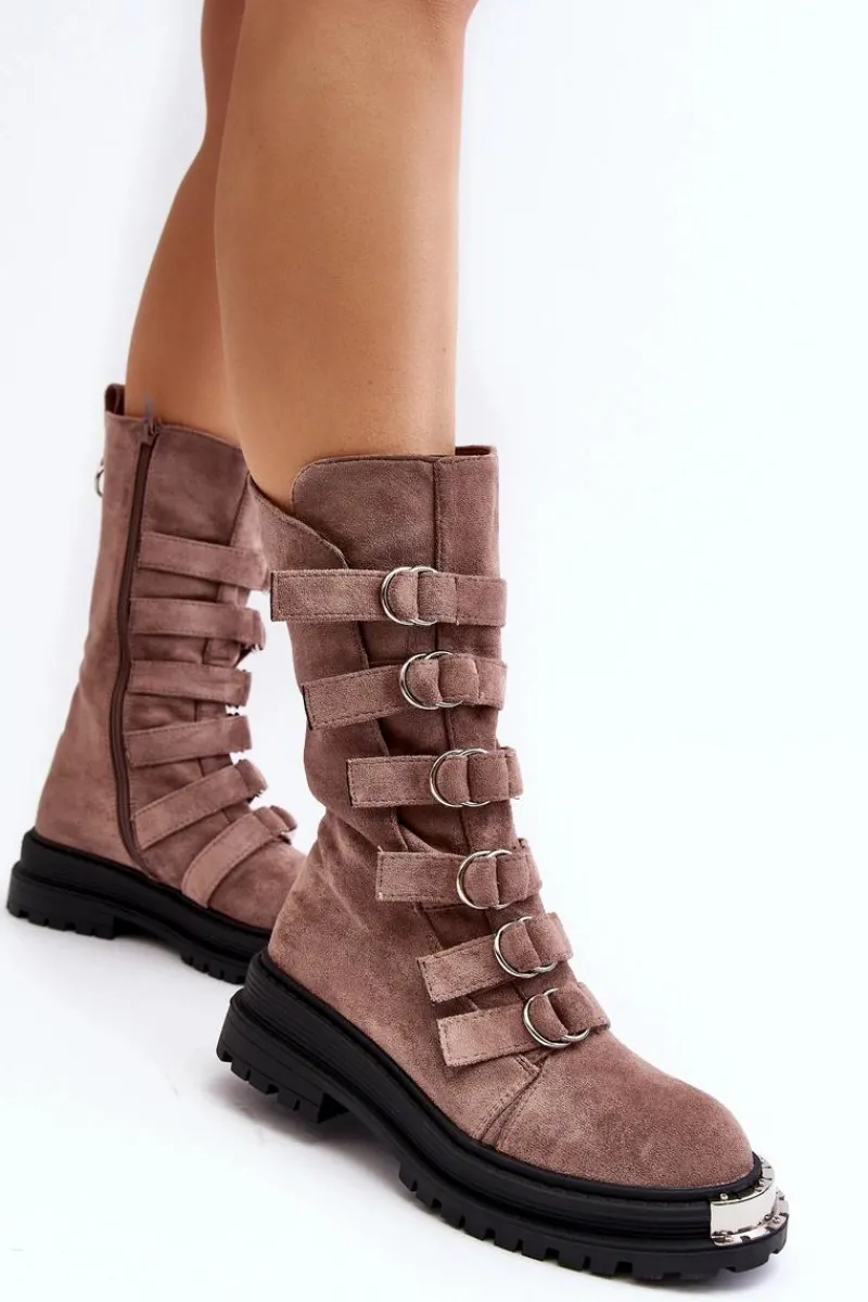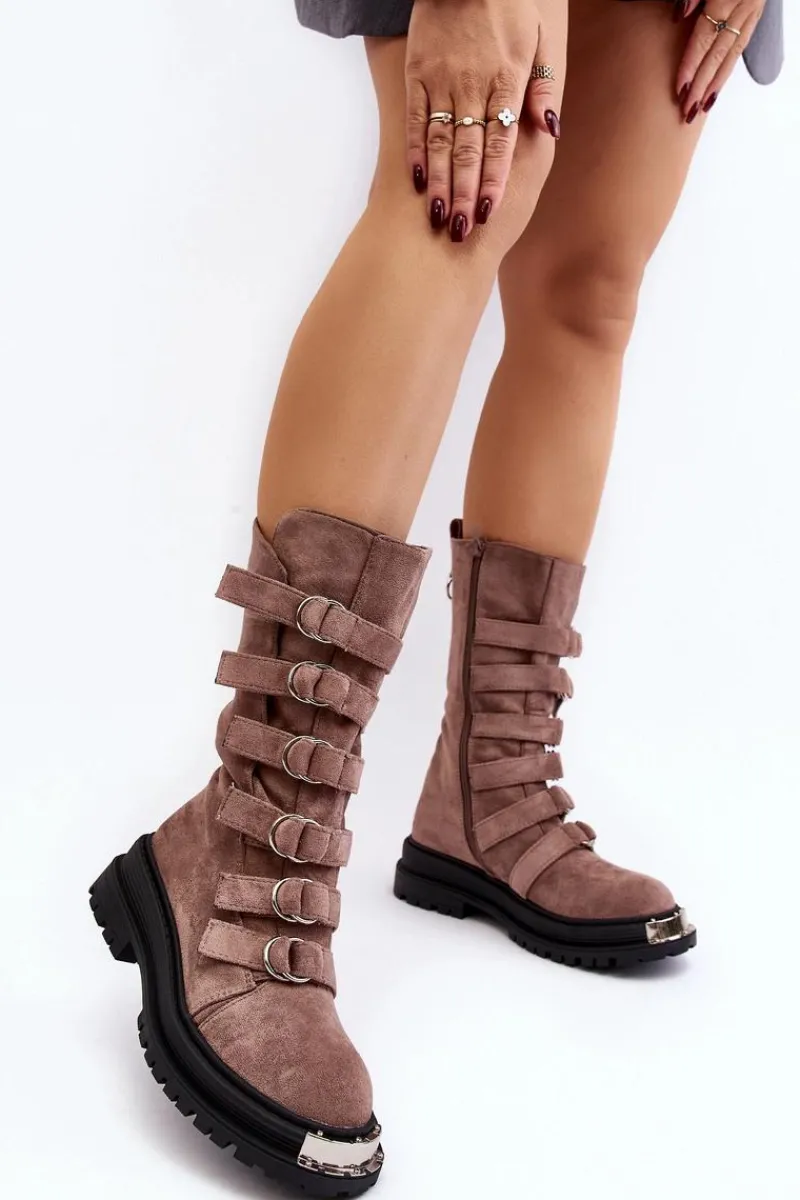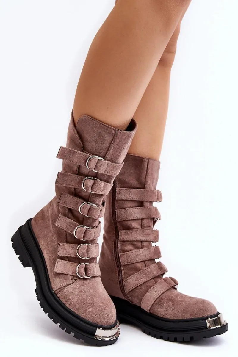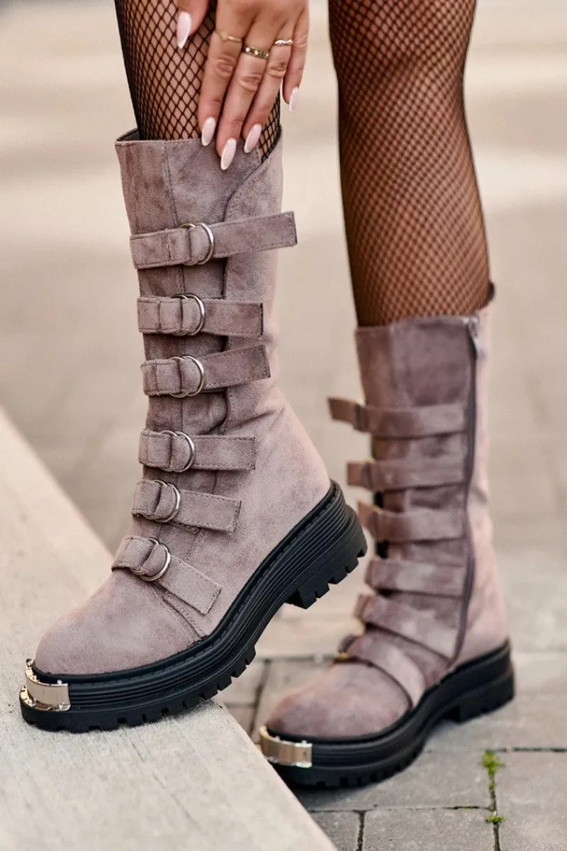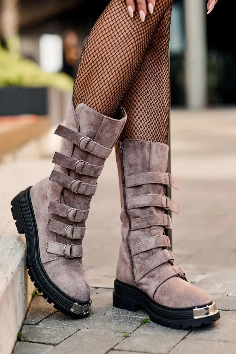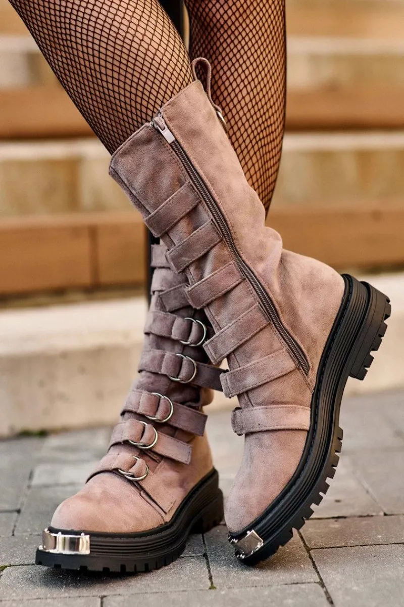 Wysokie workery damskie osadzone na płaskim obcasie oraz platformie. Zapinane na suwak po wewnętrznej stronie cholewki. Wykonane z eko zamszu. Noski zaokrąglone. Z przodu regulowane paseczki. Usztywniony zapiętek pozwoli na odpowiednią stabilizację stopy. Środek ocieplony kocem obuwniczym. Przy wyborze rozmiaru prosimy sugerować się tabelą rozmiarów.