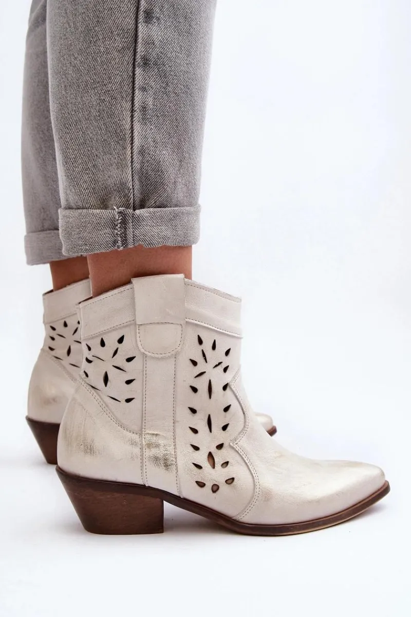 Damskie botki w stylu kowbojek zostały wykonane ze skóry naturalnej. Osadzone na niskim obcasie, który gwarantuje stabilność na każdym kroku. Noski w szpic optycznie wysmuklą nogi. Model wsuwany. Cholewka za kostkę. Przy wyborze rozmiaru prosimy sugerować się tabelą rozmiarów.