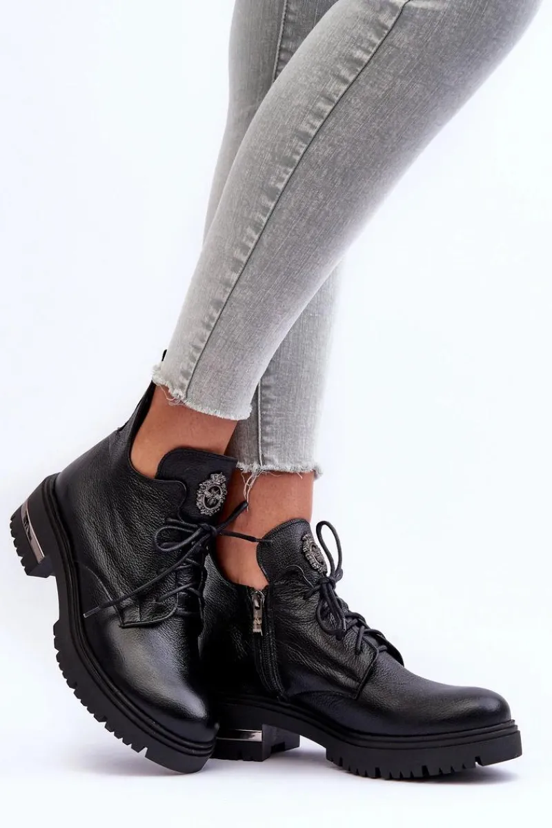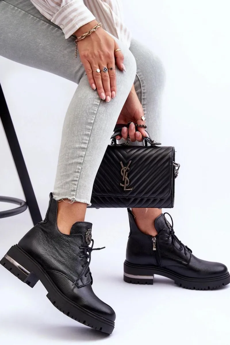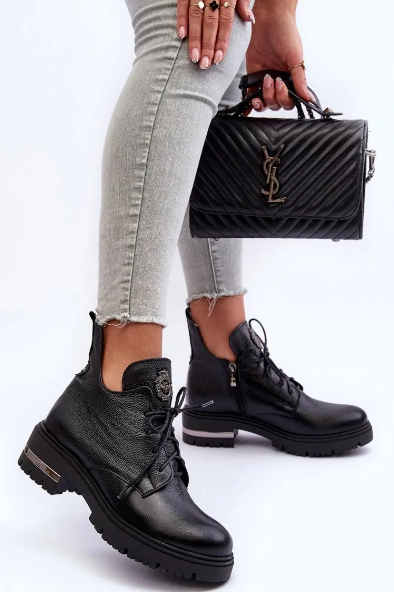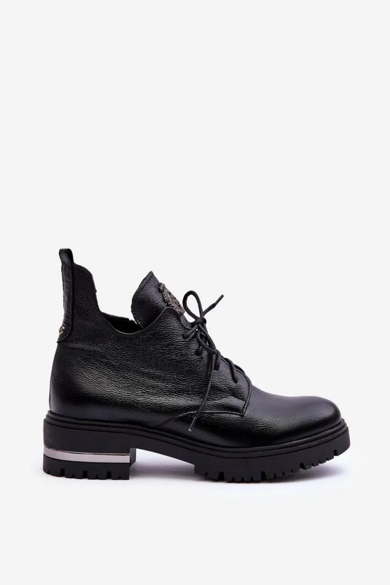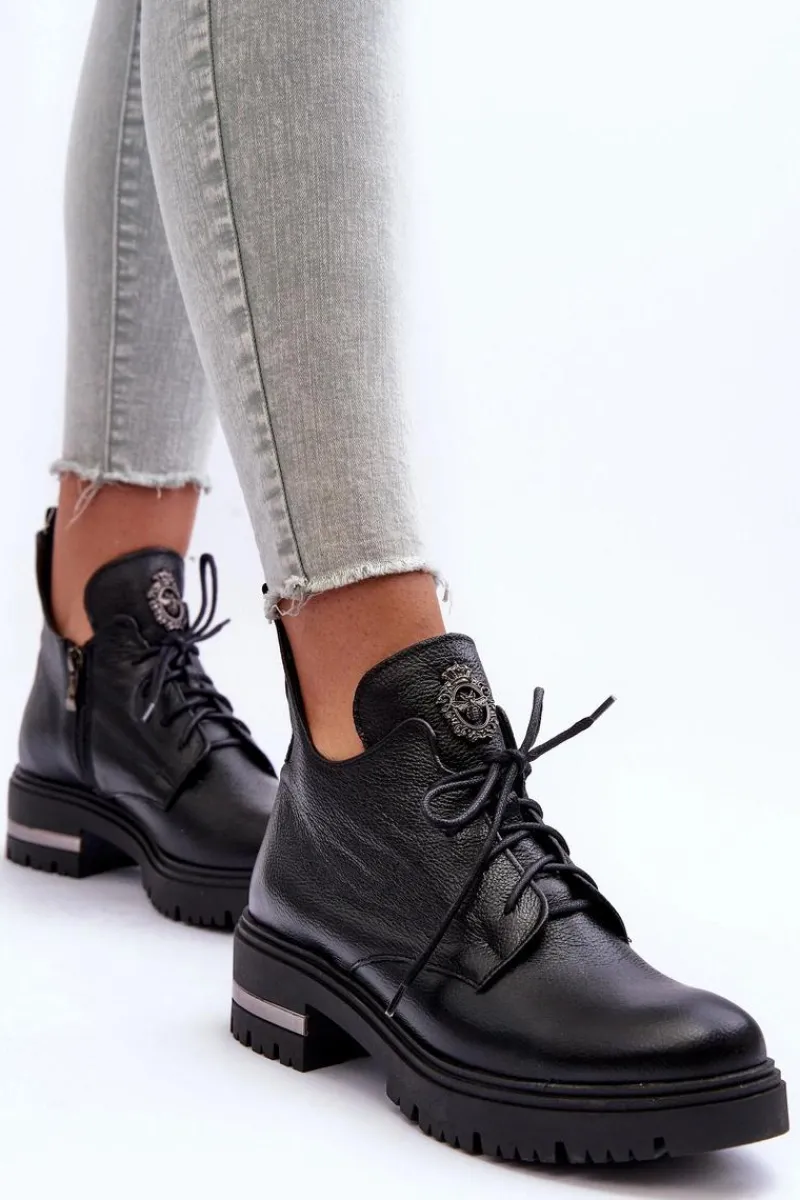 Modne botki z ozdobą na języku. Zostały wykonane z wysokiej jakości naturalnej skóry. Botki zapinane na suwak oraz sznurowane. Nieregularna cholewka świetnie podkreśli wiele stylizacji! Botki osadzono na płaskim obcasie i platformie. Ocieplone kocem obuwniczym. Miękka wkładka zapewni komfort podczas użytkownia. Przy wyborze rozmiaru prosimy sugerować się tabelą rozmiarów.