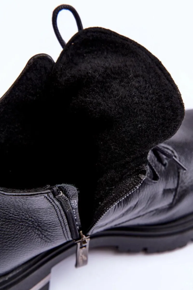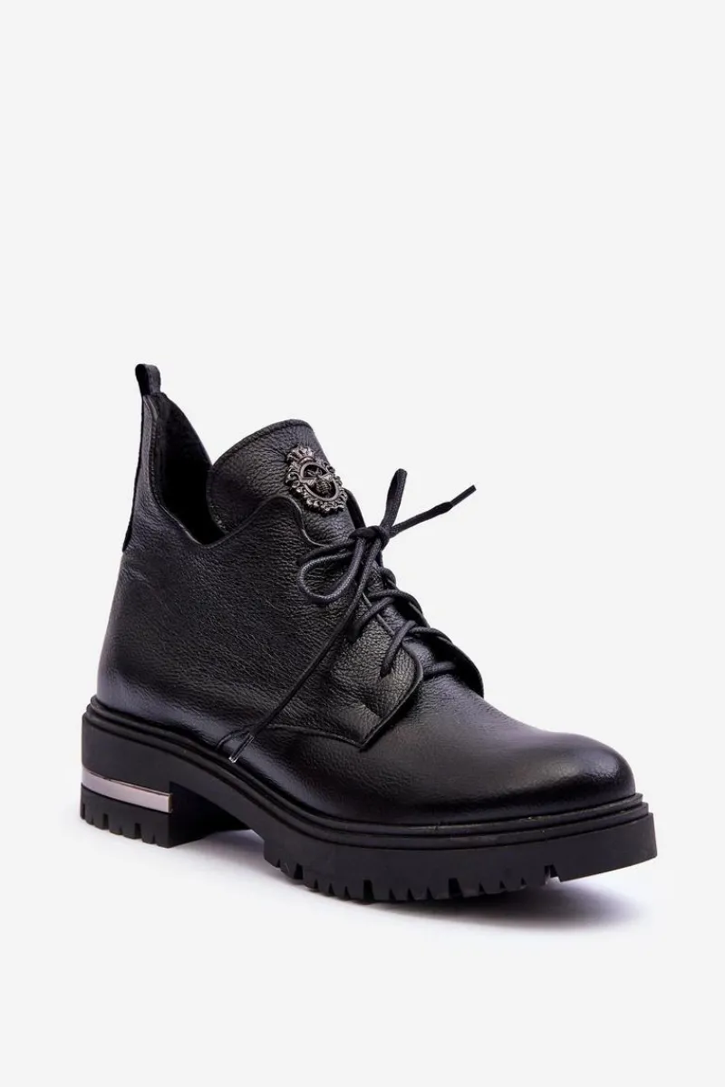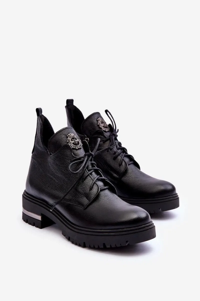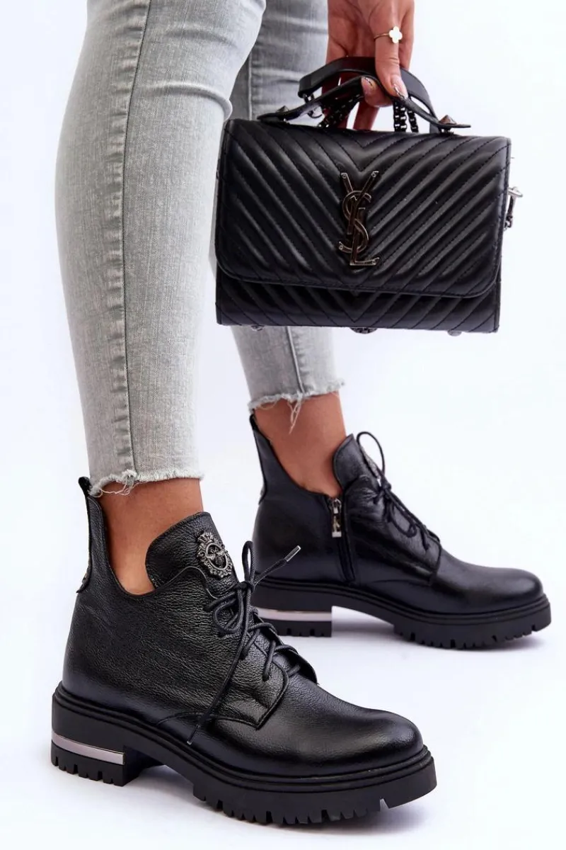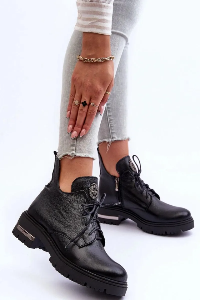 Modne botki z ozdobą na języku. Zostały wykonane z wysokiej jakości naturalnej skóry. Botki zapinane na suwak oraz sznurowane. Nieregularna cholewka świetnie podkreśli wiele stylizacji! Botki osadzono na płaskim obcasie i platformie. Ocieplone kocem obuwniczym. Miękka wkładka zapewni komfort podczas użytkownia. Przy wyborze rozmiaru prosimy sugerować się tabelą rozmiarów.