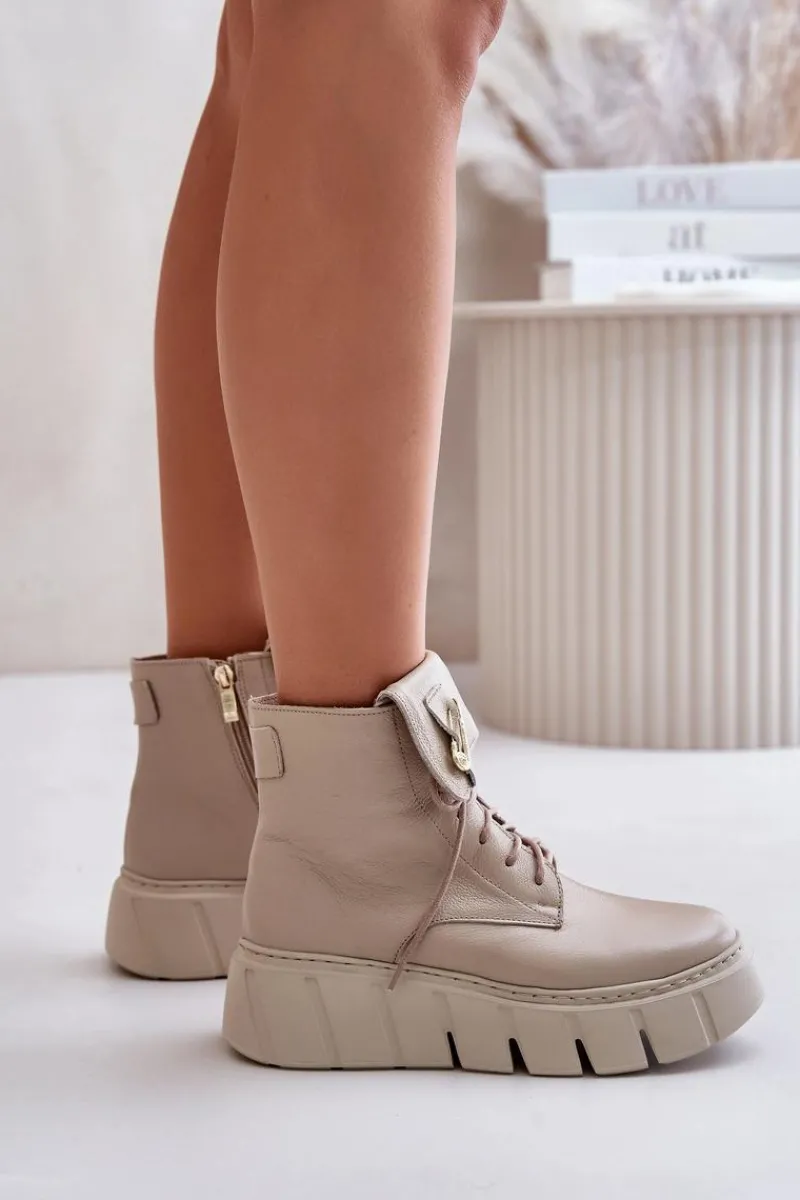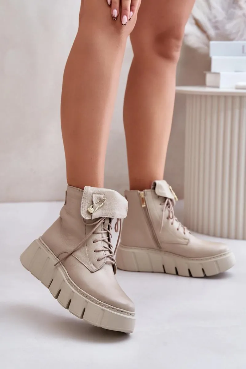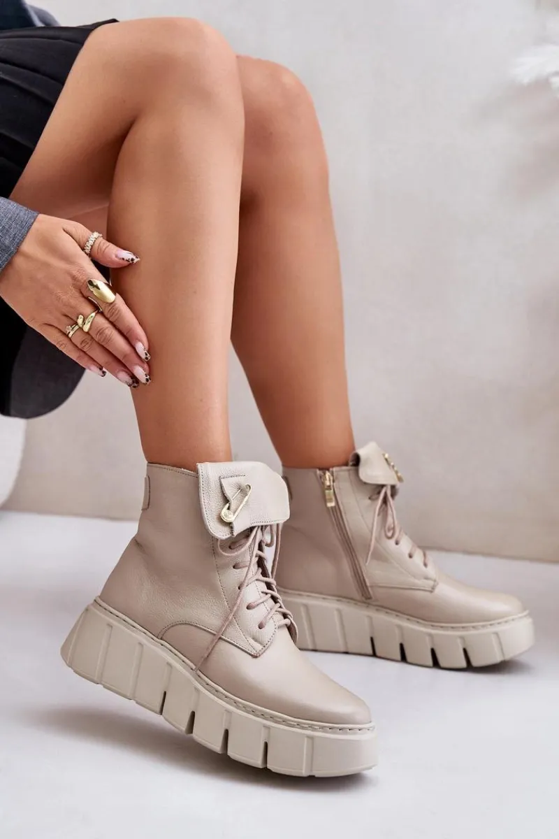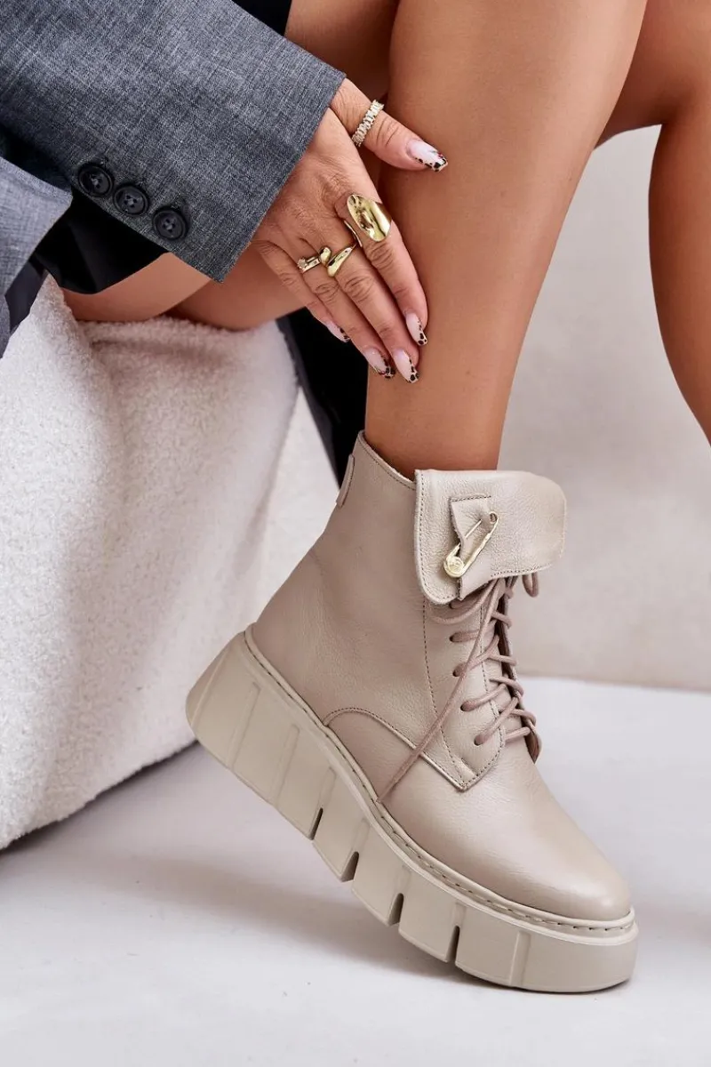 Damskie botki ze skóry naturalnej na platformie to idealne połączenie stylu i funkcjonalności. Posiadają zarówno sznurowanie, jak i zamek, co zapewnia wygodę zakładania i dopasowanie do stopy. Zaokrąglone noski dodają subtelności, a ozdoba w postaci agrafki wprowadza unikalny akcent. Wnętrze ocieplone kocem obuwniczym gwarantuje ciepło i komfort, sprawiając, że są doskonałym wyborem na chłodniejsze dni. Przy wyborze rozmiaru prosimy kierować się tabelą rozmiarów